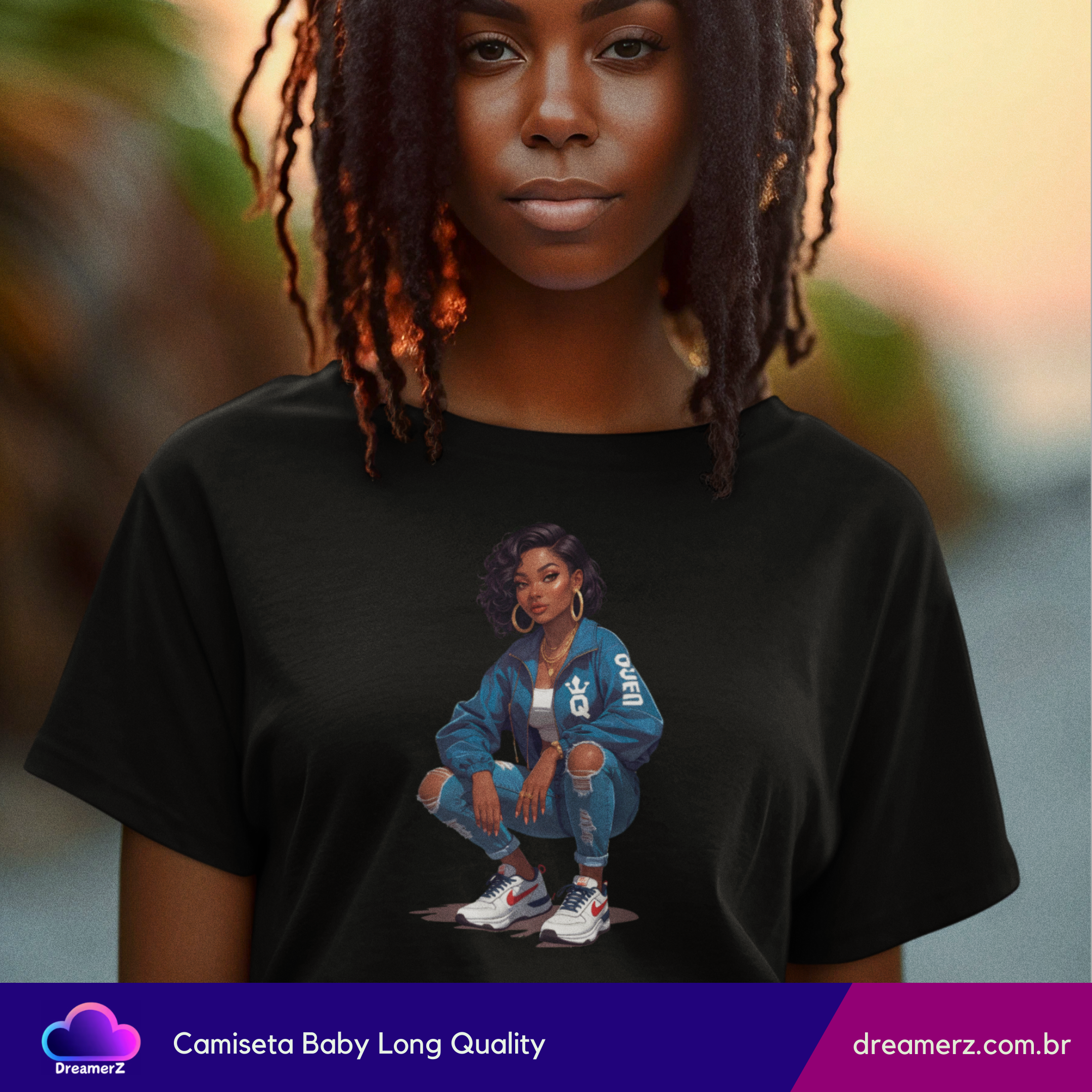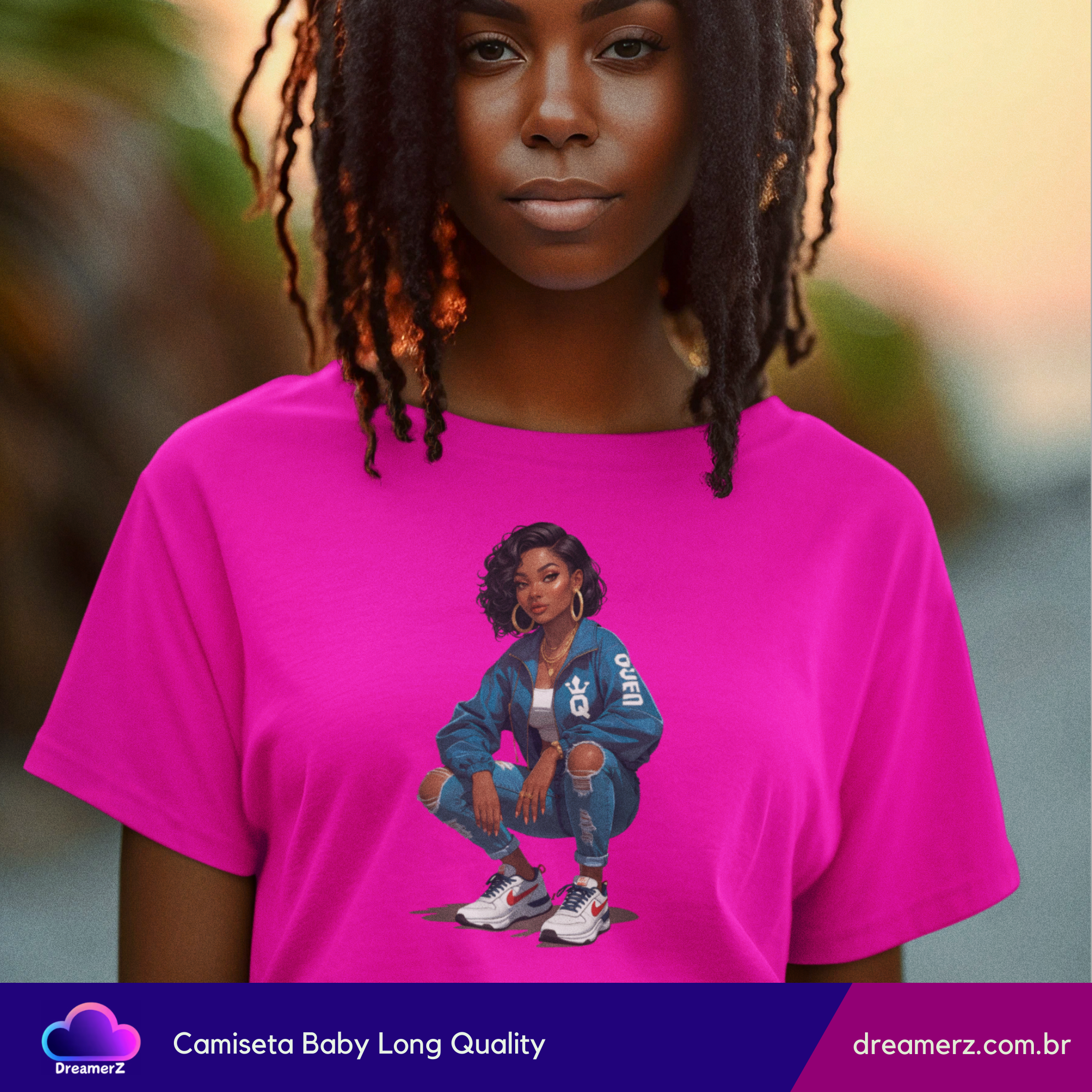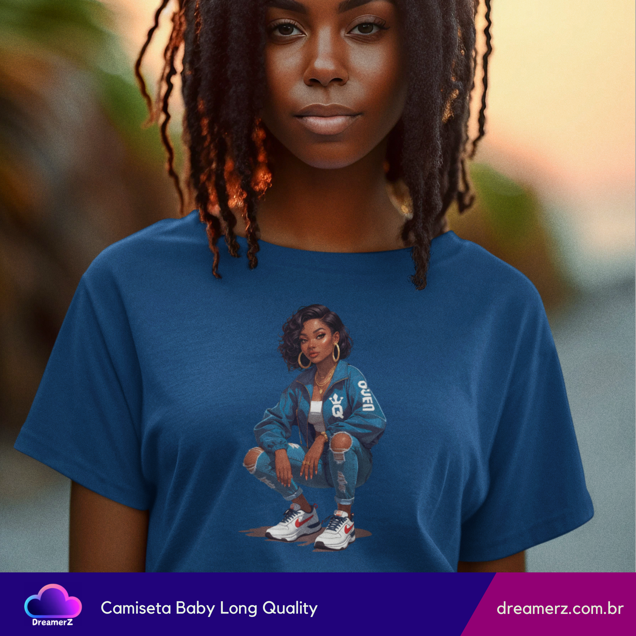 Quem disse que conforto e atitude não andam juntos? Essa camiseta traz uma estampa marcante de uma mulher com estilo streetwear, transbordando confiança, poder e muita autenticidade.