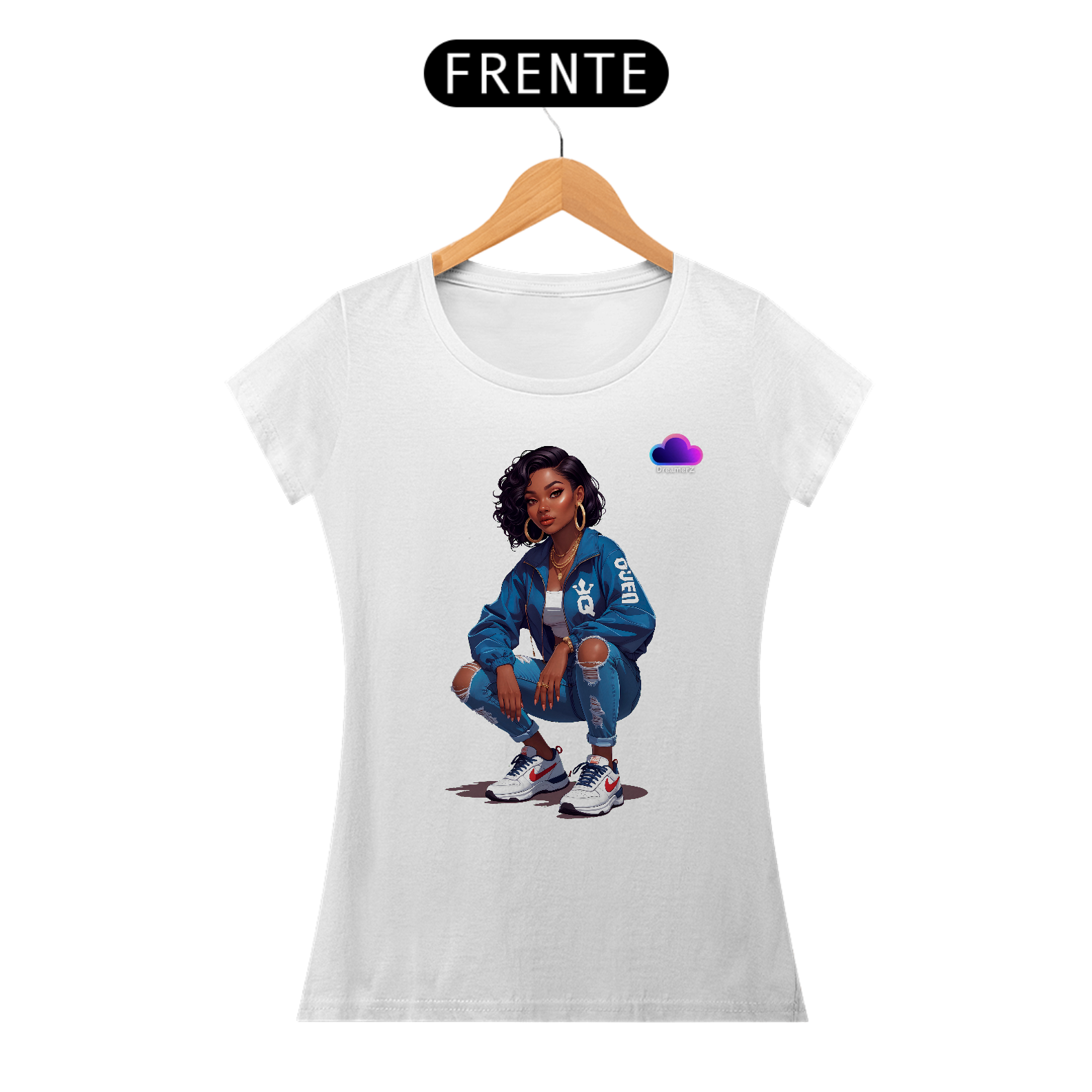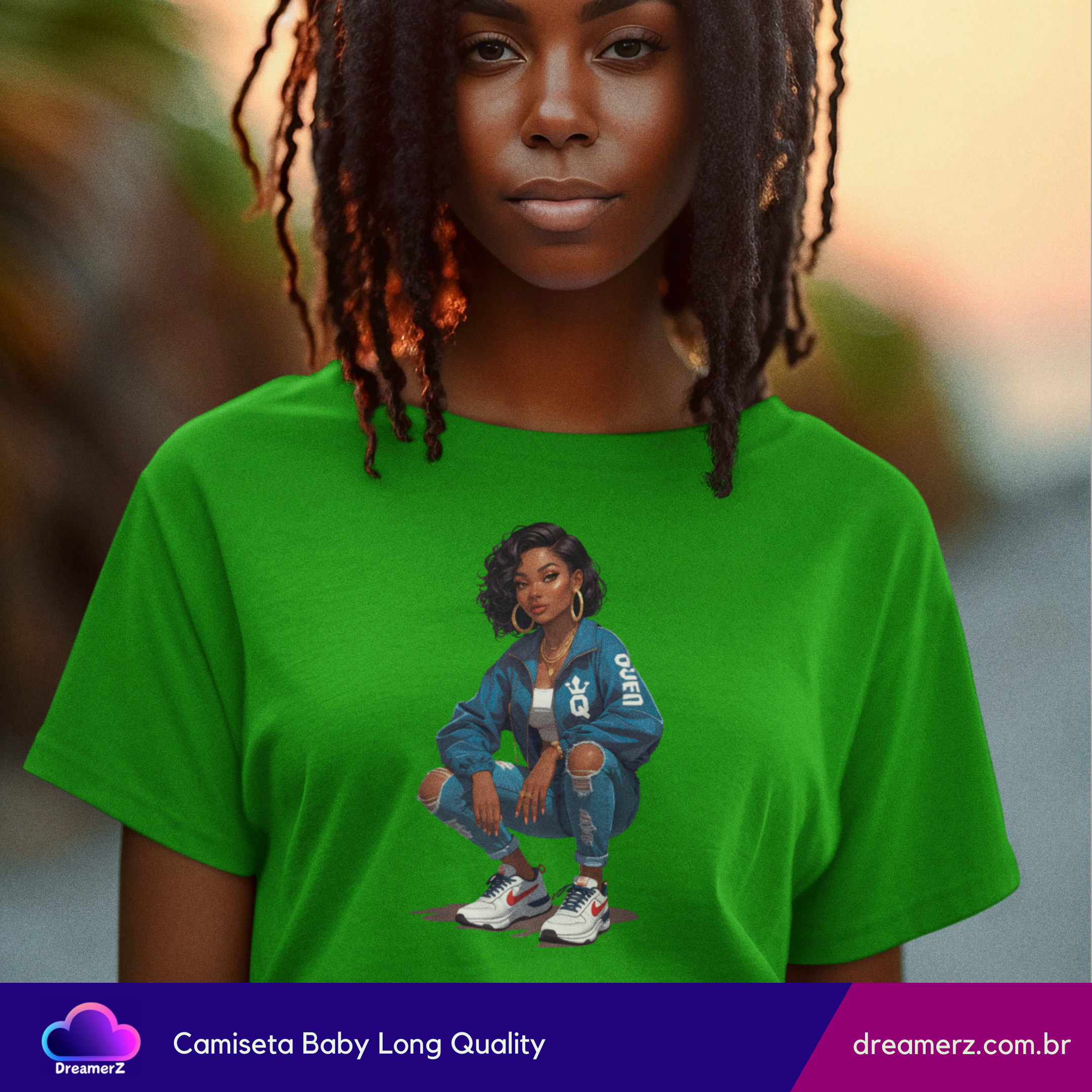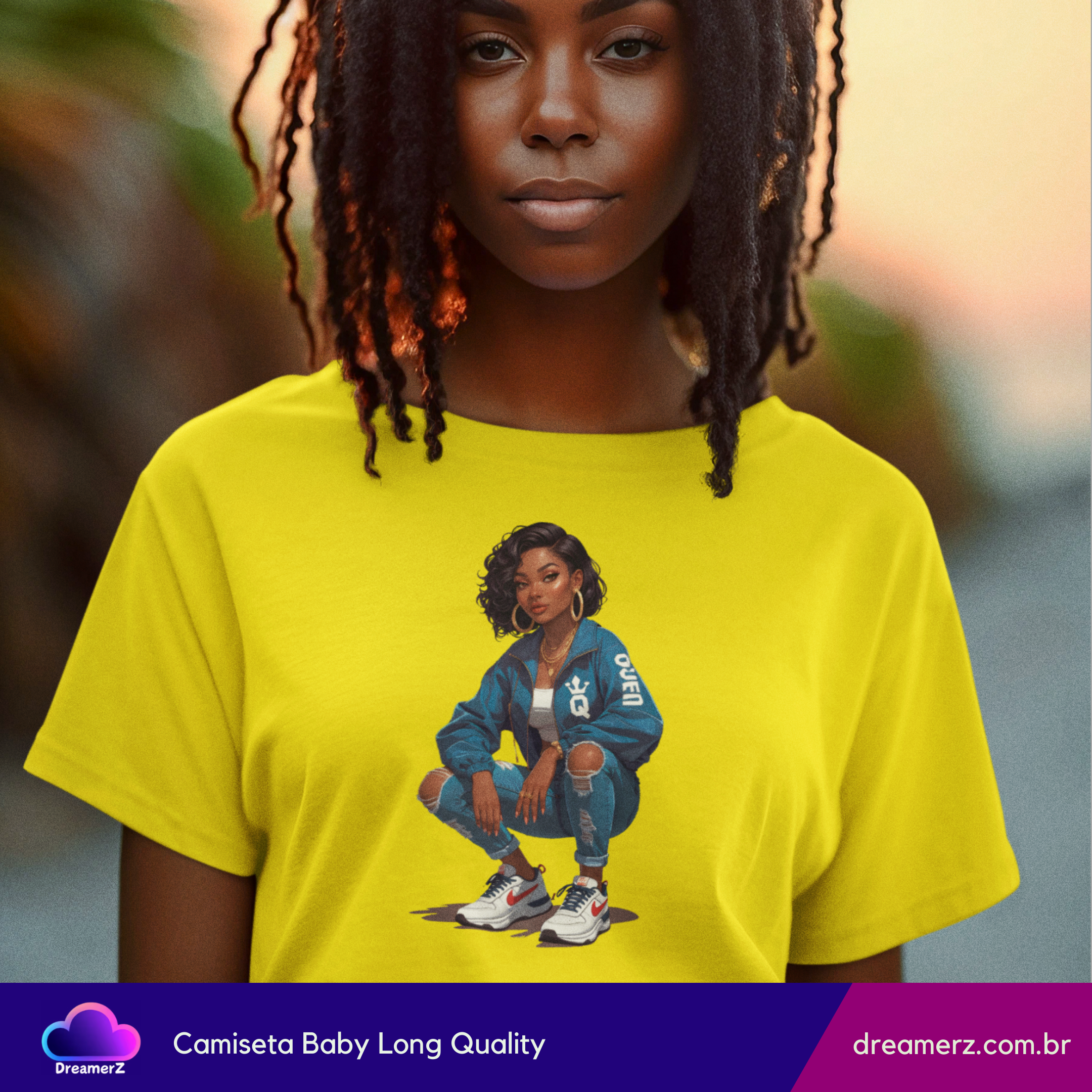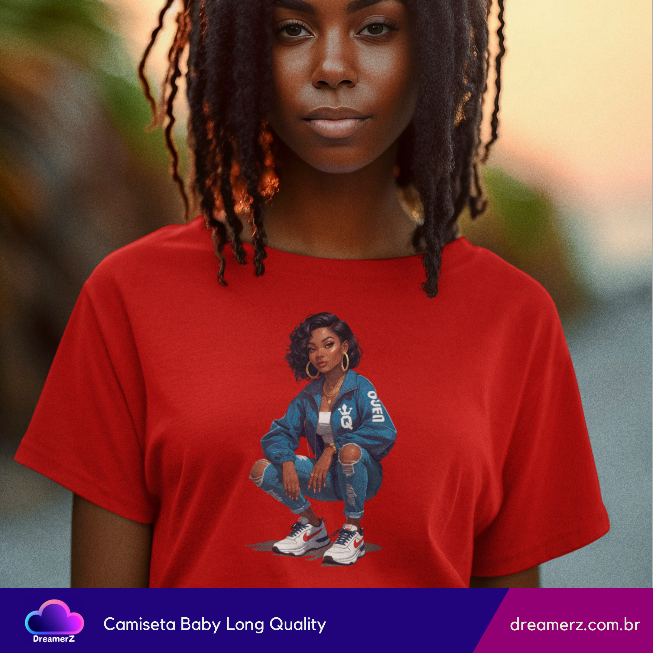 Quem disse que conforto e atitude não andam juntos? Essa camiseta traz uma estampa marcante de uma mulher com estilo streetwear, transbordando confiança, poder e muita autenticidade.