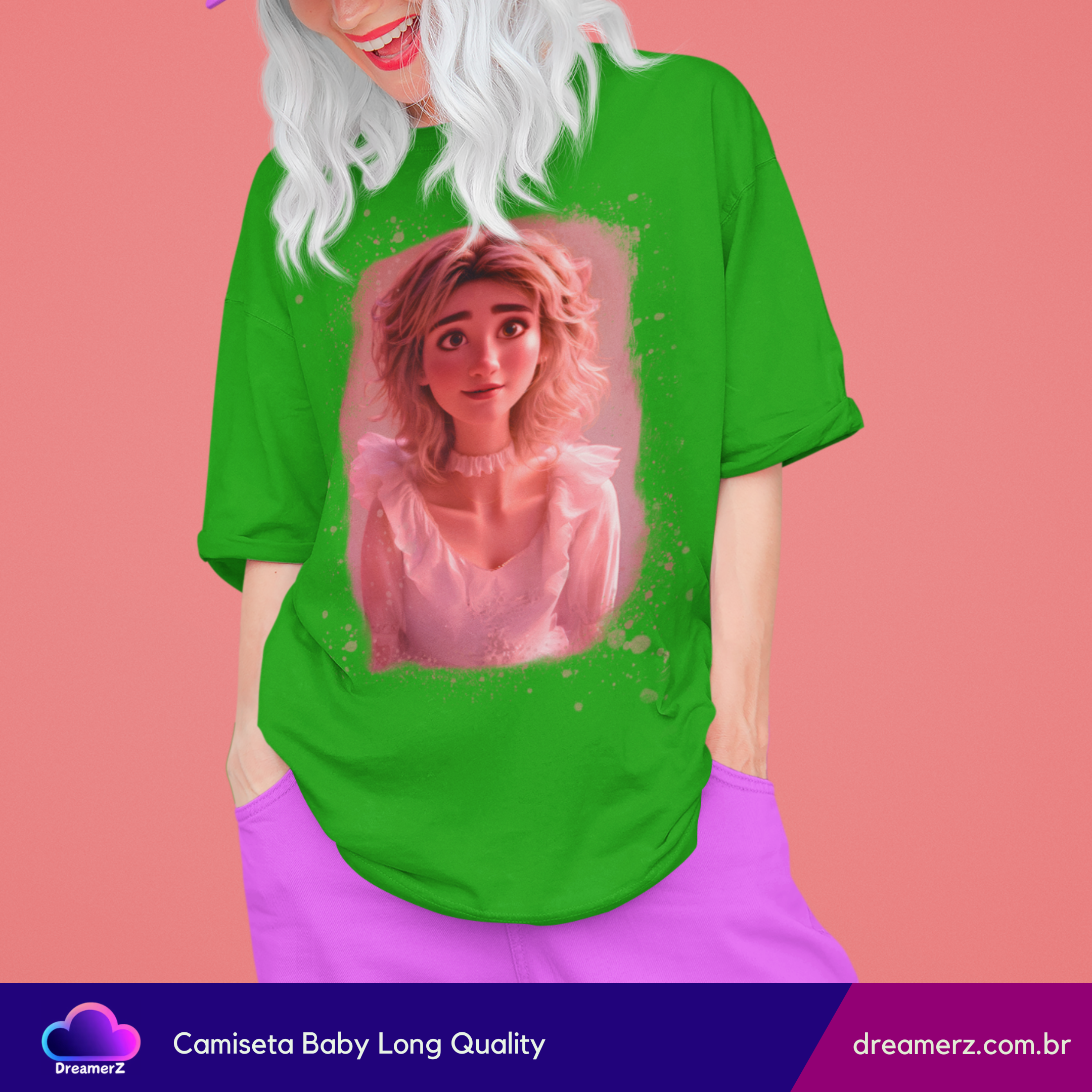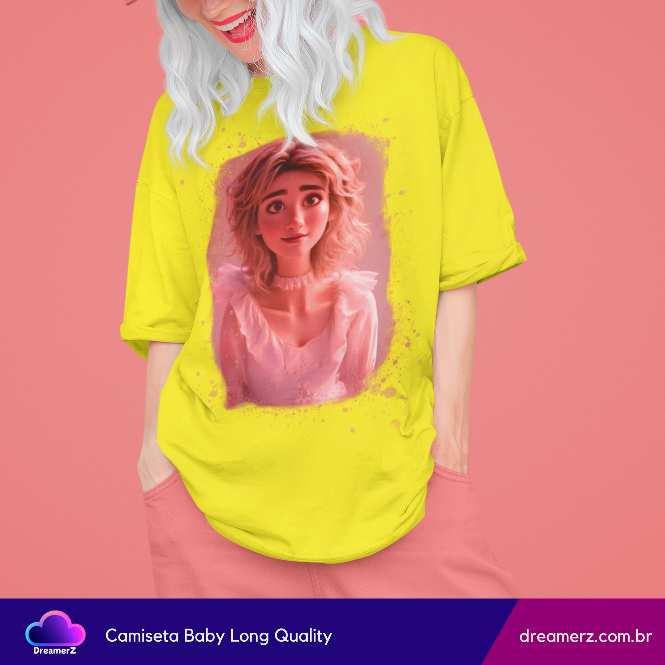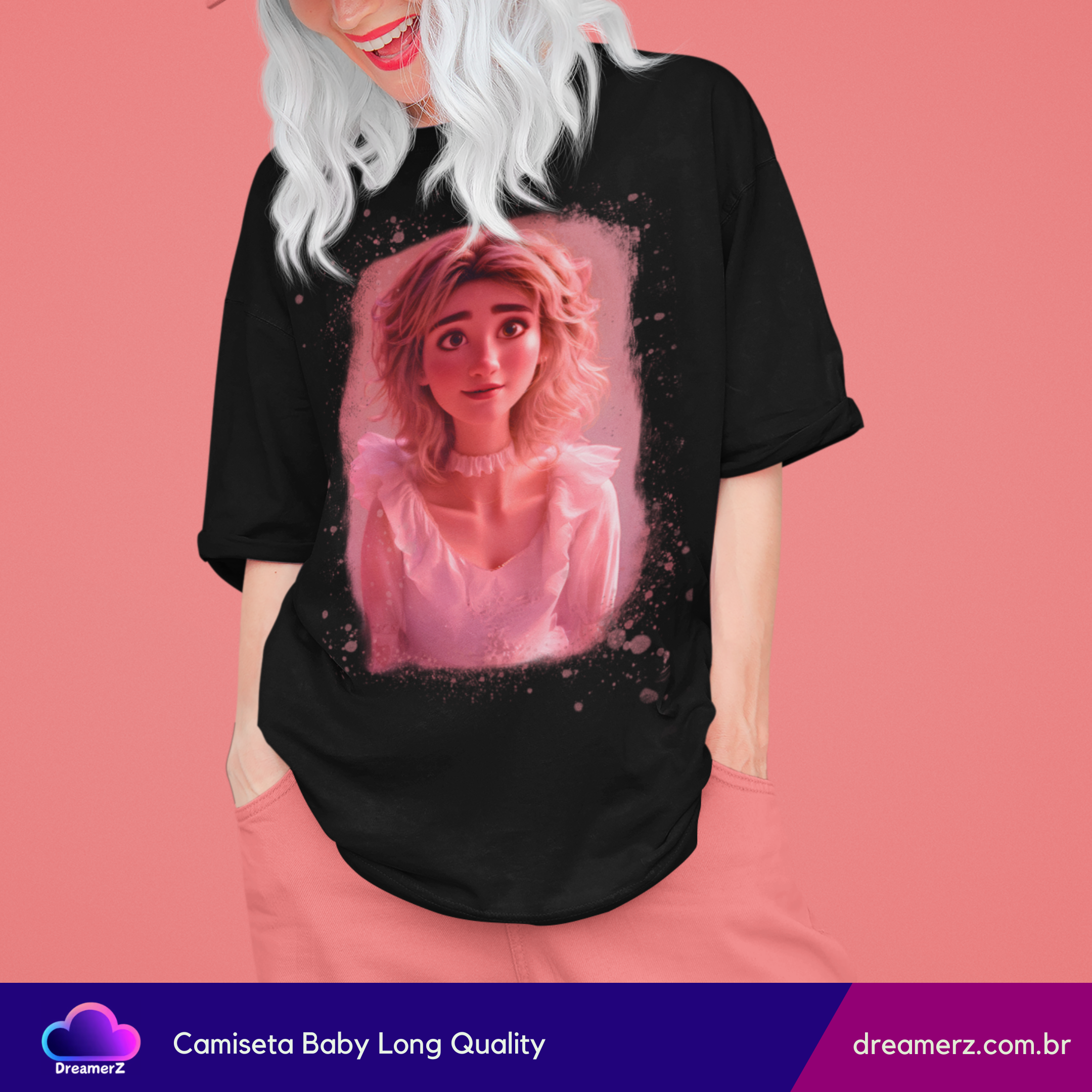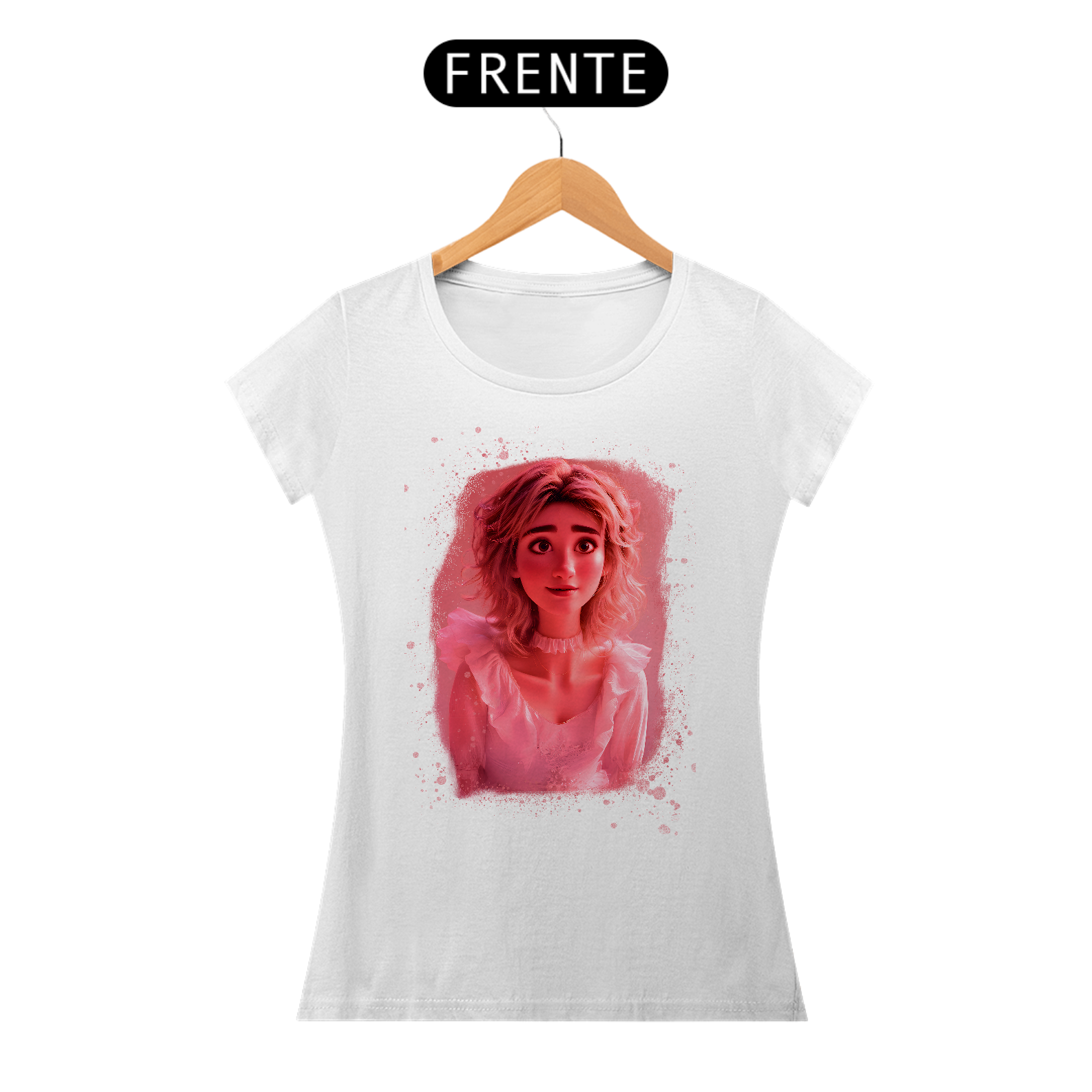 Essa peça é puro encanto! A estampa traz o rosto de uma personagem animada com expressão doce e olhar encantador, tudo em um visual iluminado por tons de rosa vibrante que parecem brilhar sobre o fundo preto da camiseta.