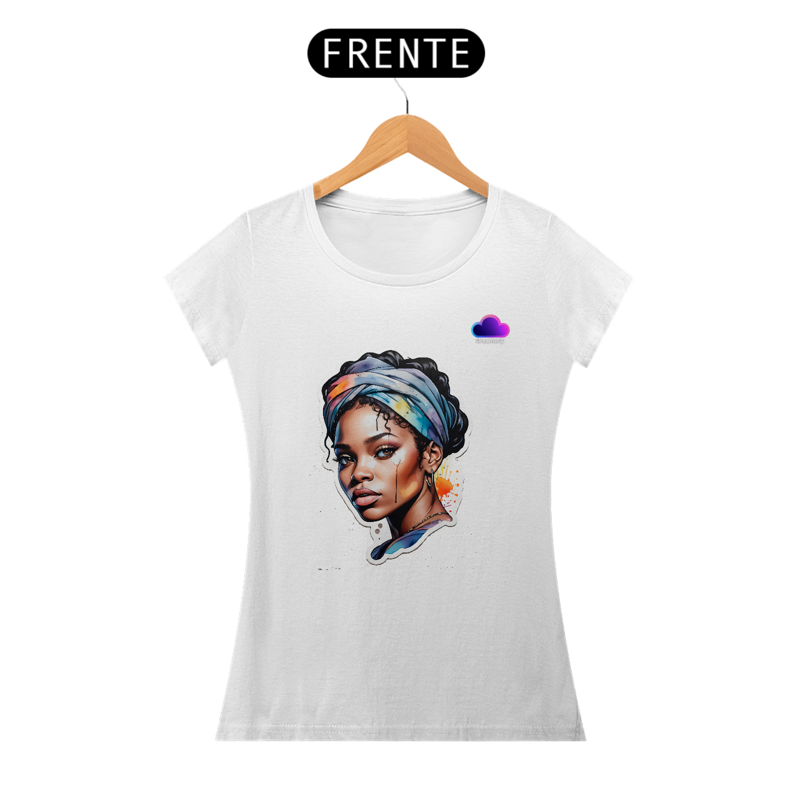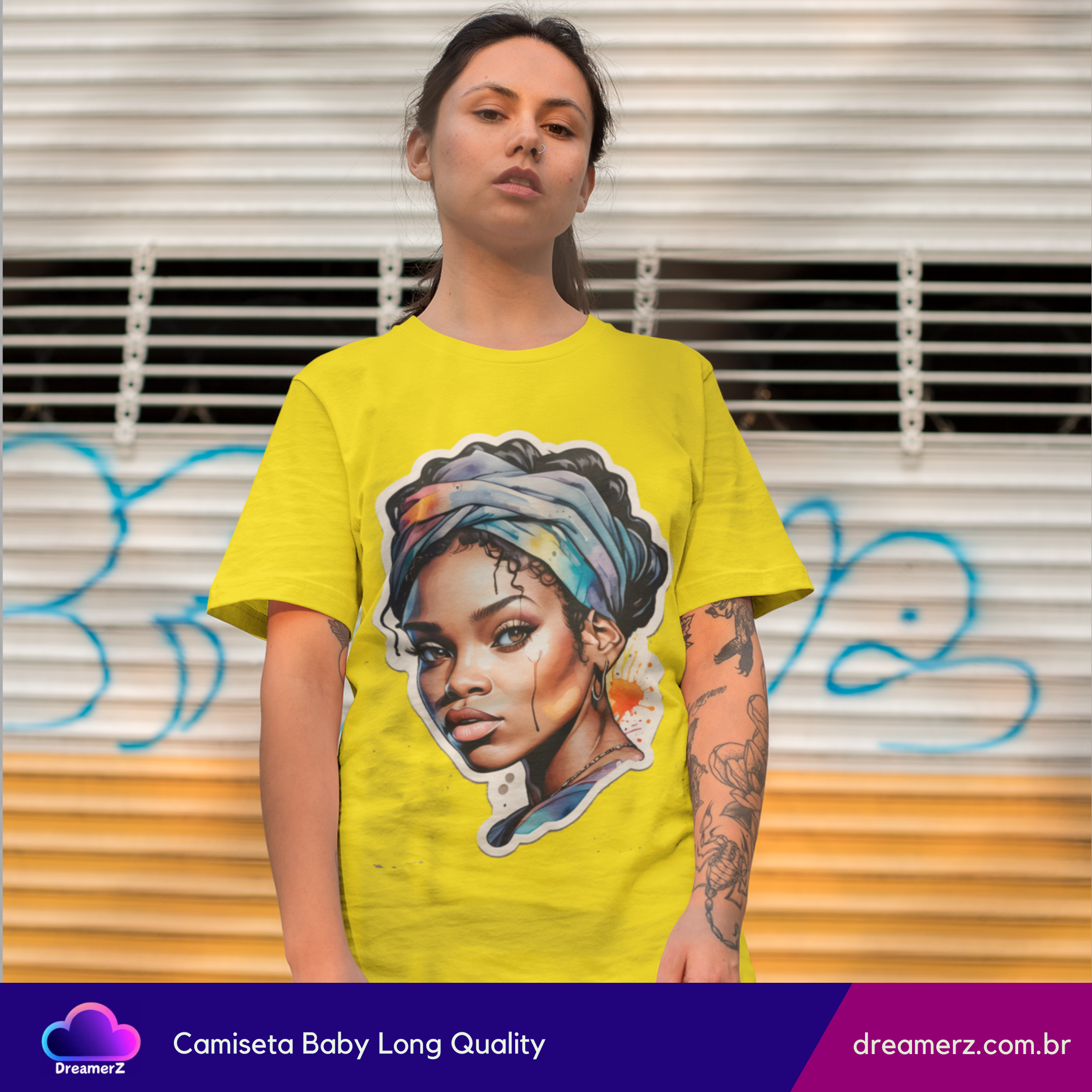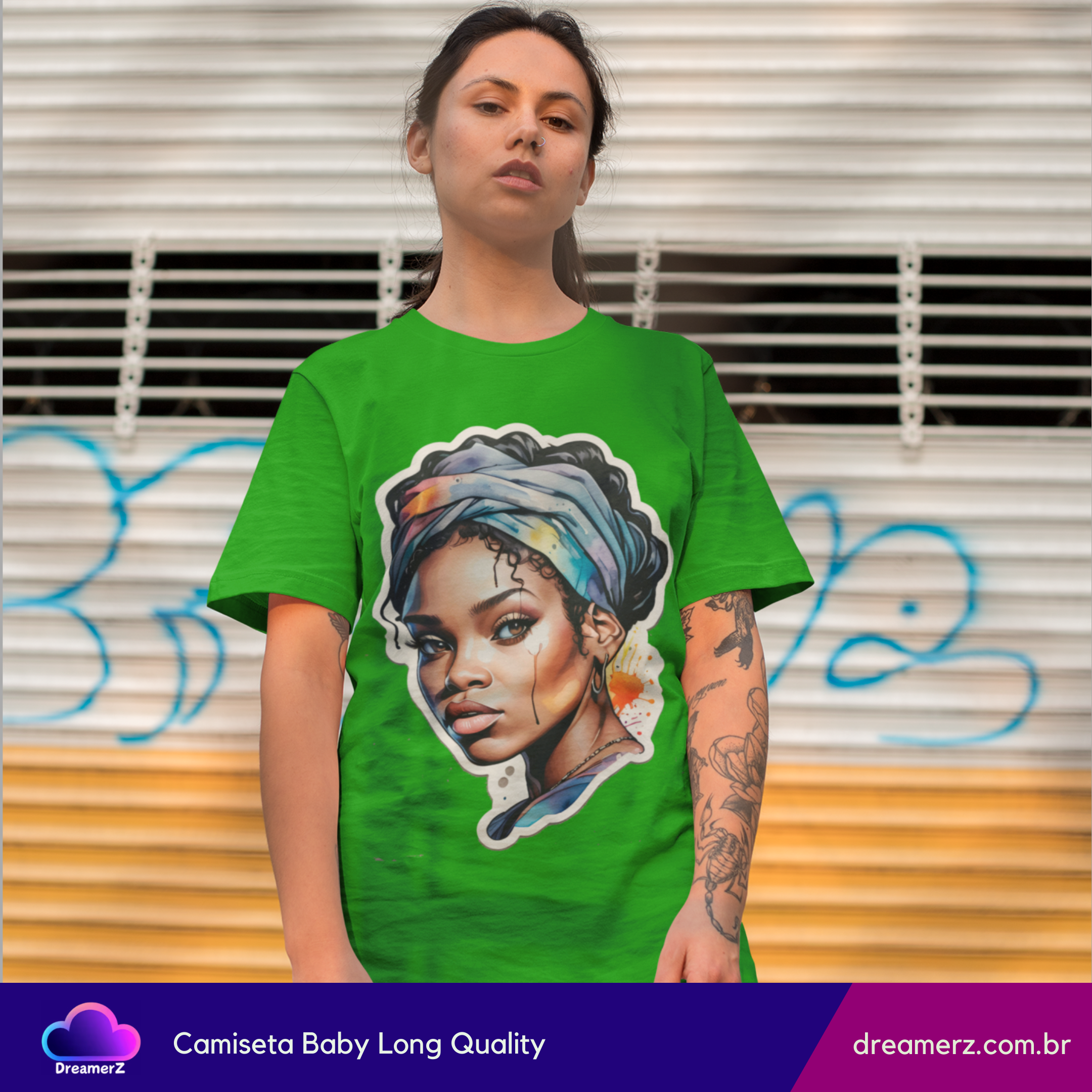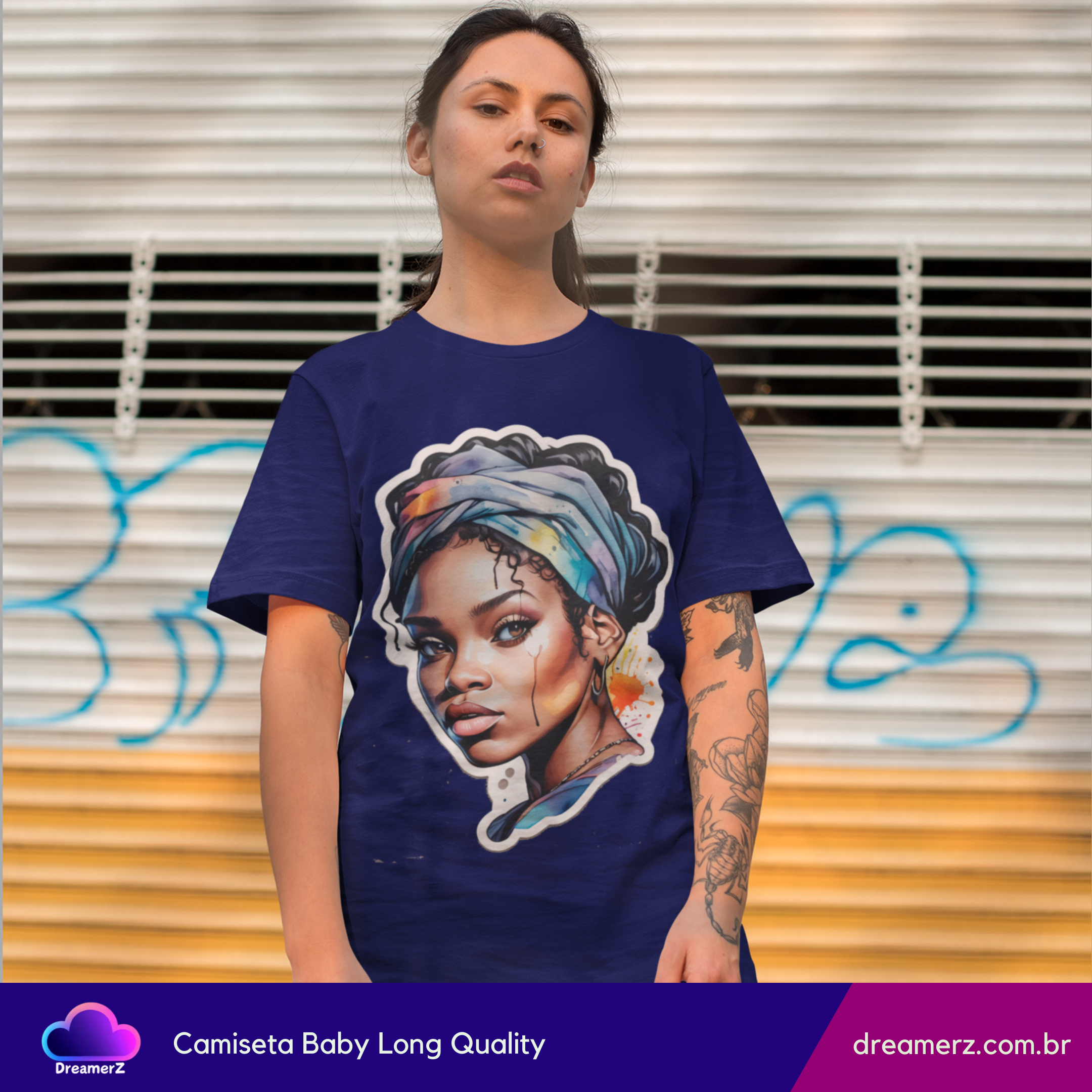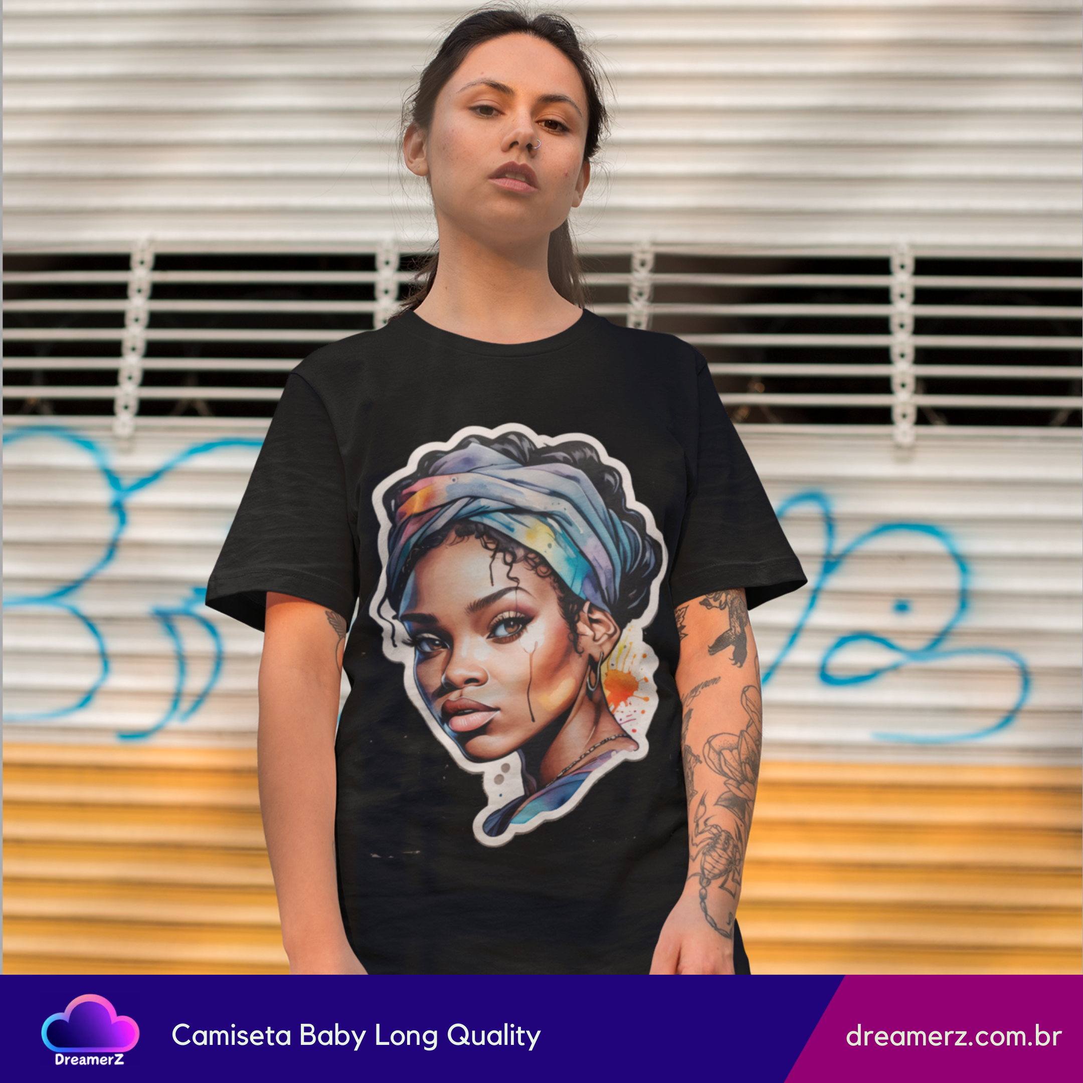 Essa camiseta é mais do que uma peça de roupa: é uma declaração de poder, arte e identidade. A estampa traz uma mulher com olhar marcante, envolvida em cores que escorrem como tinta e contam histórias de força, beleza e ancestralidade.