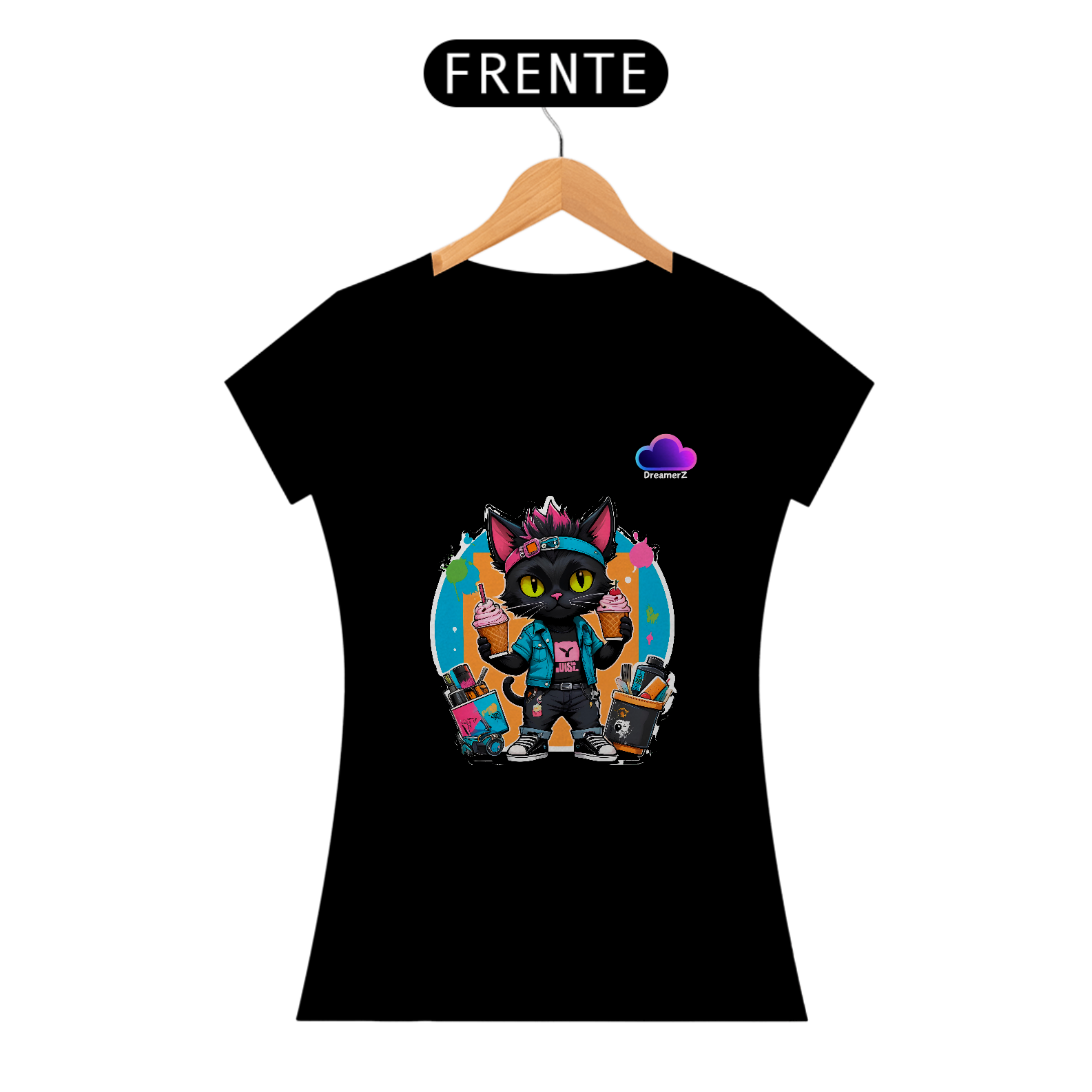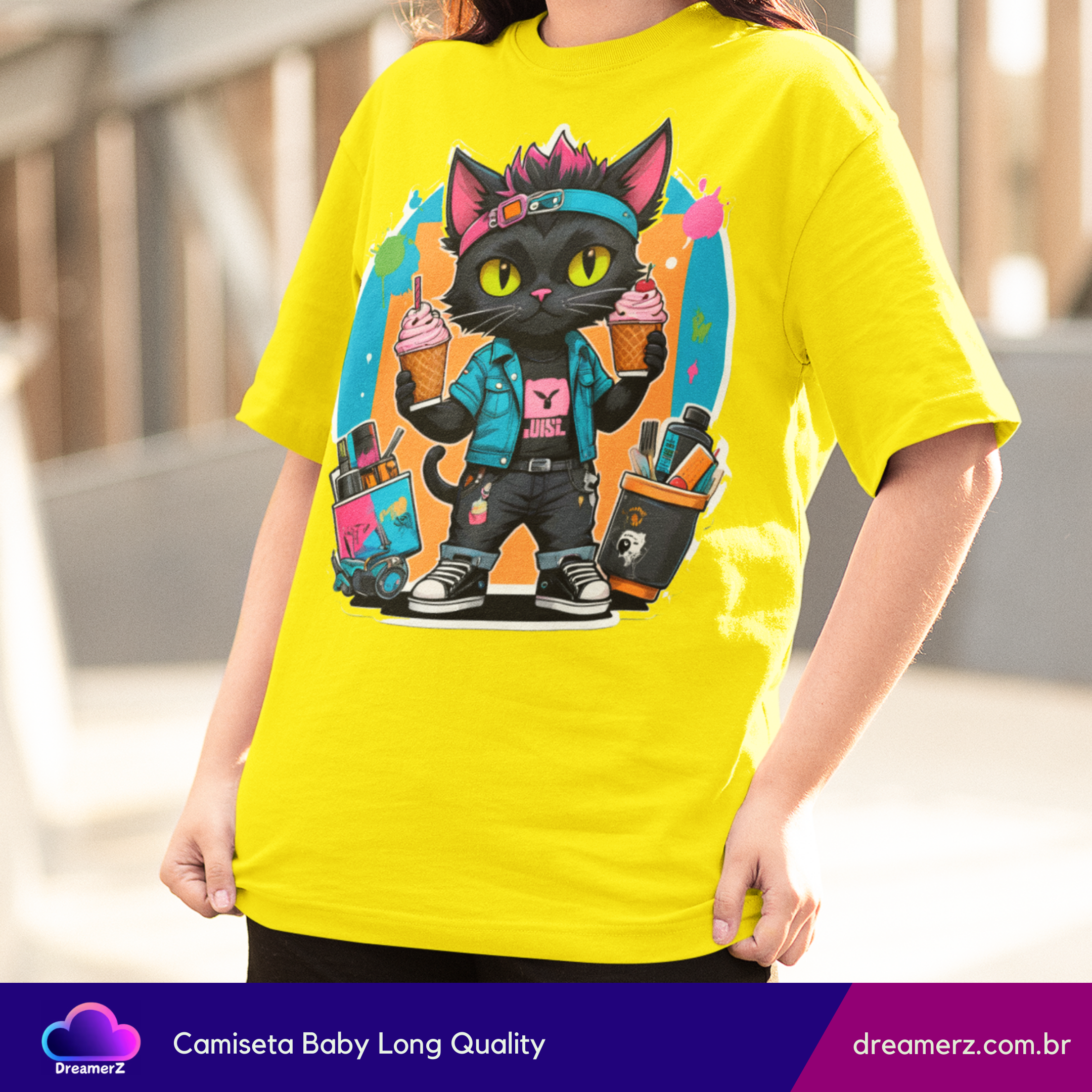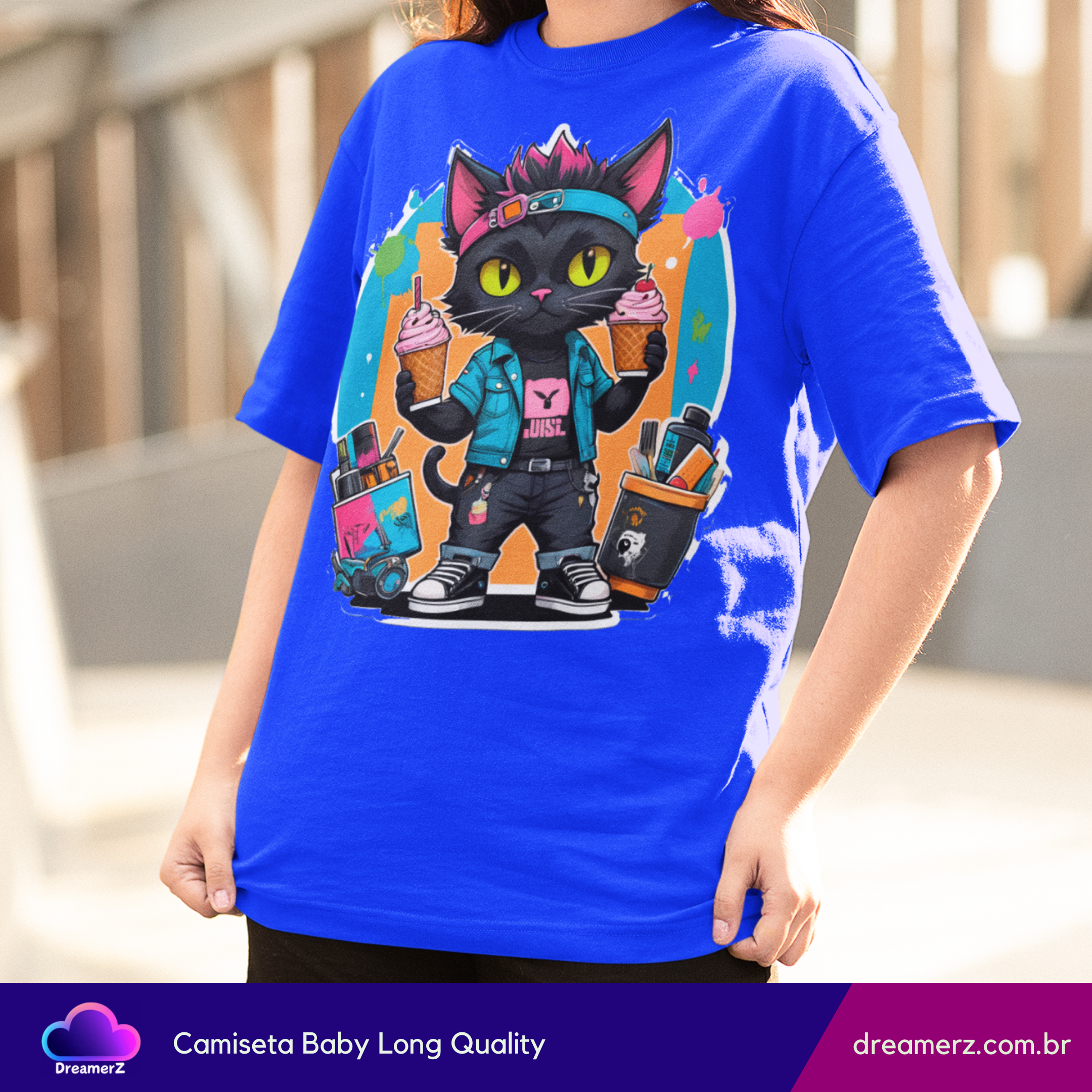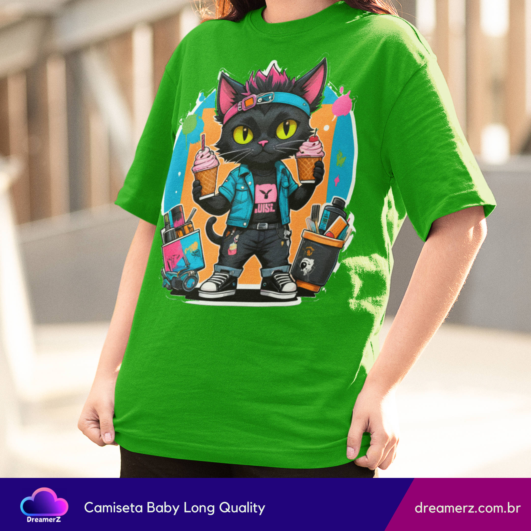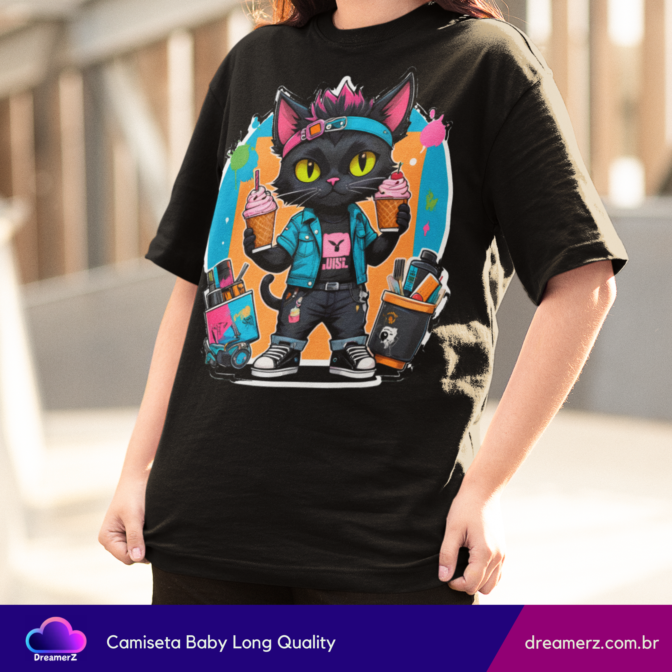 Essa não é apenas uma camiseta... é um manifesto de estilo urbano com uma pitada de doçura! O gatinho preto mais descolado da cidade chegou com look completo, sorvetes nas patas e rodeado de tintas — pronto pra colorir seu visual com muita atitude.