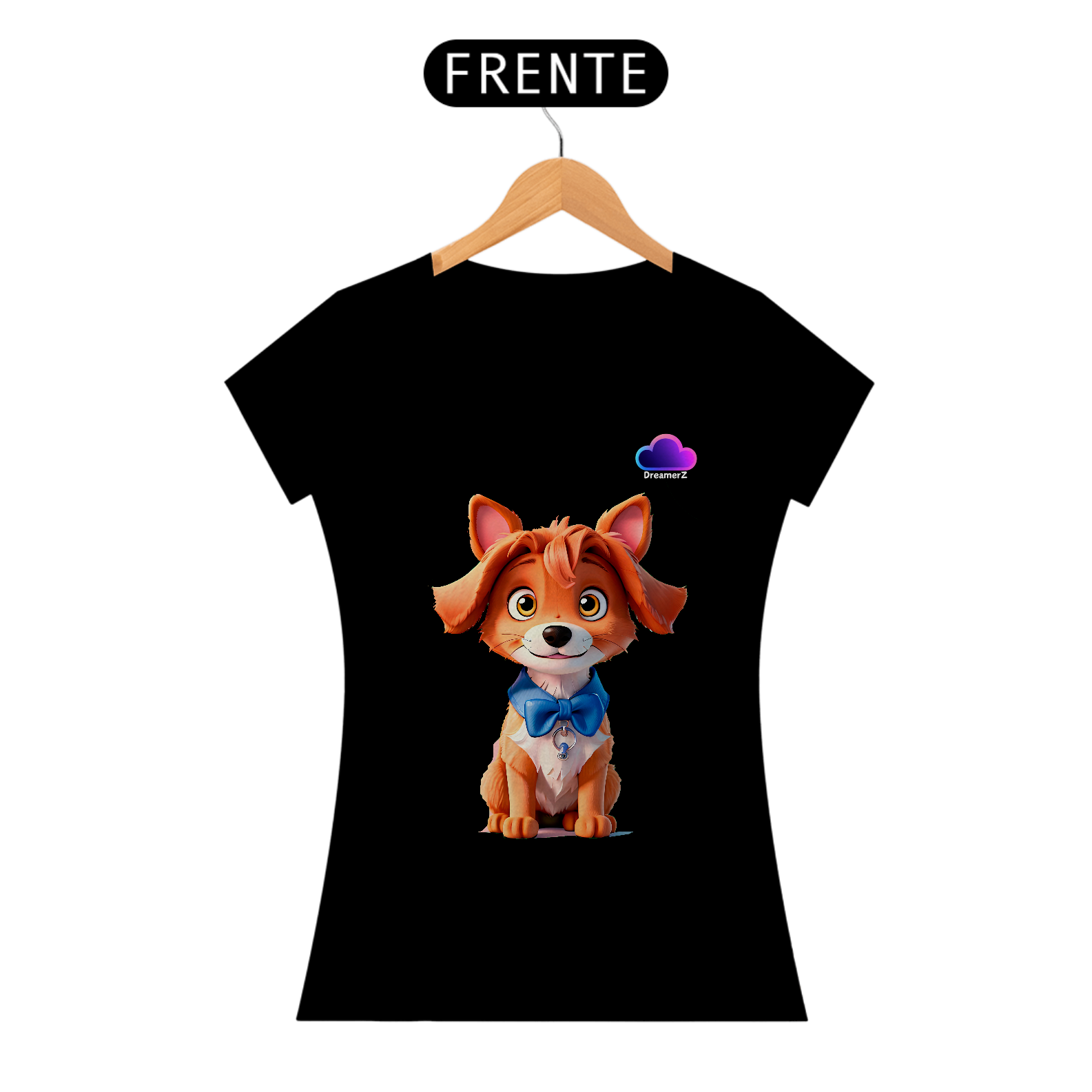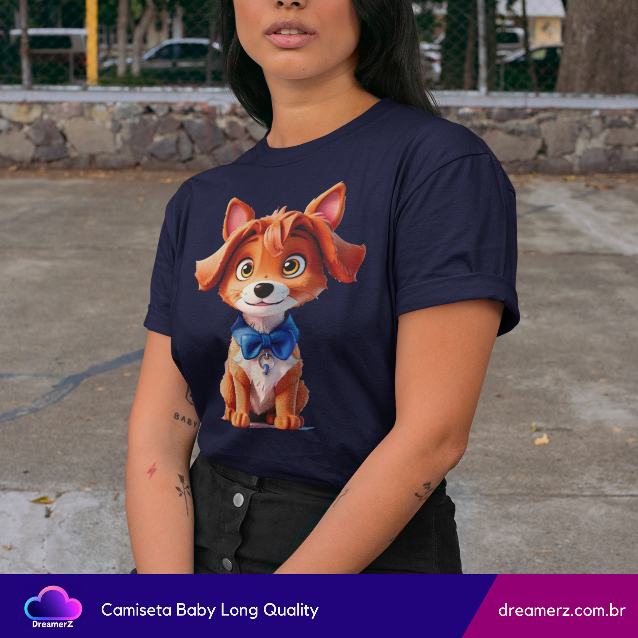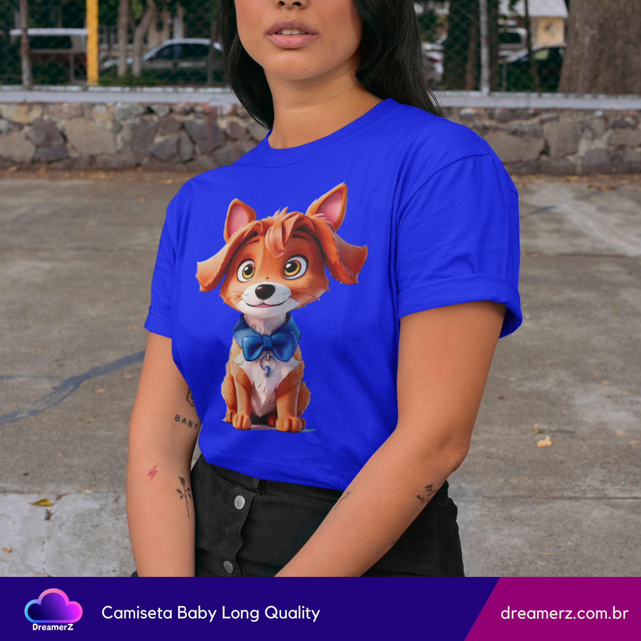 Se você é do time que se derrete por um olhar doce e orelhinhas caídas, essa camiseta é pra você! Com um cachorrinho adorável vestindo uma gravatinha azul e um olhar encantador, essa estampa vai direto ao coração — e para o topo dos looks mais fofos do seu guarda-roupa.
