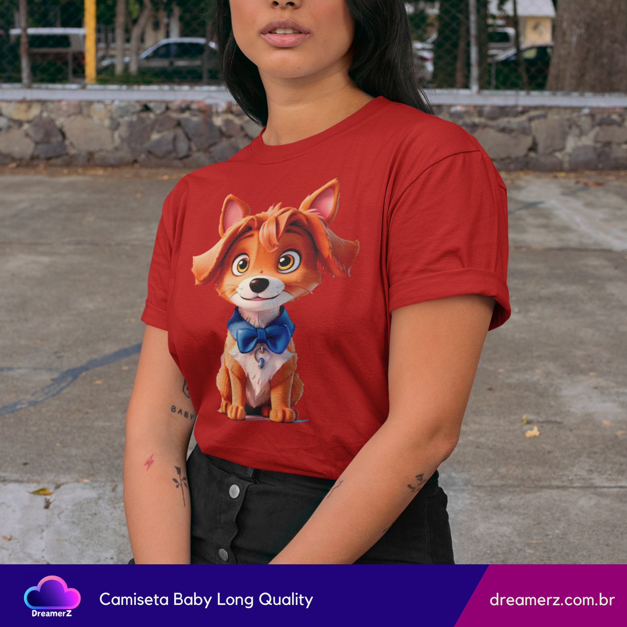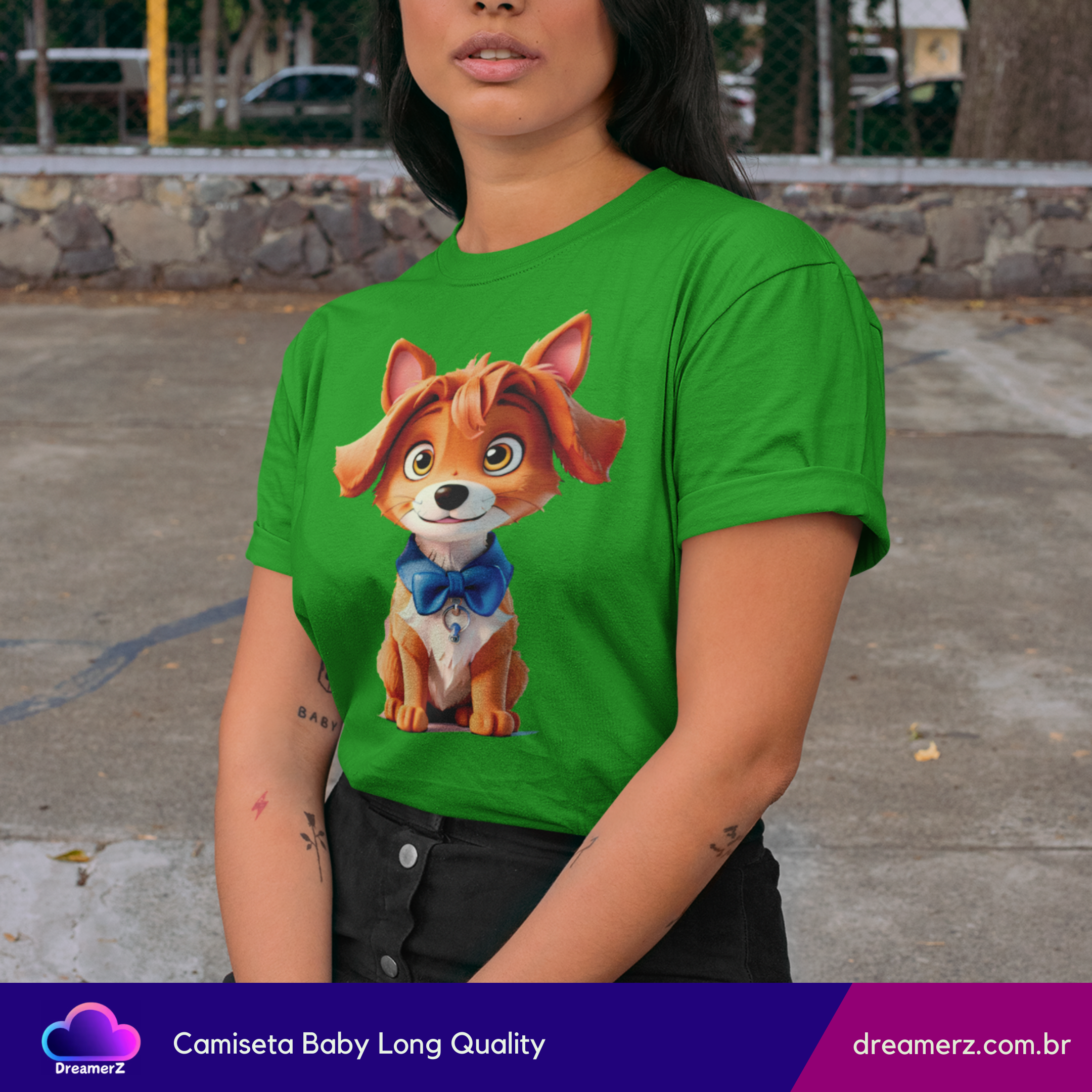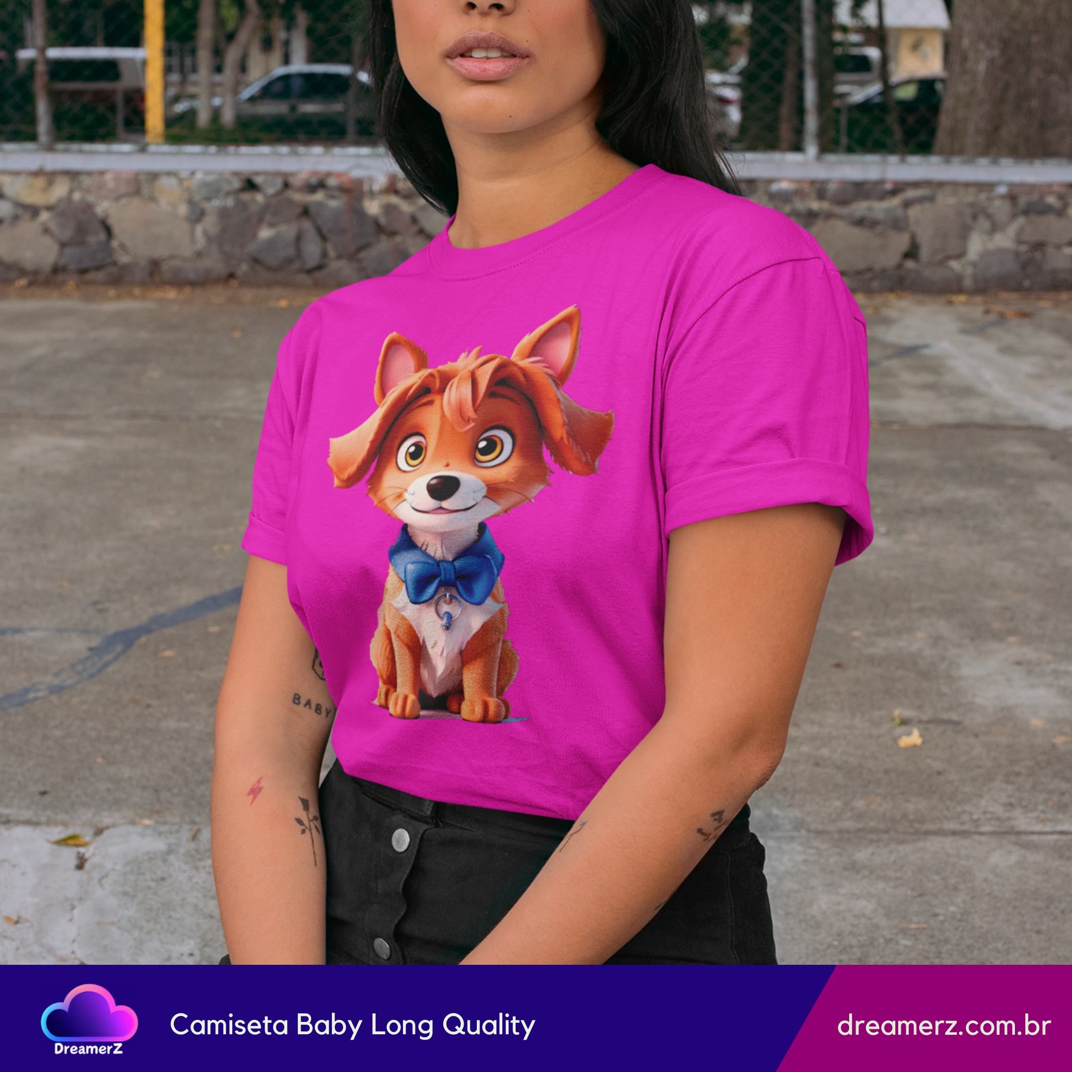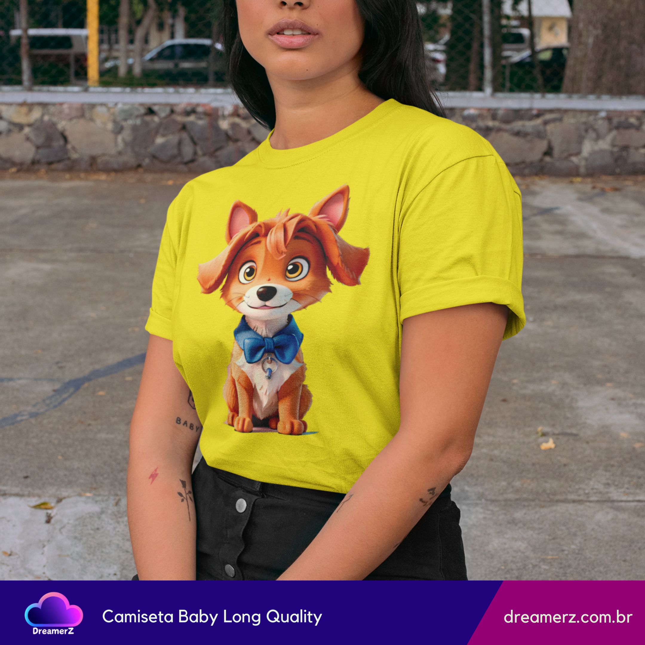 Se você é do time que se derrete por um olhar doce e orelhinhas caídas, essa camiseta é pra você! Com um cachorrinho adorável vestindo uma gravatinha azul e um olhar encantador, essa estampa vai direto ao coração — e para o topo dos looks mais fofos do seu guarda-roupa.