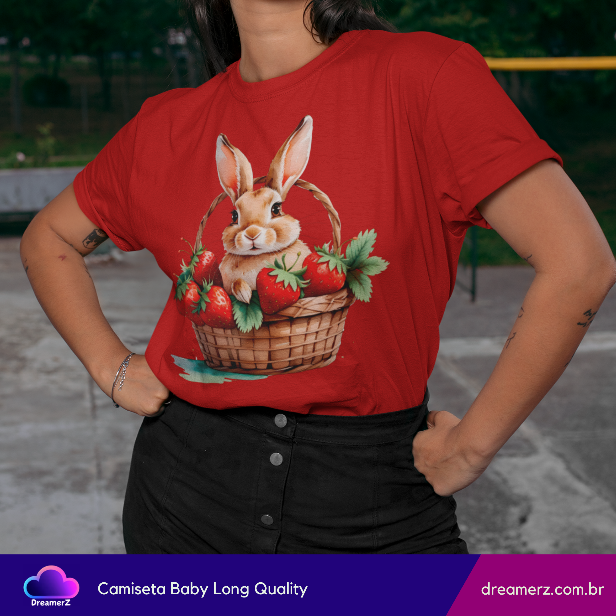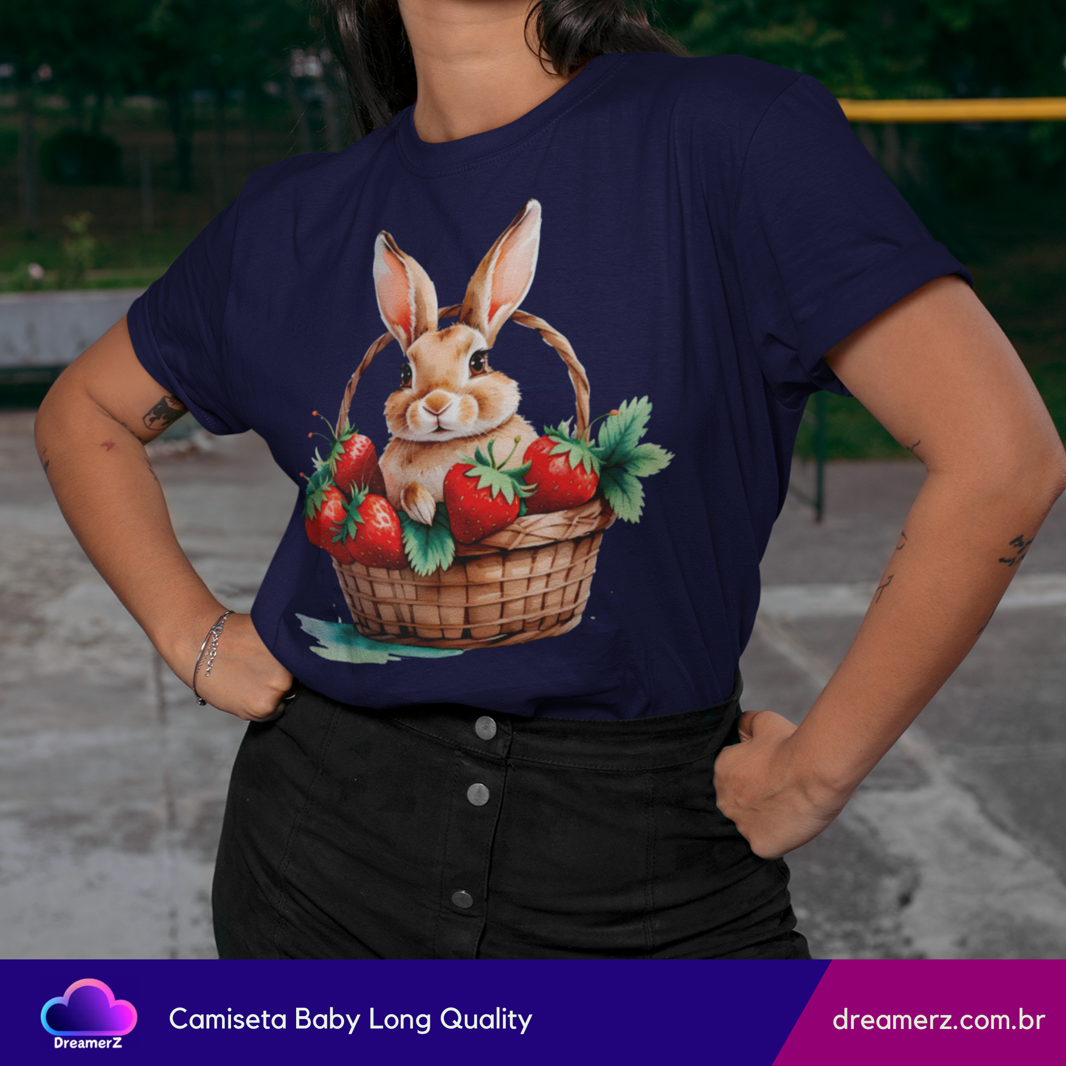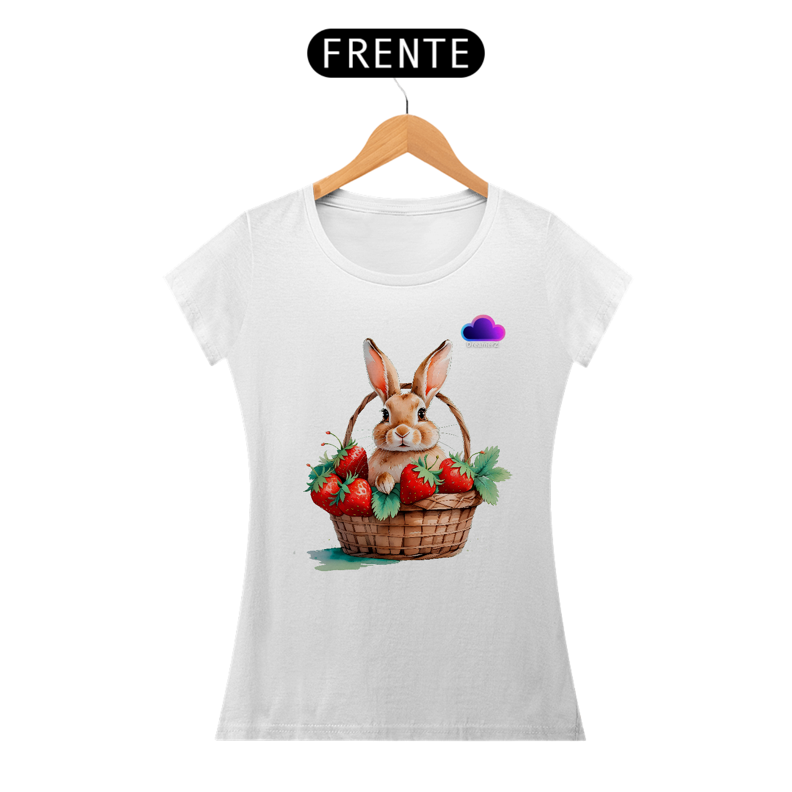 Essa camiseta é puro aconchego visual! Com um coelhinho adorável acomodado em uma cesta recheada de morangos suculentos, essa estampa mistura a doçura da natureza com o charme dos detalhes artísticos.