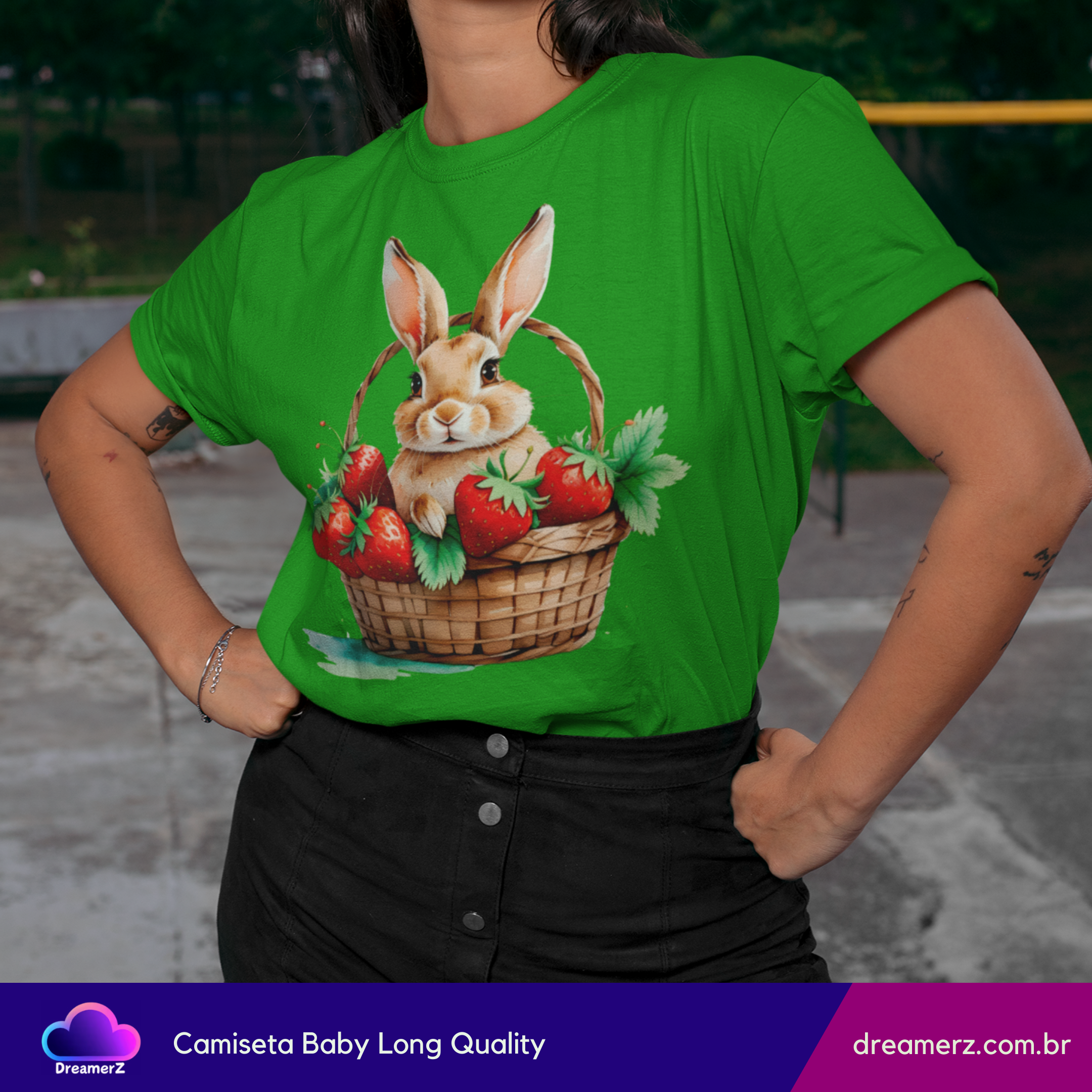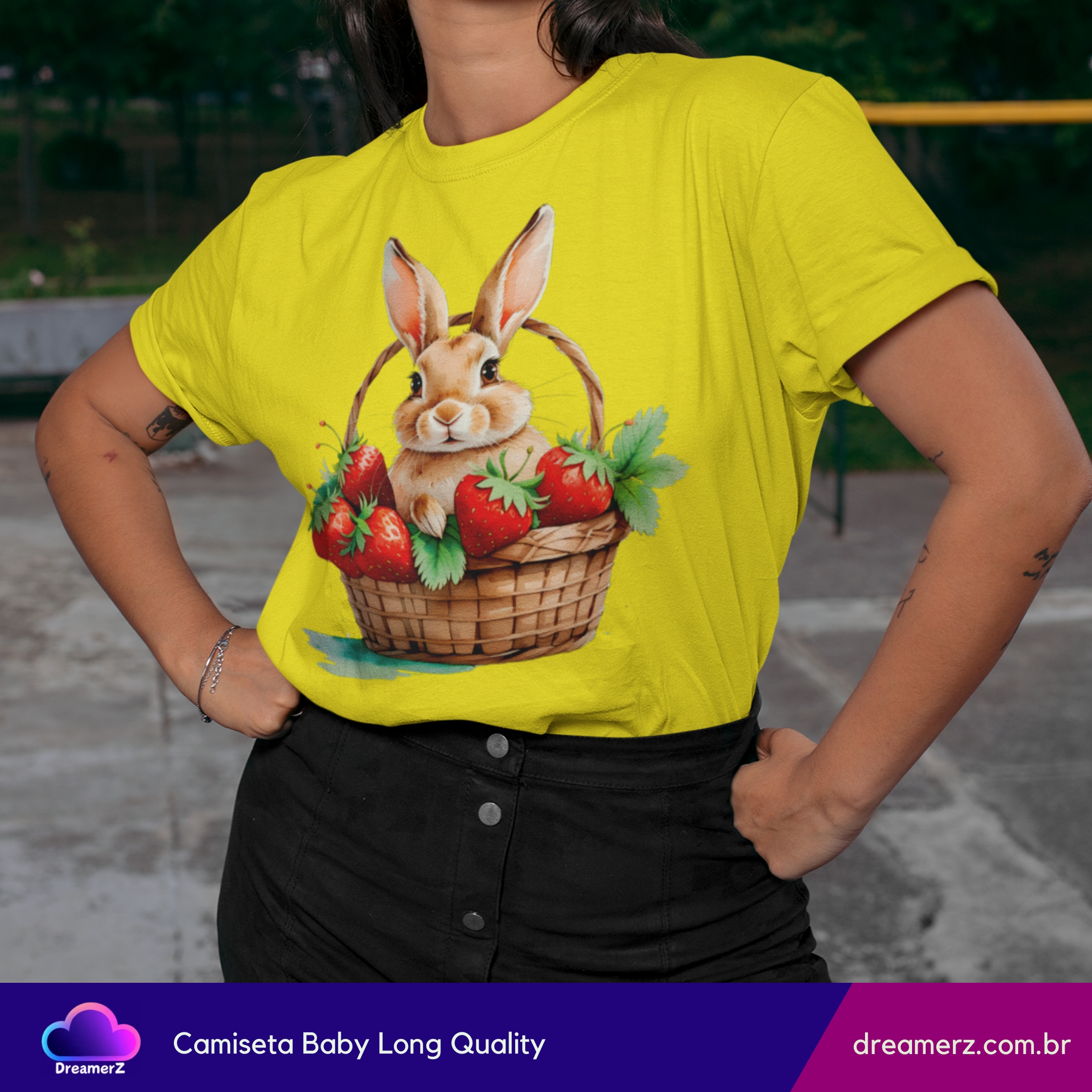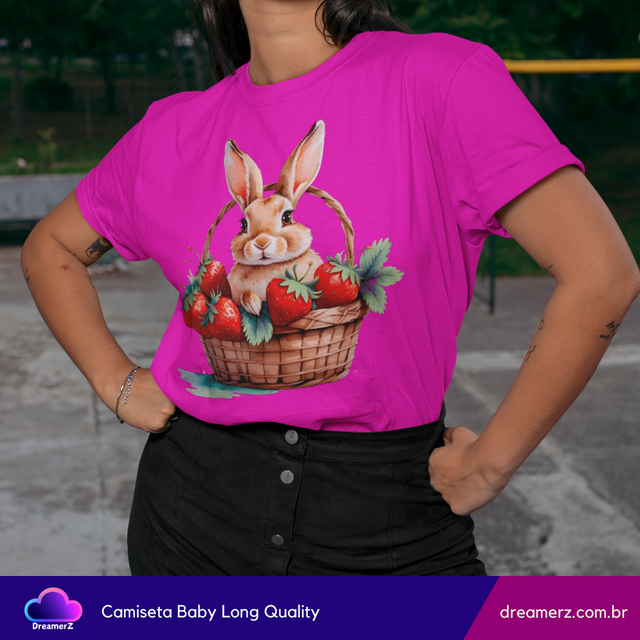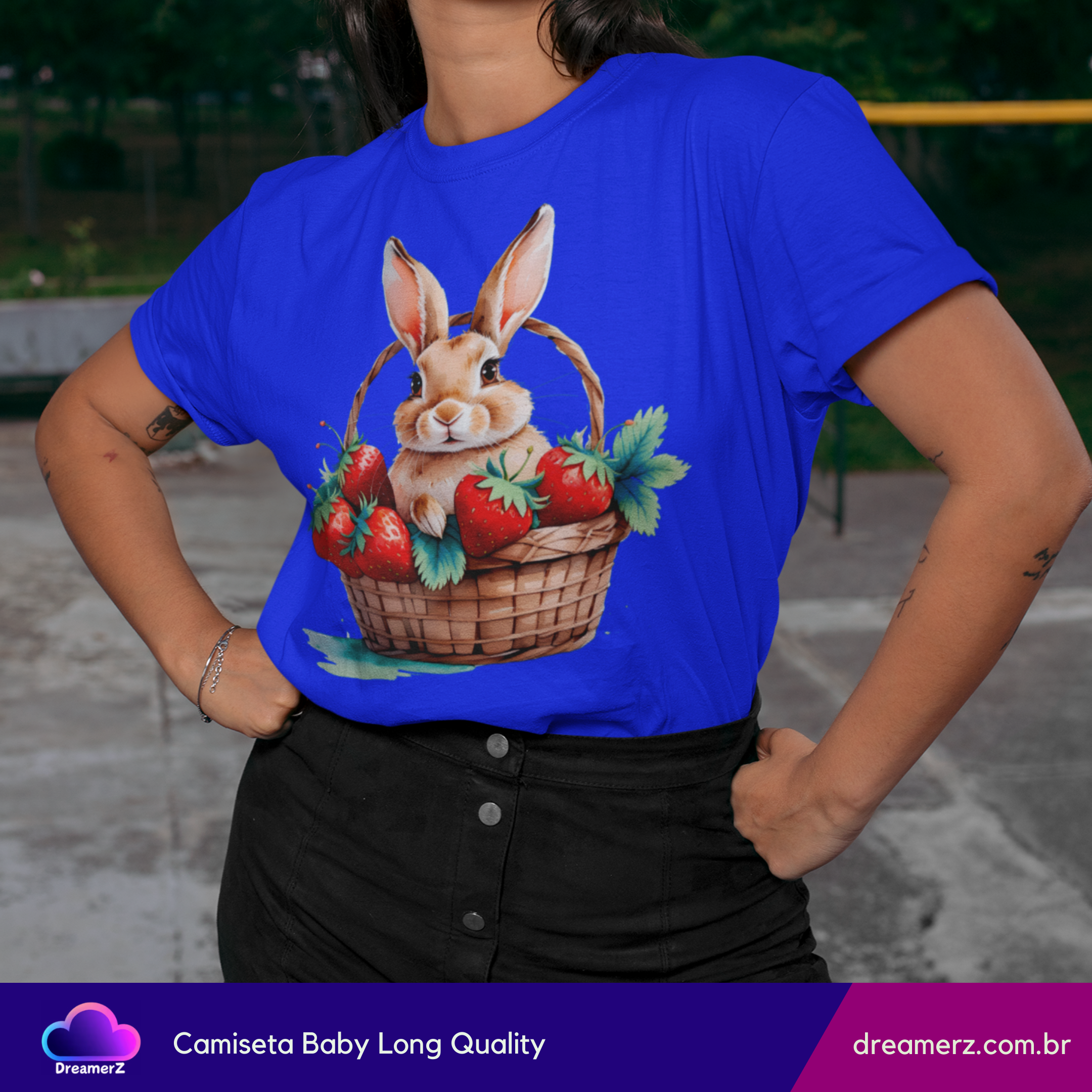 Essa camiseta é puro aconchego visual! Com um coelhinho adorável acomodado em uma cesta recheada de morangos suculentos, essa estampa mistura a doçura da natureza com o charme dos detalhes artísticos.