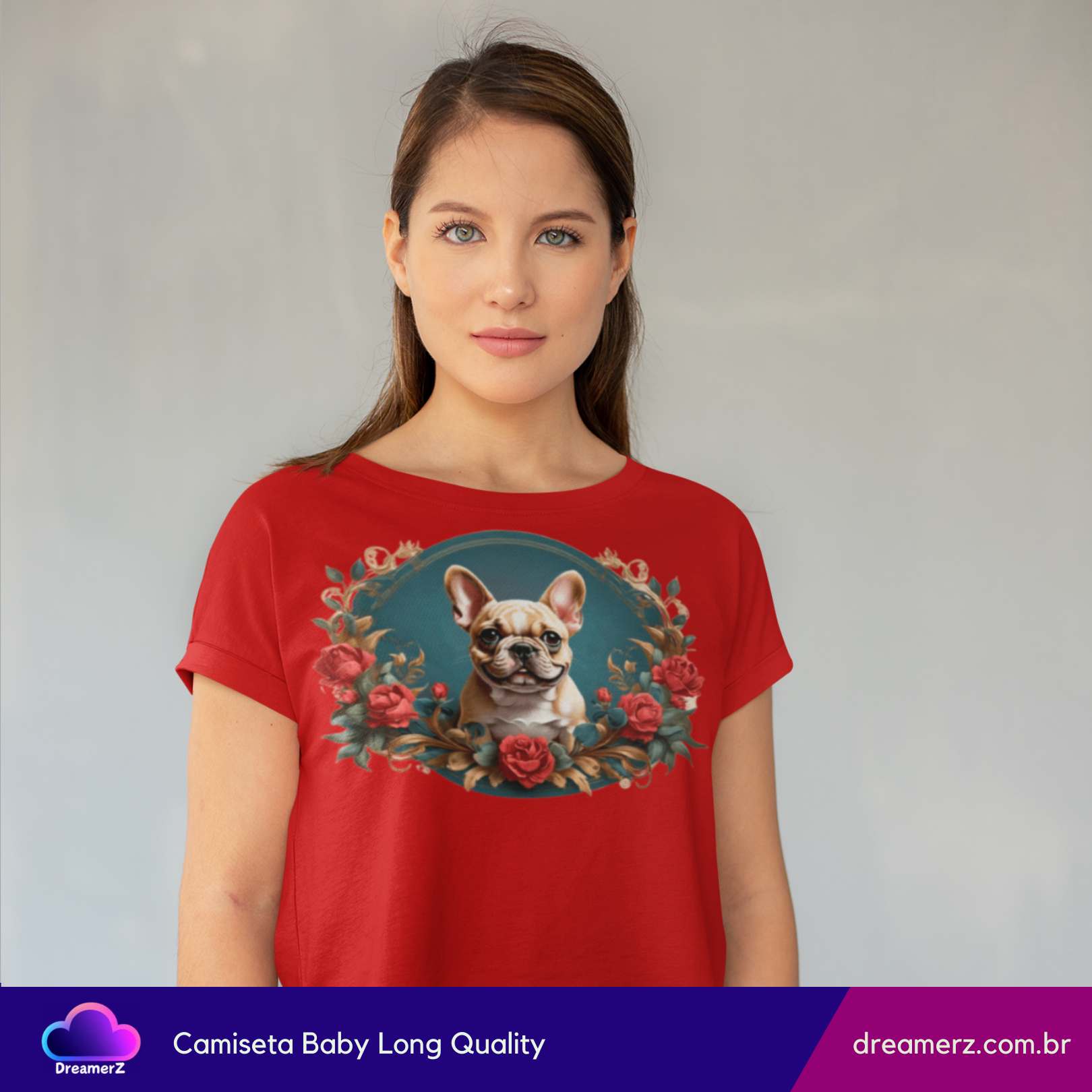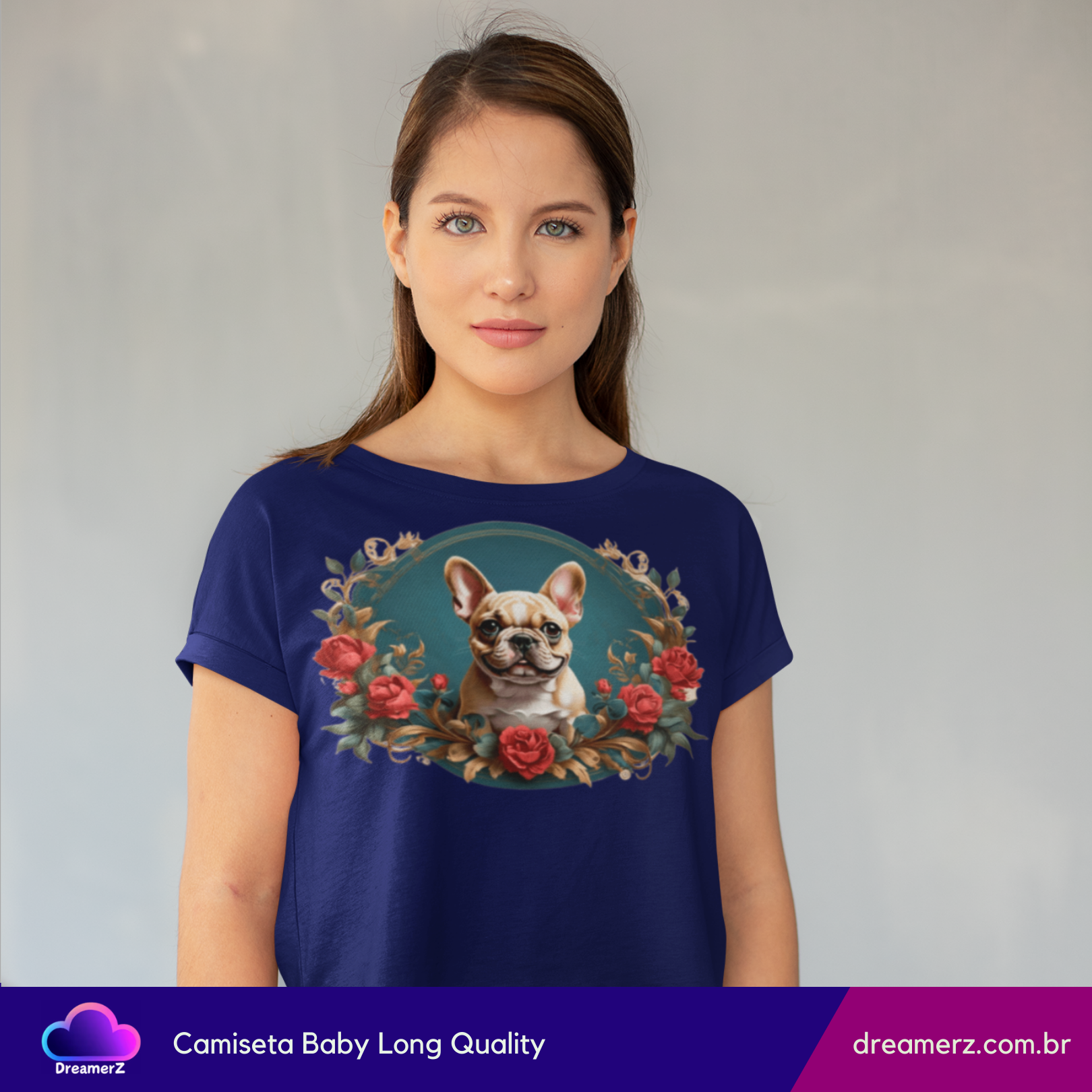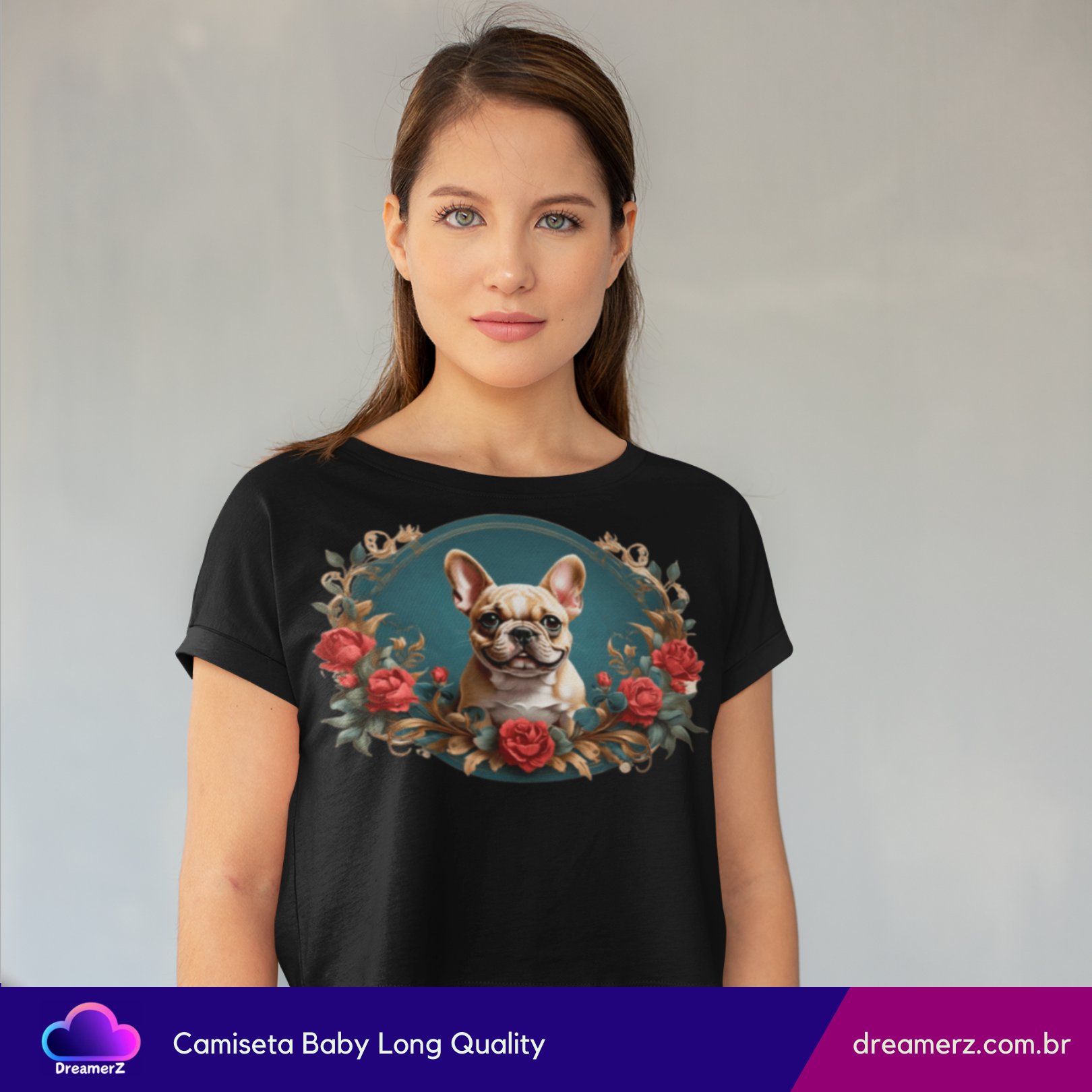 Essa estampa é puro amor e sofisticação! Um lindo bulldog francês, rodeado por um elegante arranjo de flores vermelhas, digno de um retrato clássico – direto para seu look do dia!