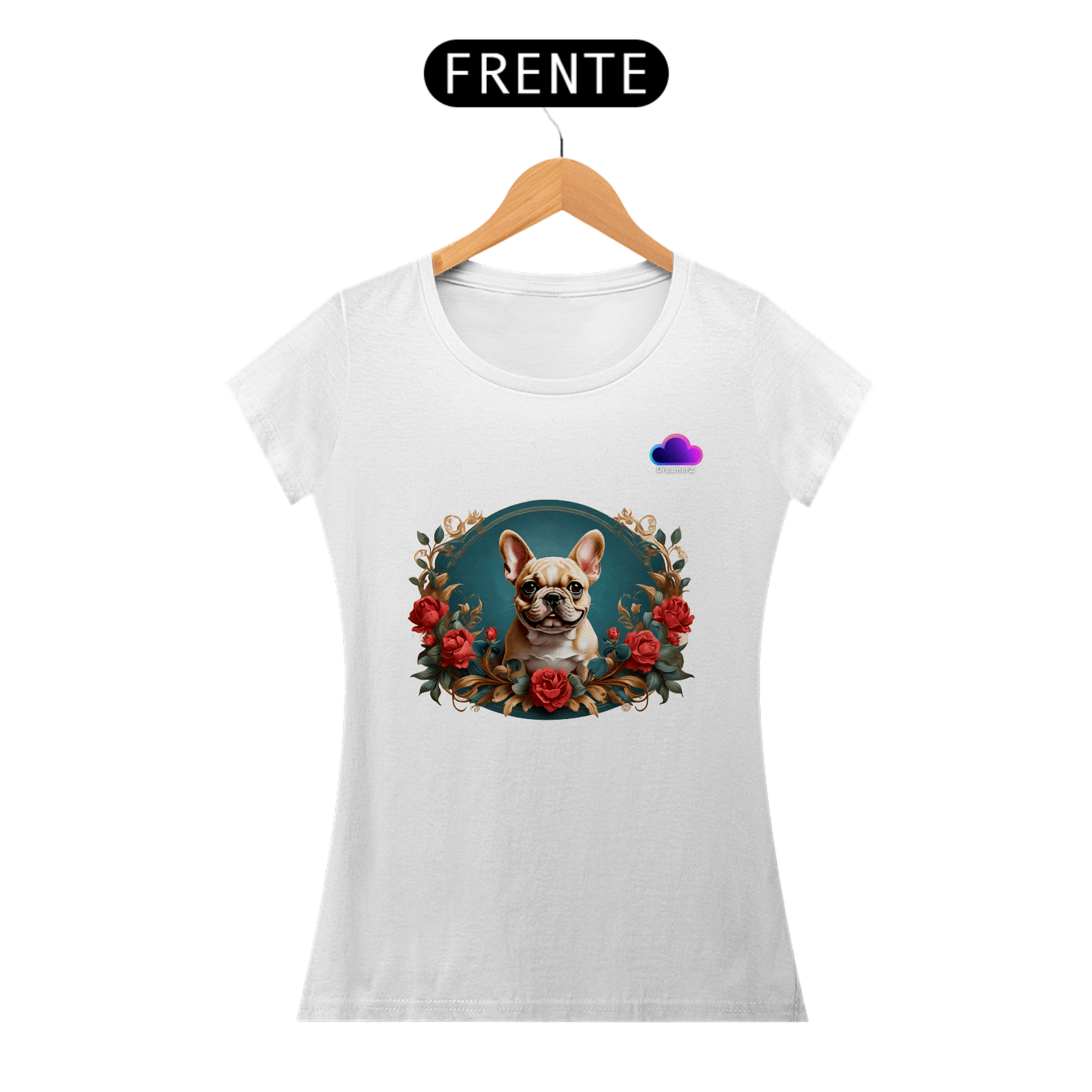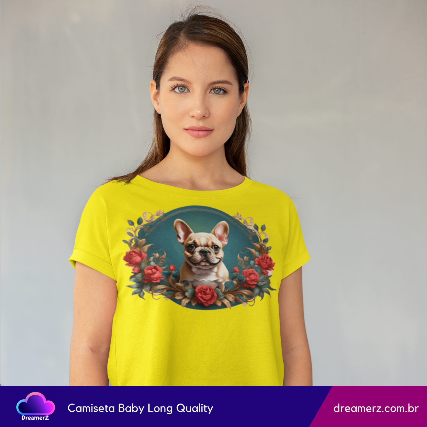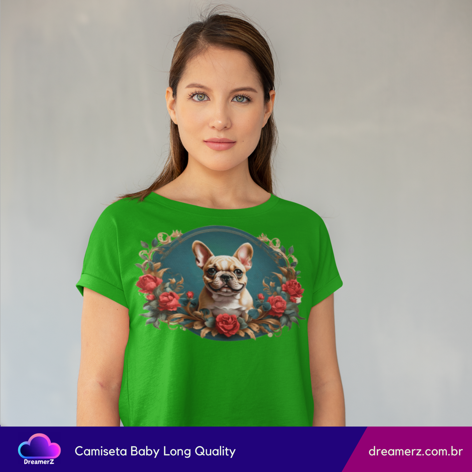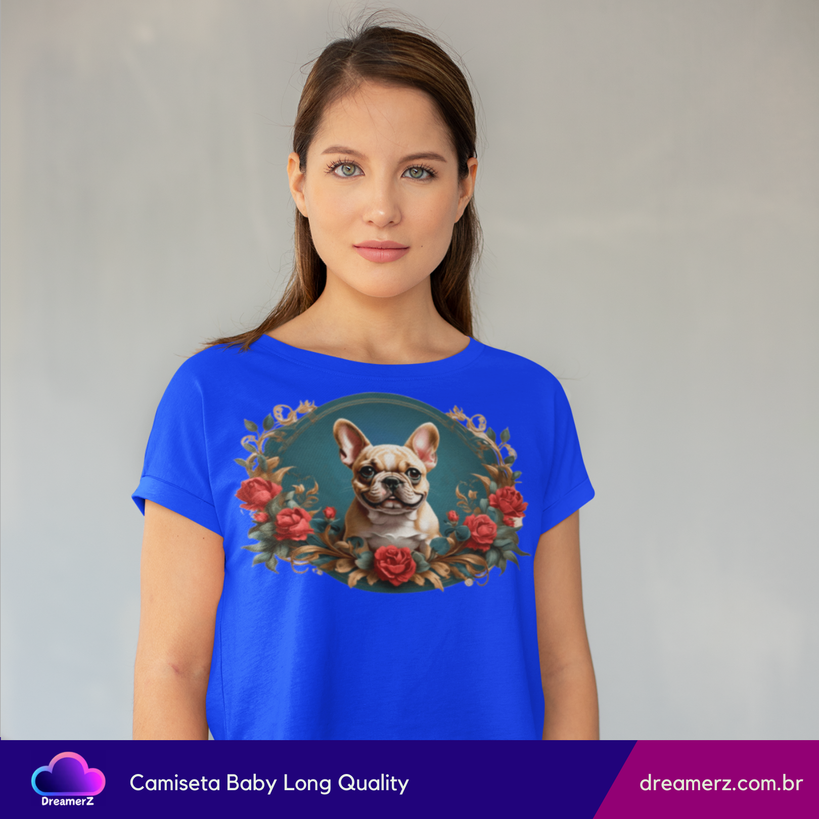 Essa estampa é puro amor e sofisticação! Um lindo bulldog francês, rodeado por um elegante arranjo de flores vermelhas, digno de um retrato clássico – direto para seu look do dia!