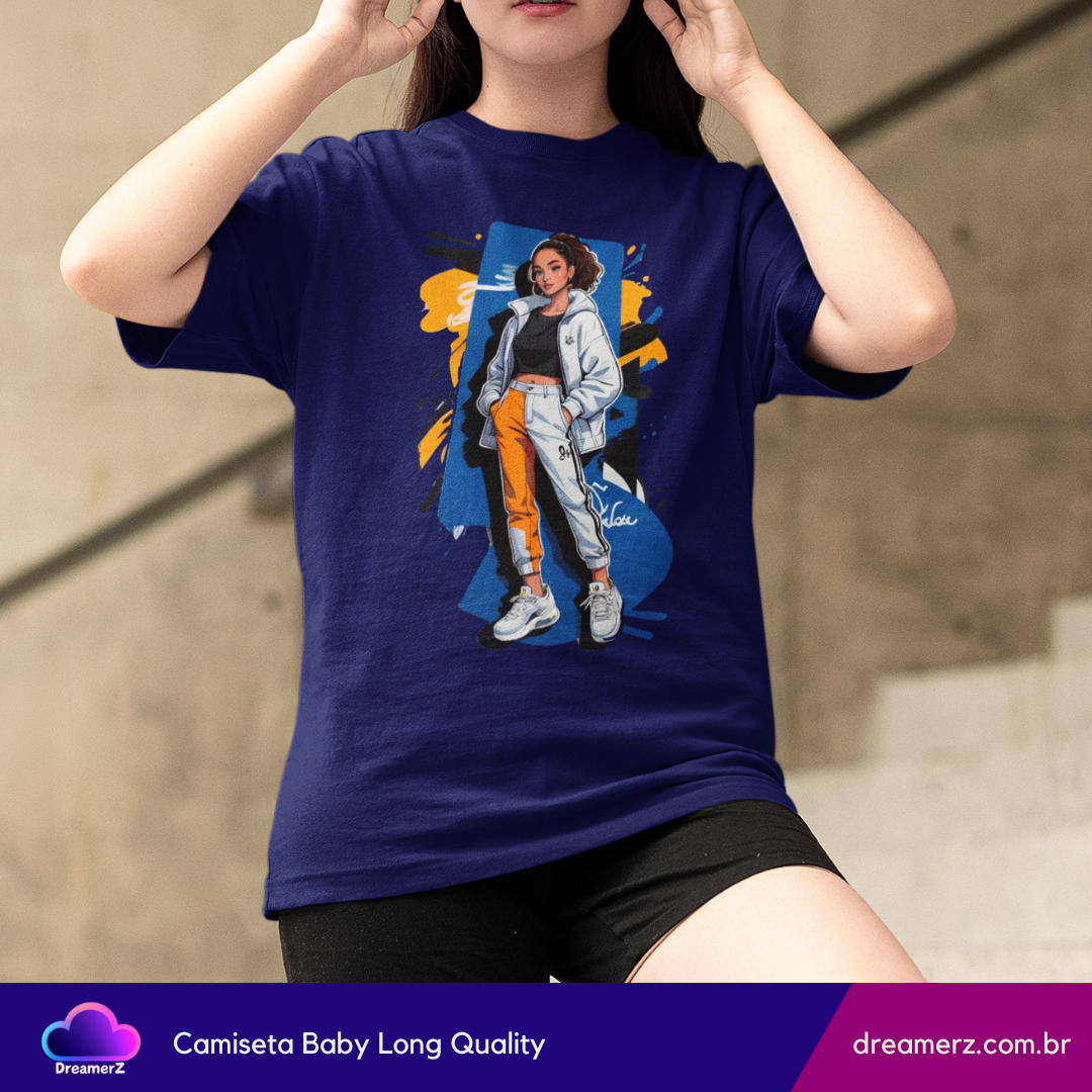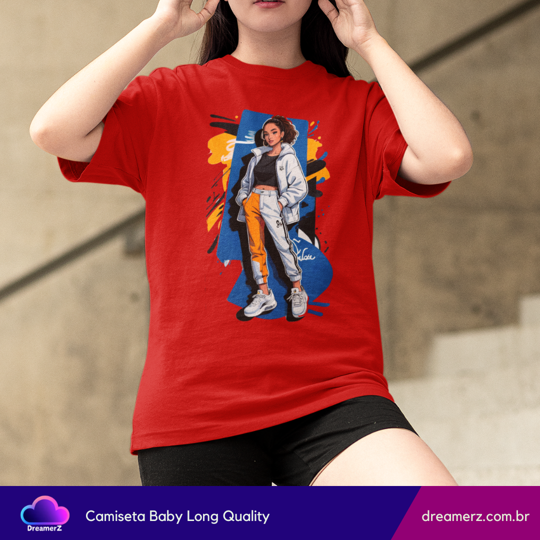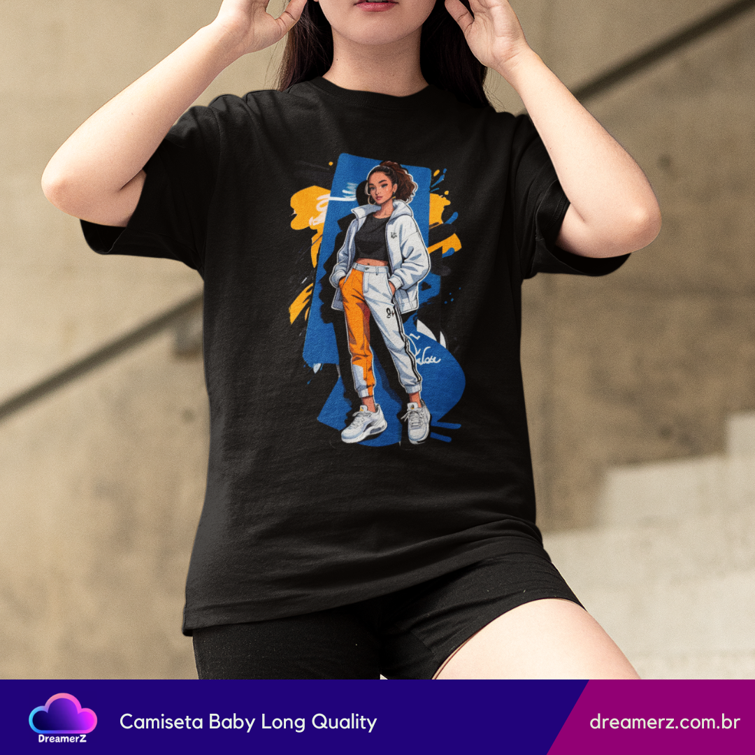 Com uma vibe urbana e moderna, a camiseta traz uma personagem forte, estilosa e cheia de personalidade, perfeita pra quem não passa despercebida.