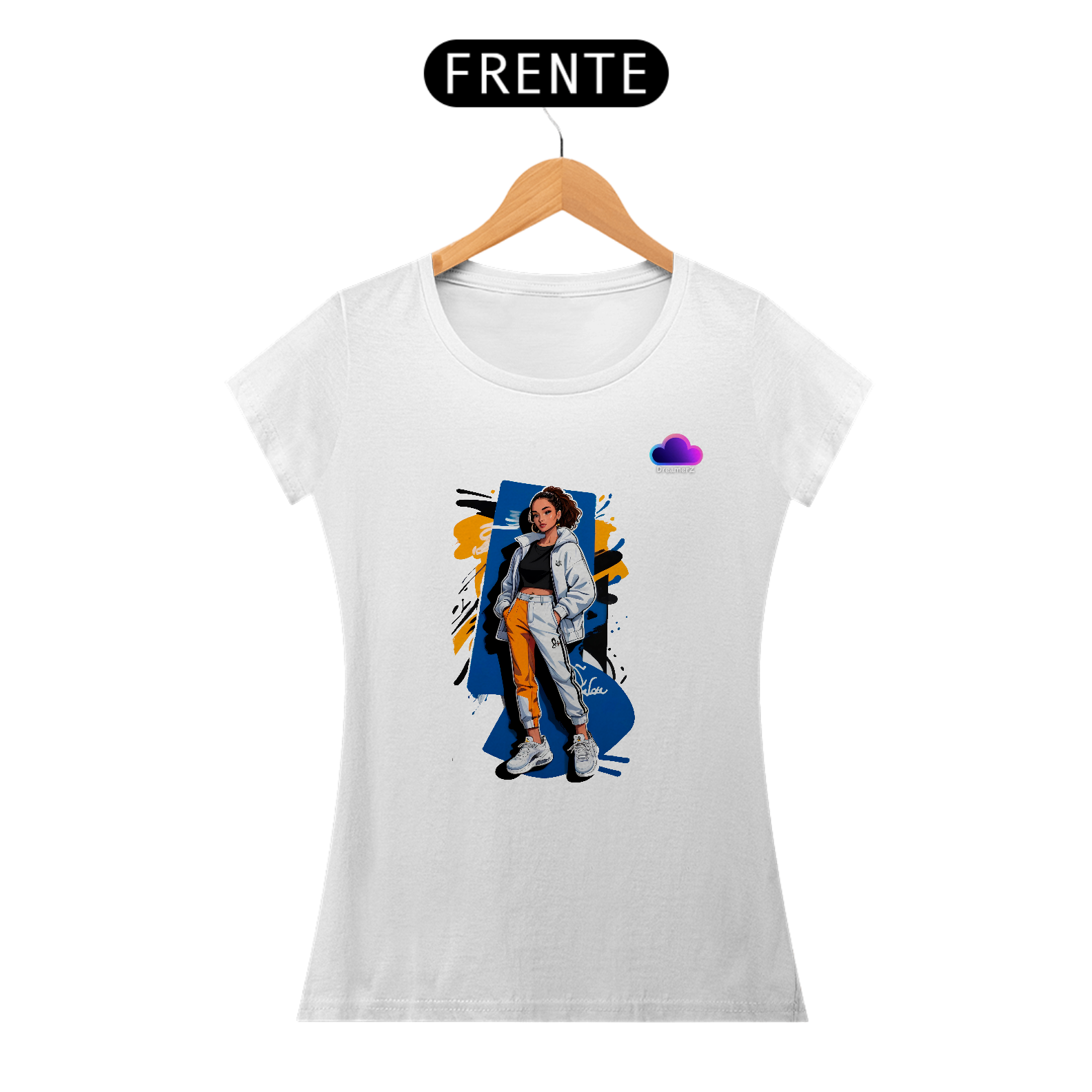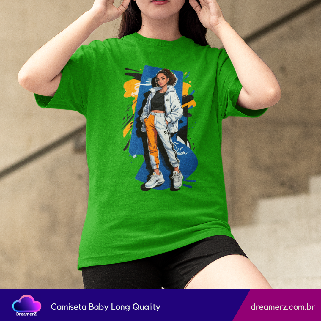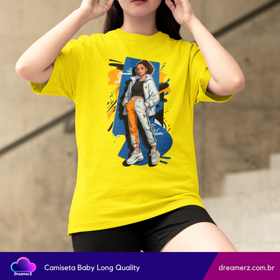 Com uma vibe urbana e moderna, a camiseta traz uma personagem forte, estilosa e cheia de personalidade, perfeita pra quem não passa despercebida.