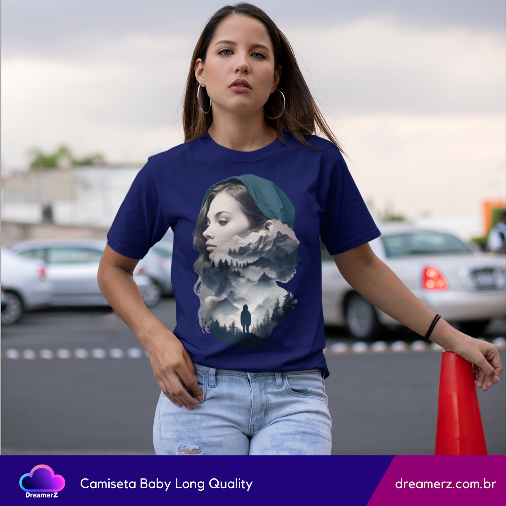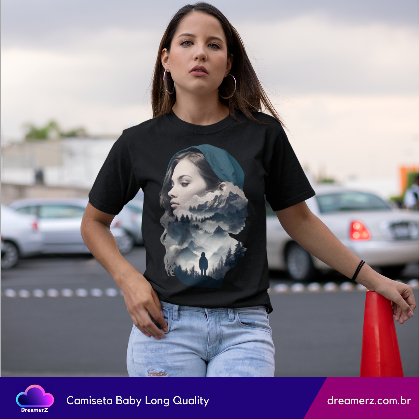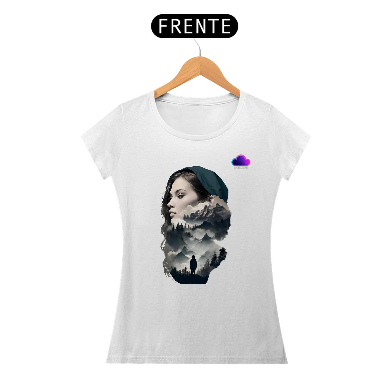 Uma fusão perfeita entre o retrato de uma mulher e a natureza selvagem. Essa estampa traz uma composição artística que mistura o rosto sereno de uma mulher com paisagens montanhosas e florestas sombreadas – como se sua mente fosse um universo inteiro a ser explorado.