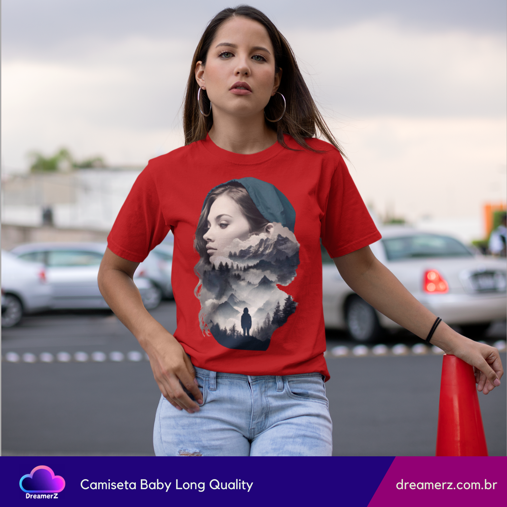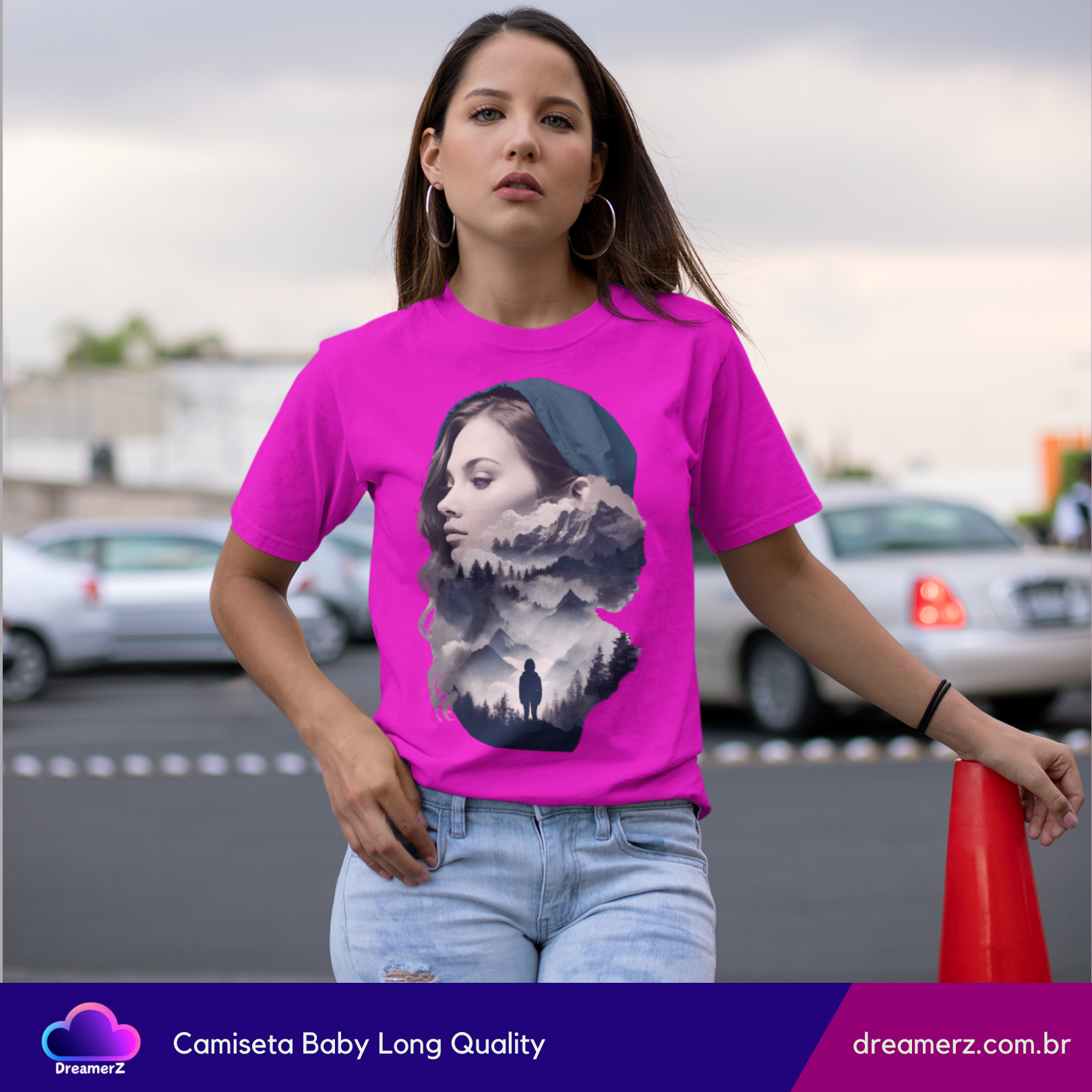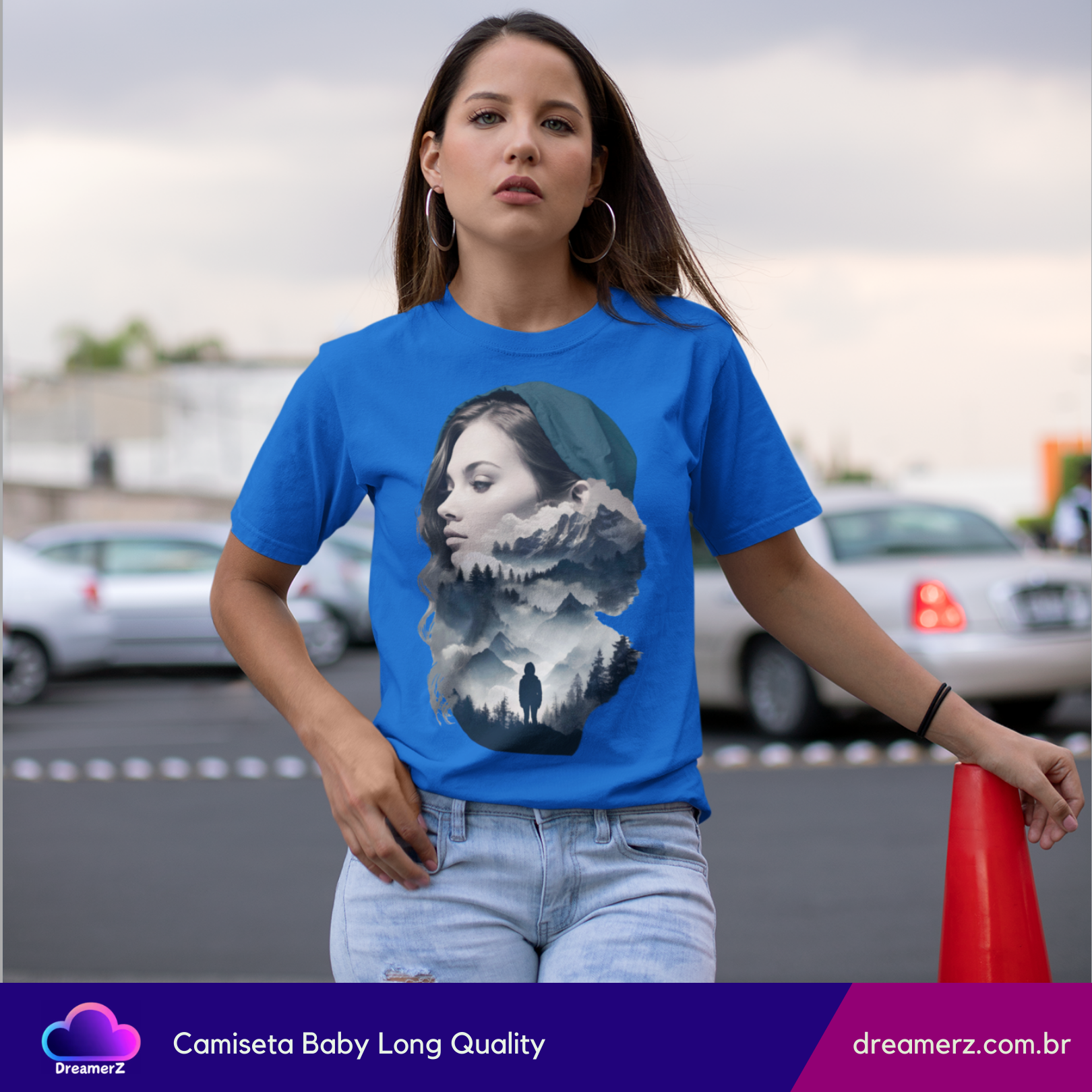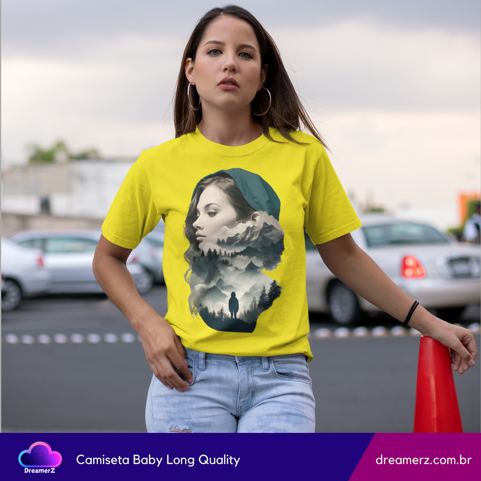 Uma fusão perfeita entre o retrato de uma mulher e a natureza selvagem. Essa estampa traz uma composição artística que mistura o rosto sereno de uma mulher com paisagens montanhosas e florestas sombreadas – como se sua mente fosse um universo inteiro a ser explorado.