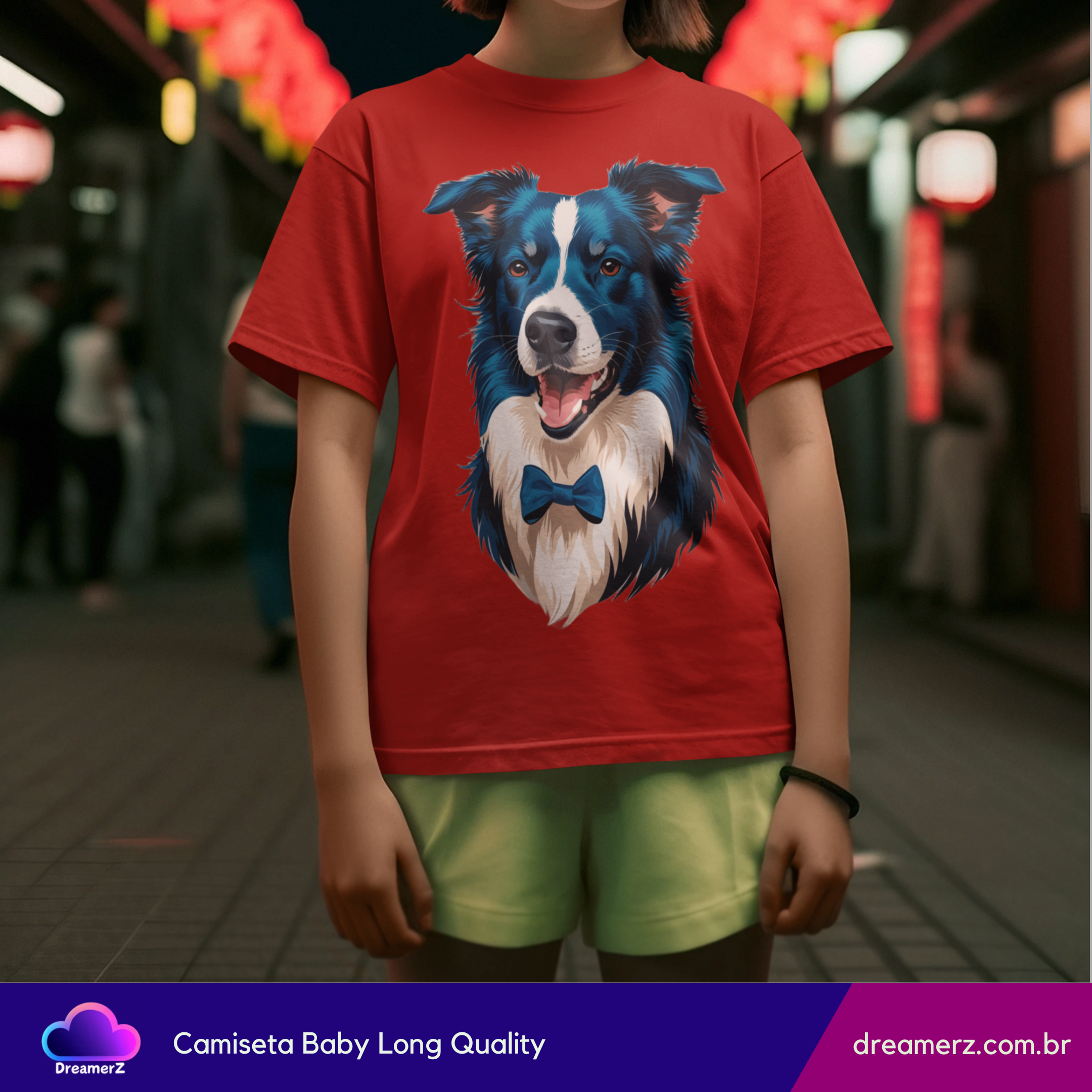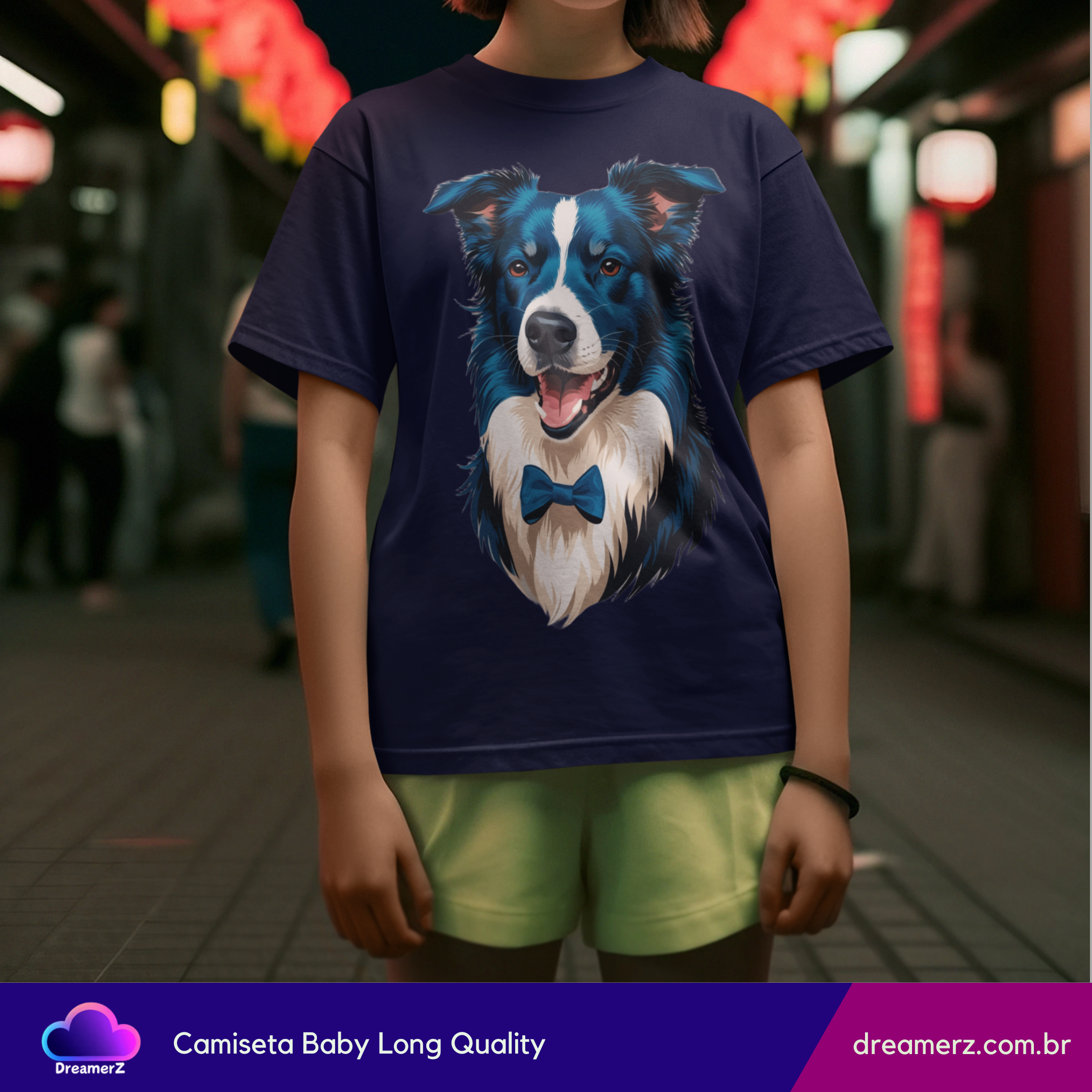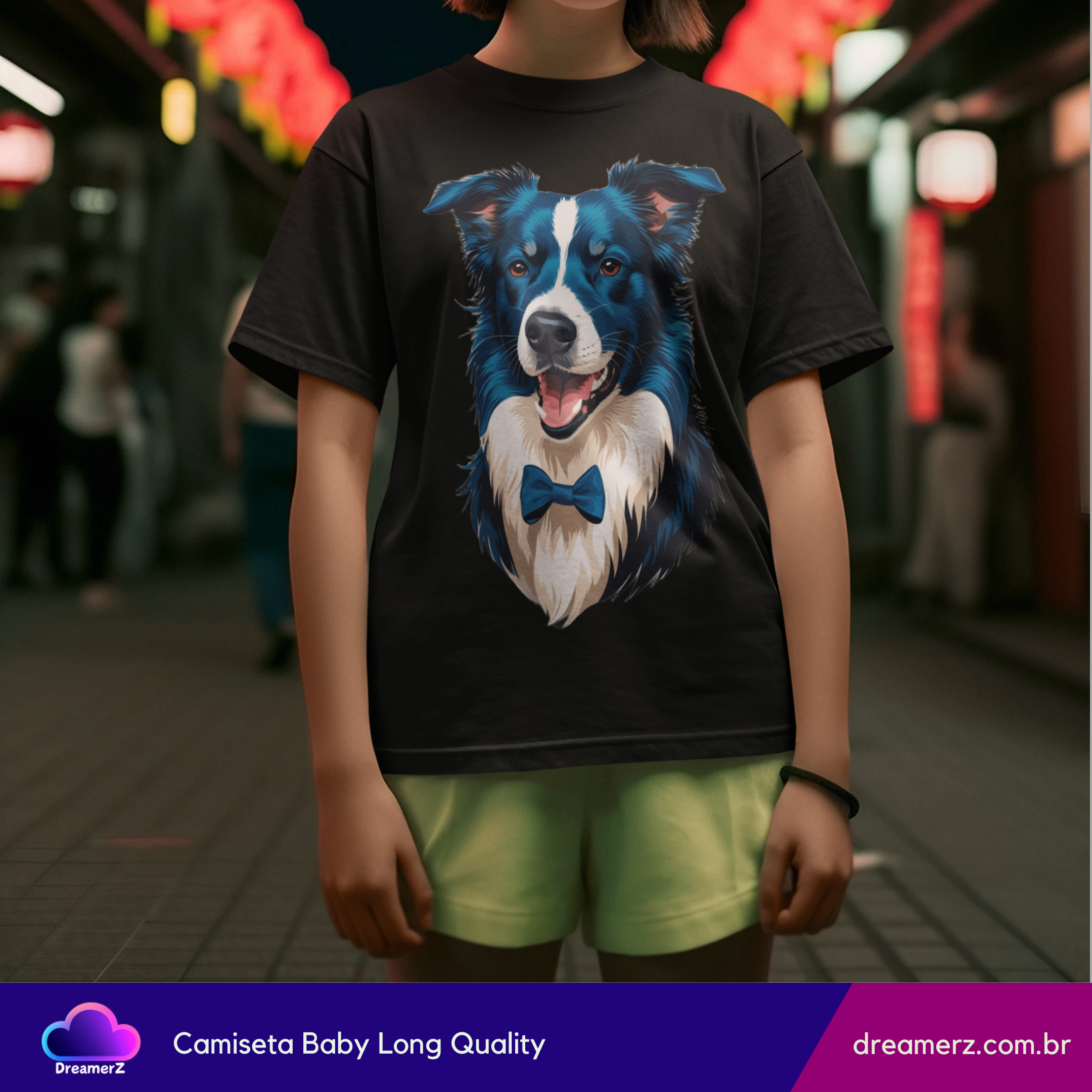 Com um olhar amigável, pelos azuis vibrantes e uma gravatinha borboleta, essa camiseta é a escolha perfeita para quem ama animais com personalidade e atitude.
