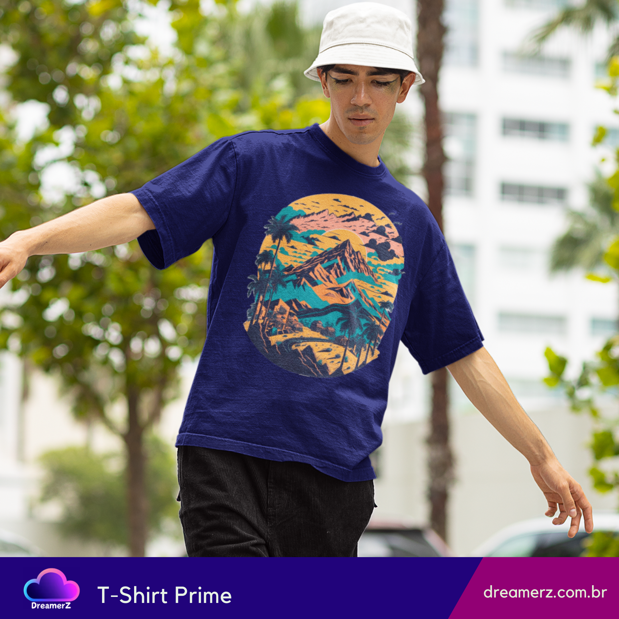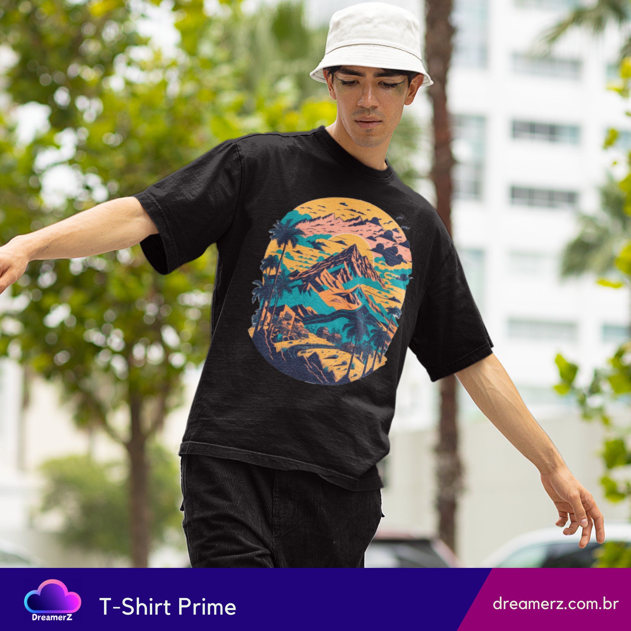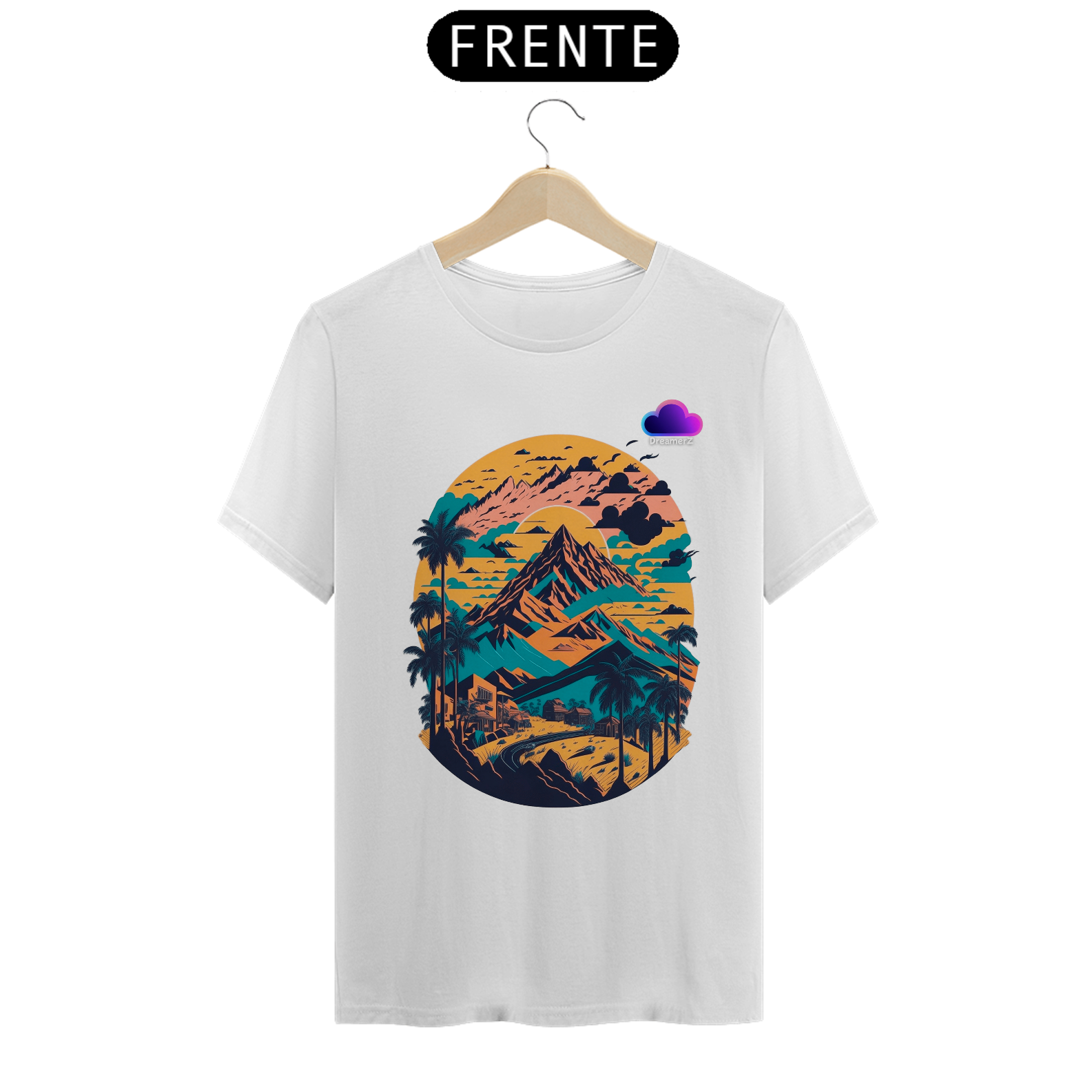 Com uma composição artística que mistura montanhas, palmeiras e um céu em tons de pôr do sol, essa estampa evoca viagens, liberdade e aquele sentimento de estrada sem fim.
