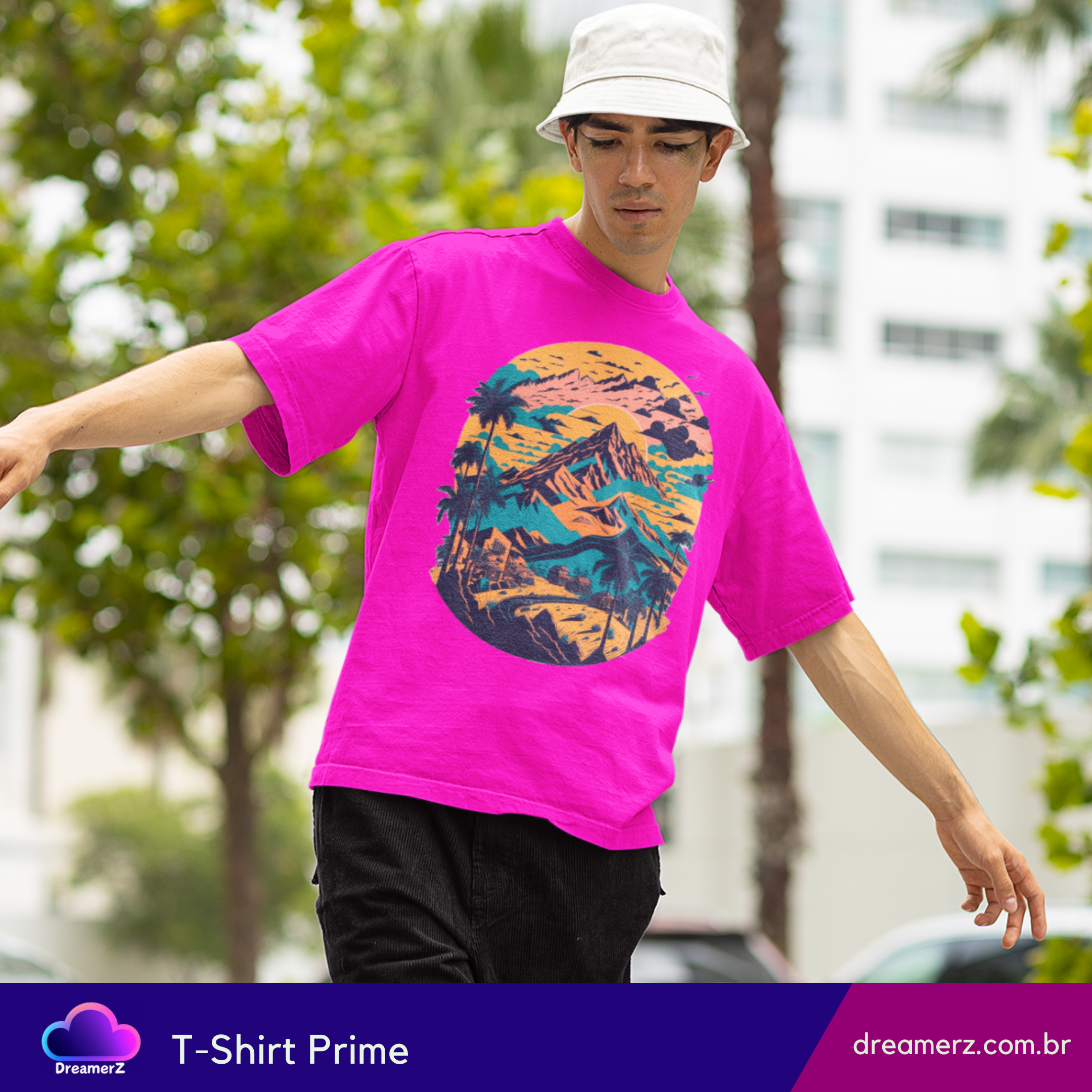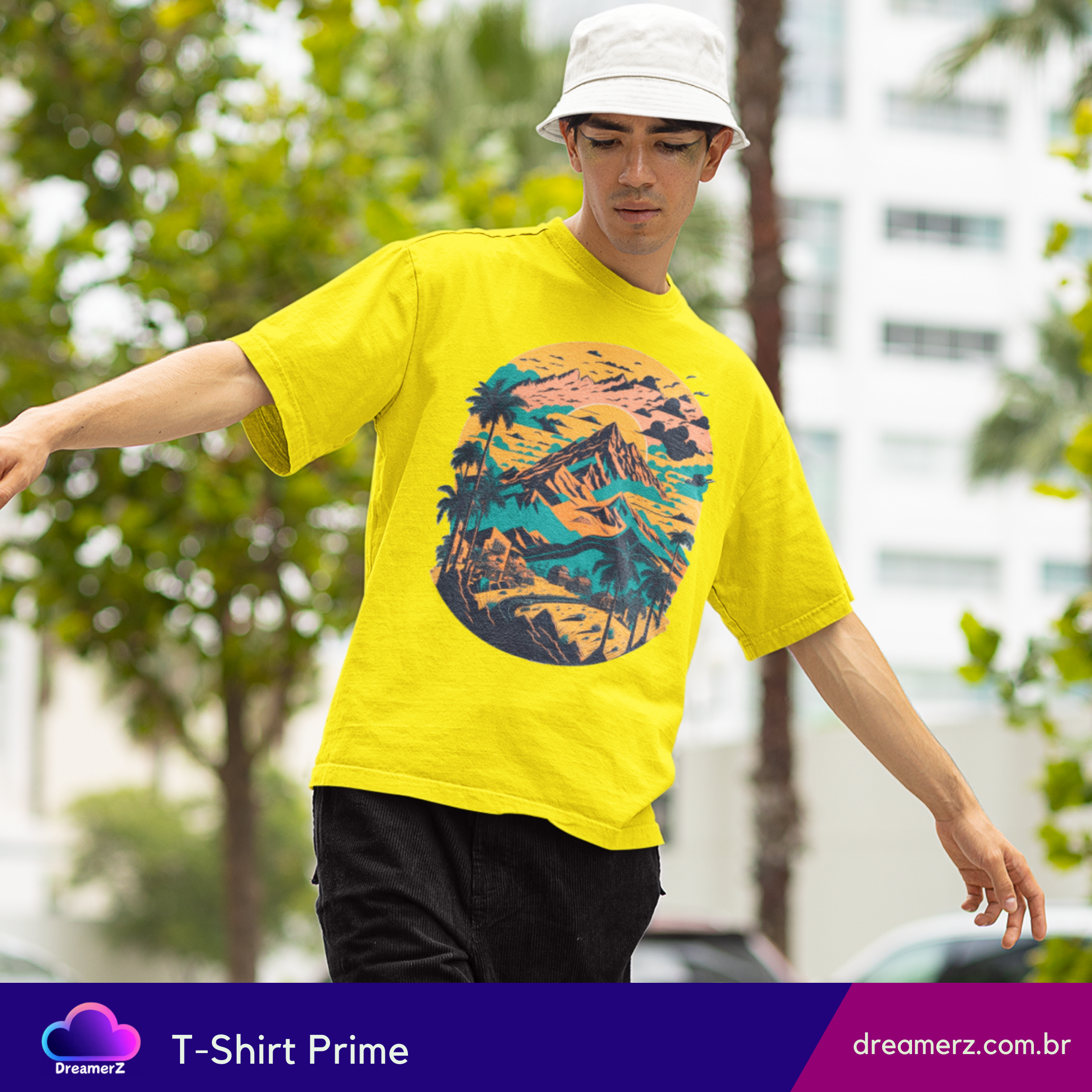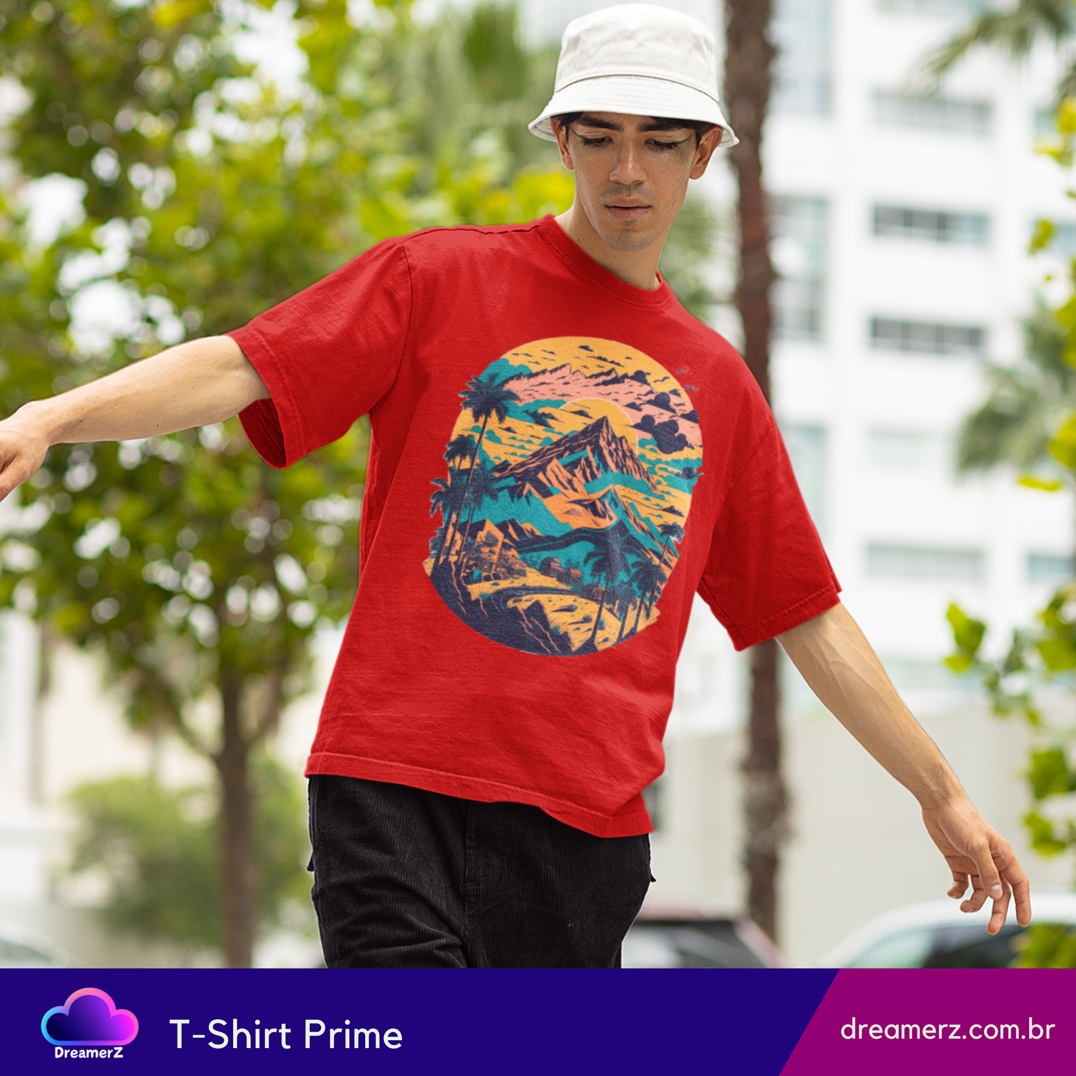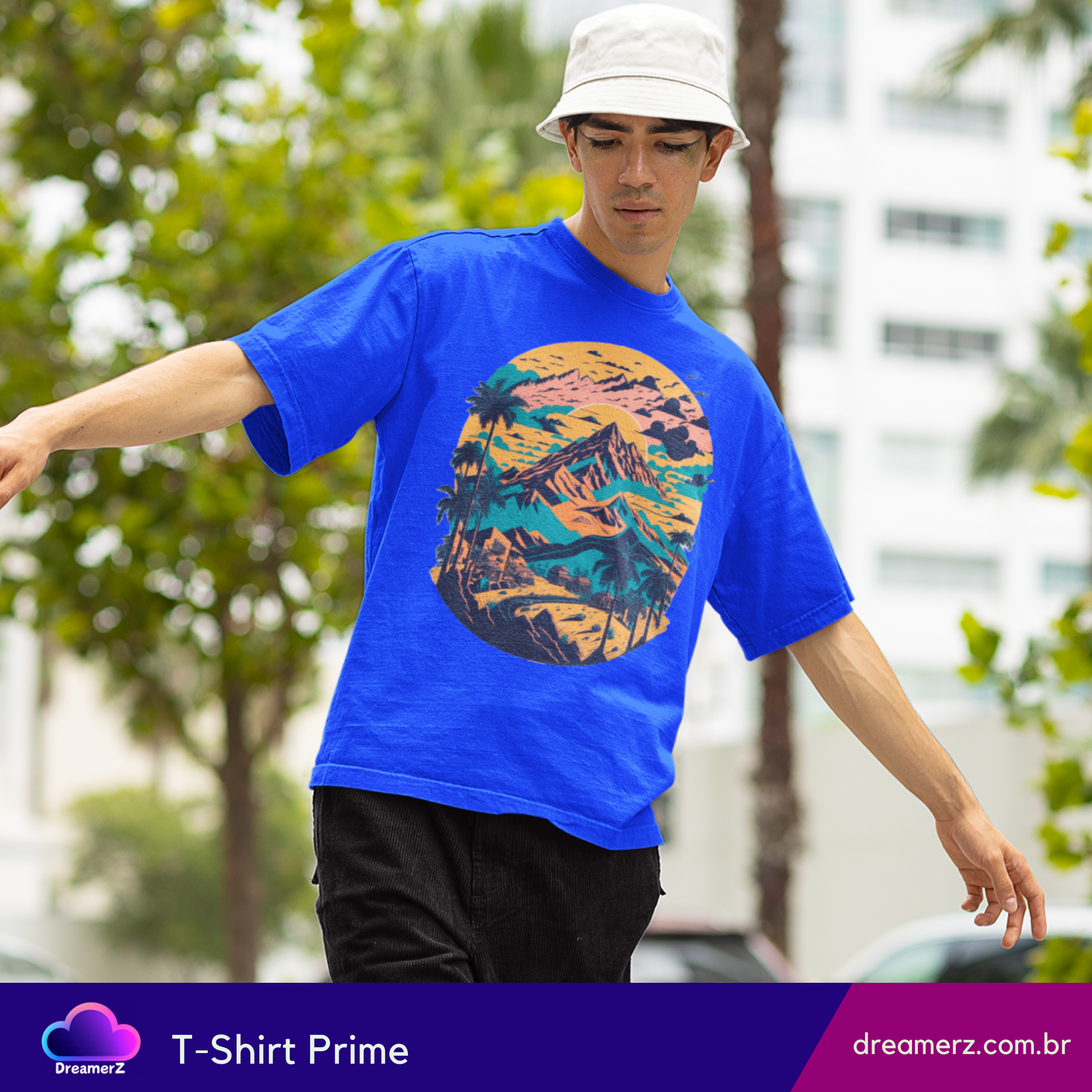 Com uma composição artística que mistura montanhas, palmeiras e um céu em tons de pôr do sol, essa estampa evoca viagens, liberdade e aquele sentimento de estrada sem fim.