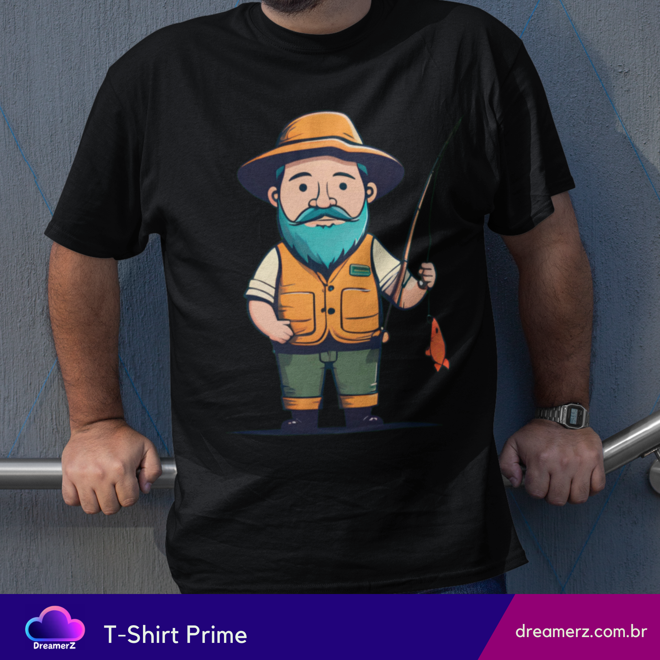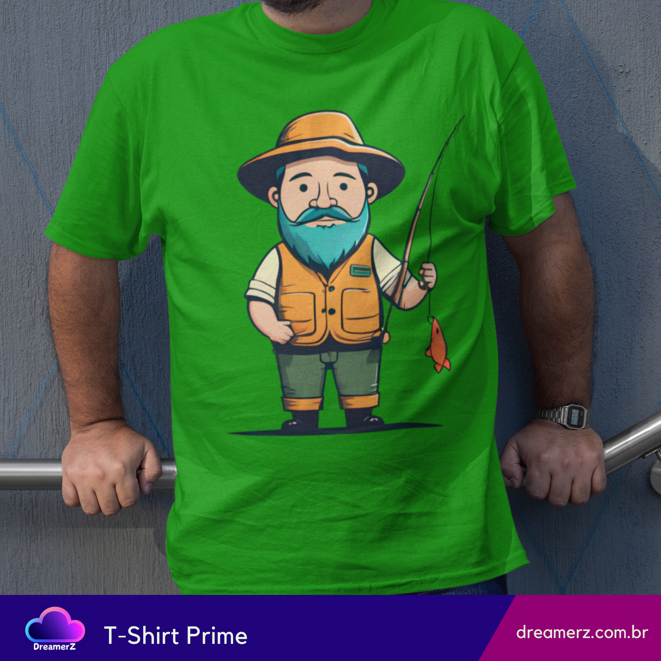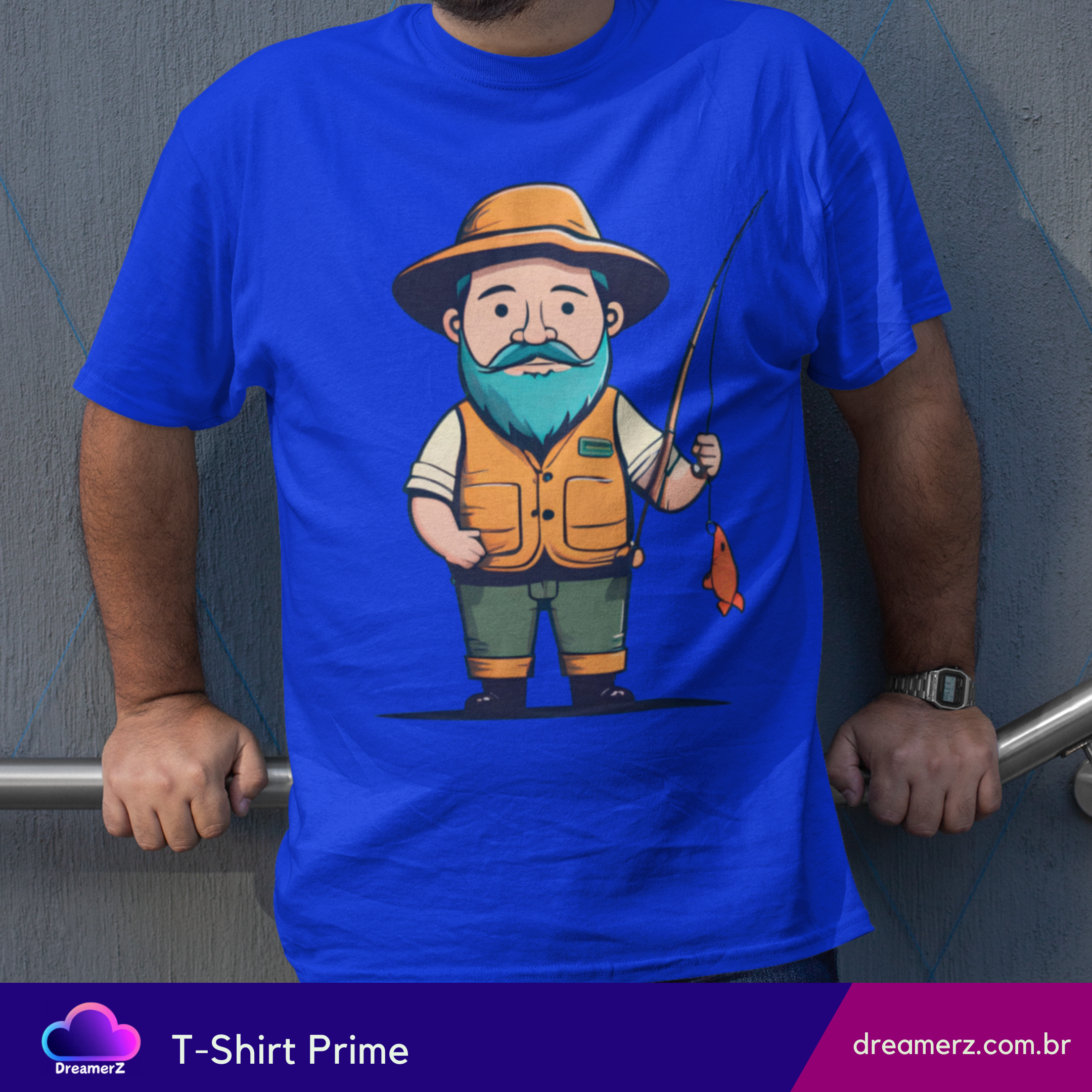Essa estampa divertida traz um pescador carismático com barba azul, chapéu de explorador e um peixinho já fisgado. Ideal pra quem ama o mato, o rio e aquela vibe de final de semana no sossego total!