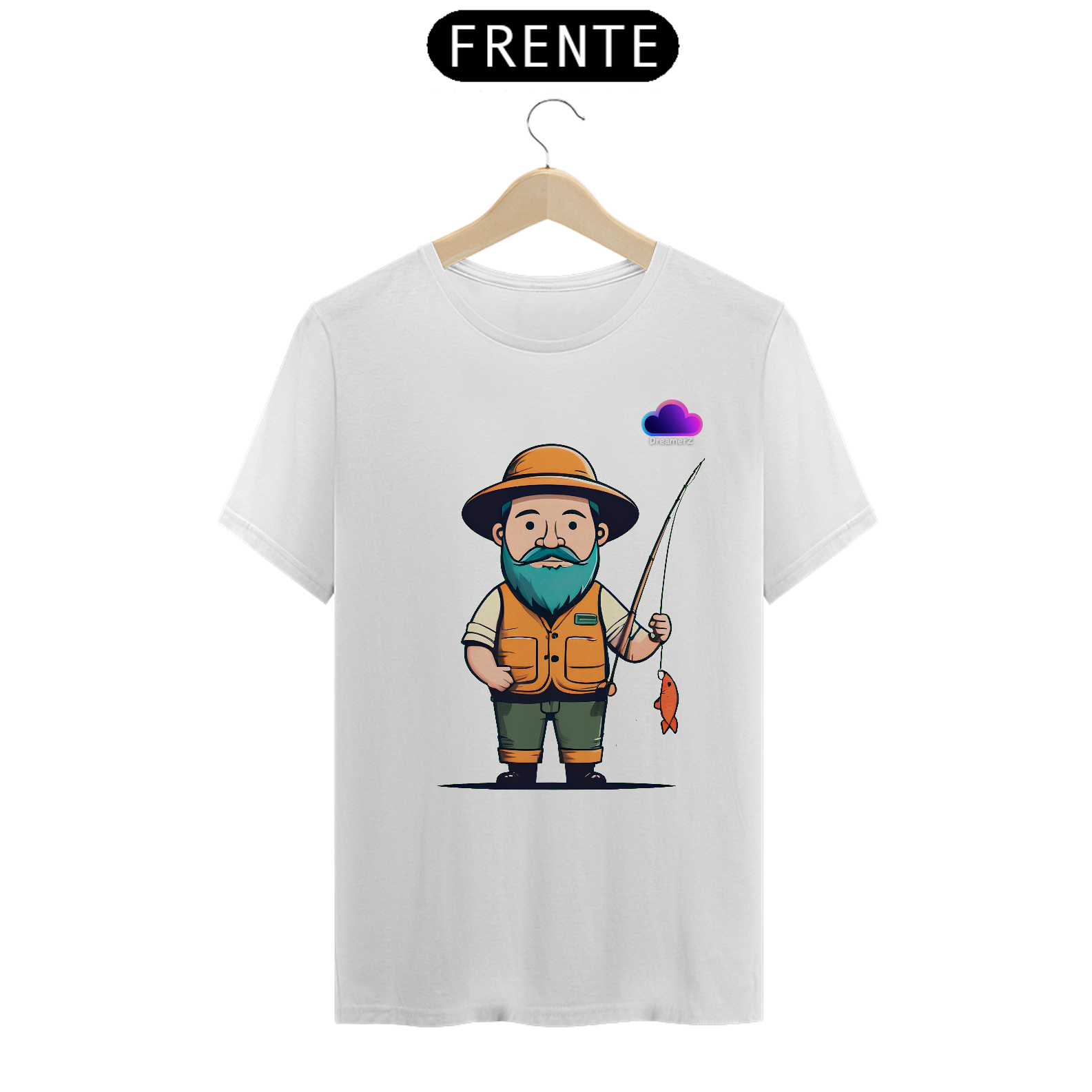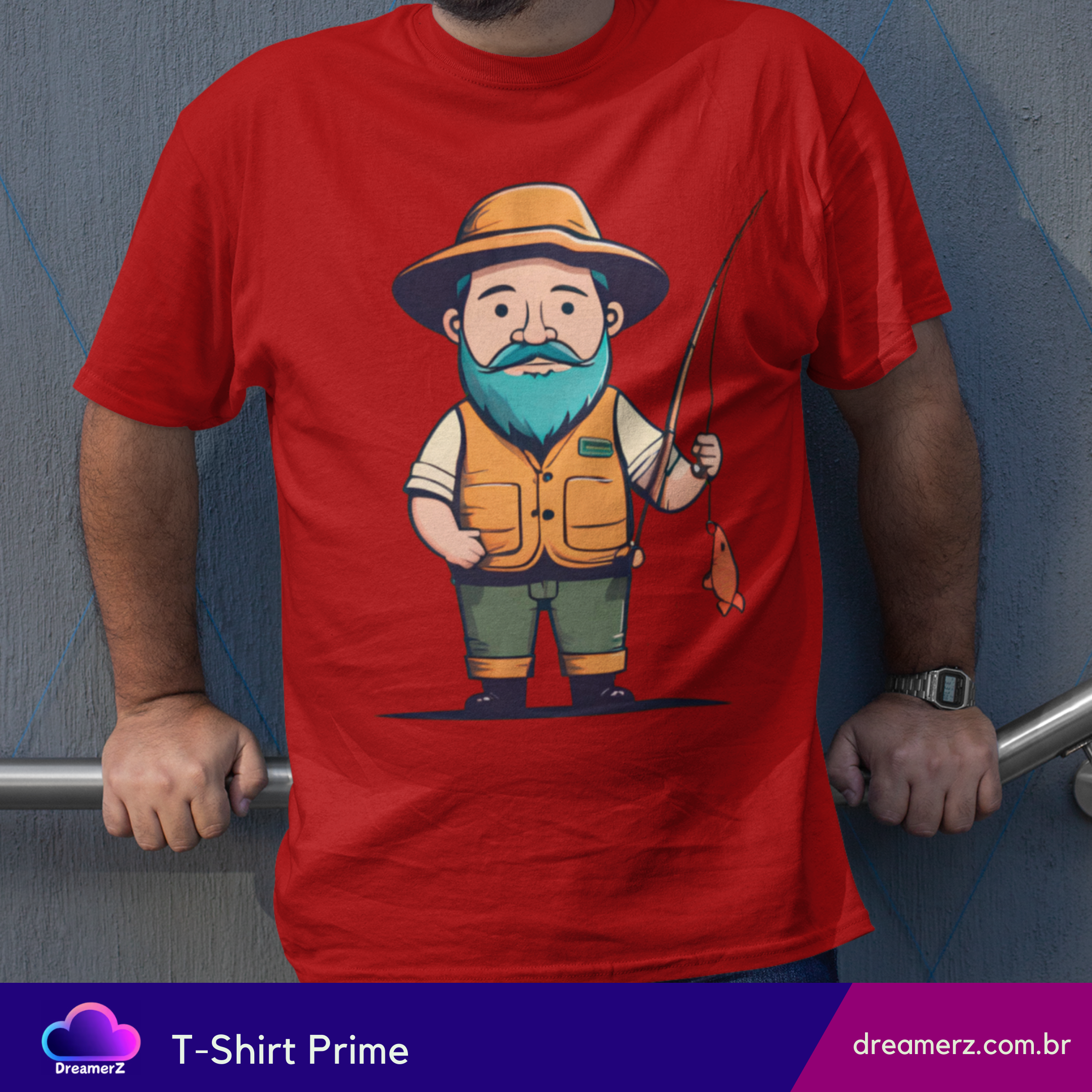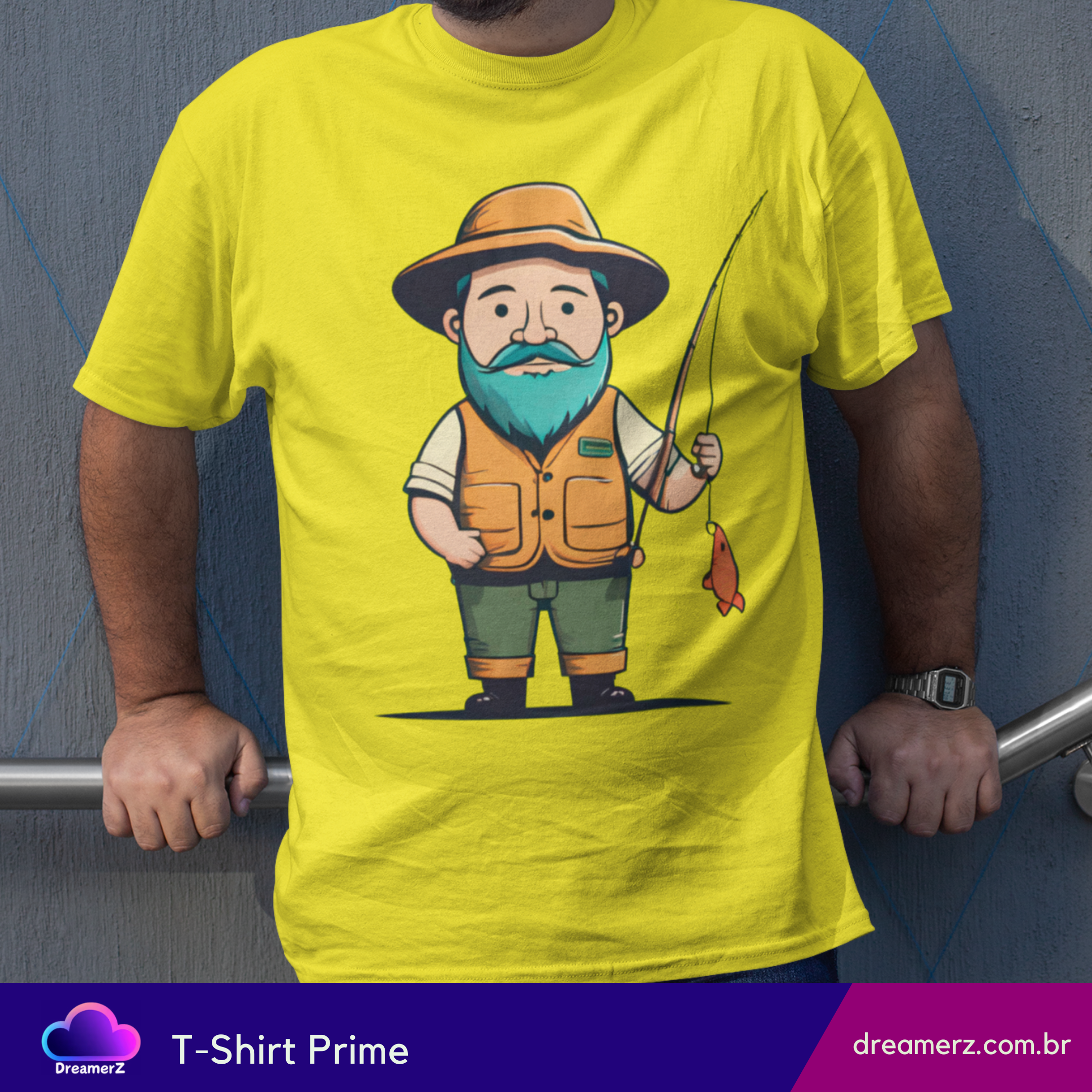 Essa estampa divertida traz um pescador carismático com barba azul, chapéu de explorador e um peixinho já fisgado. Ideal pra quem ama o mato, o rio e aquela vibe de final de semana no sossego total!