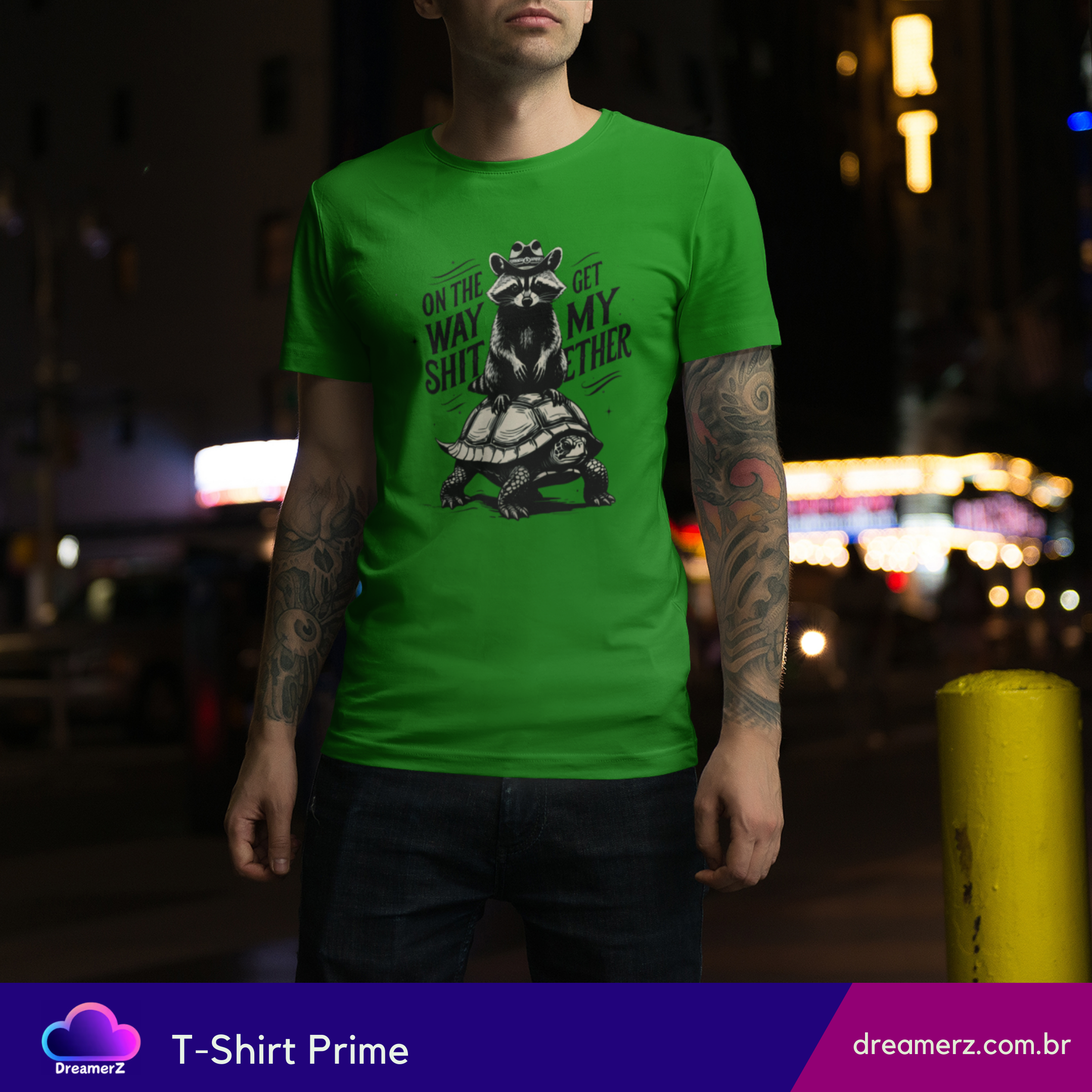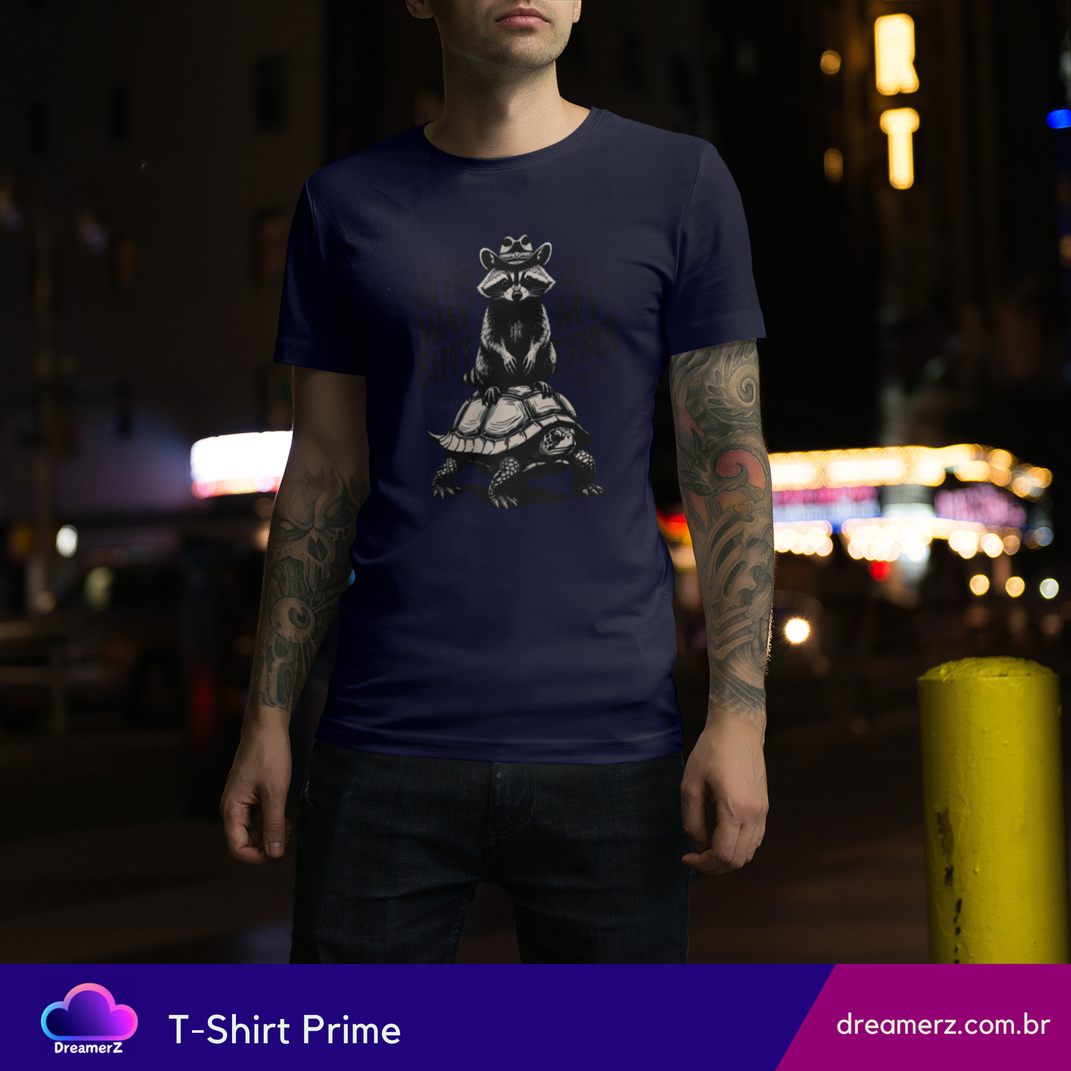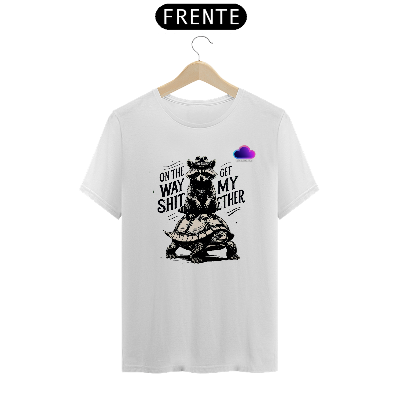 Com um guaxinim estiloso de chapéu montado numa tartaruga e a frase sarcástica "On the way to get my sht together"*, essa camiseta é um lembrete bem-humorado de que cada um tem seu ritmo.