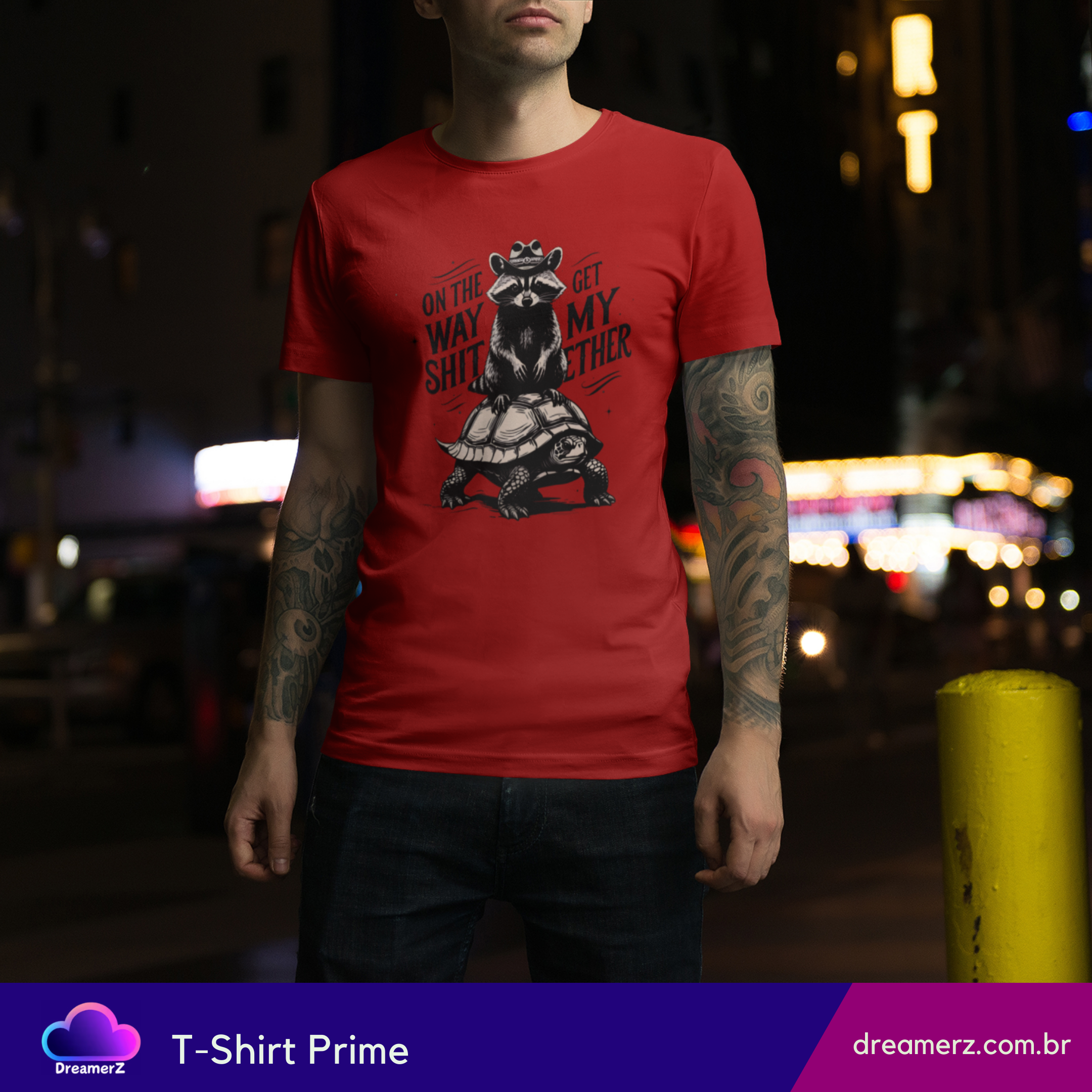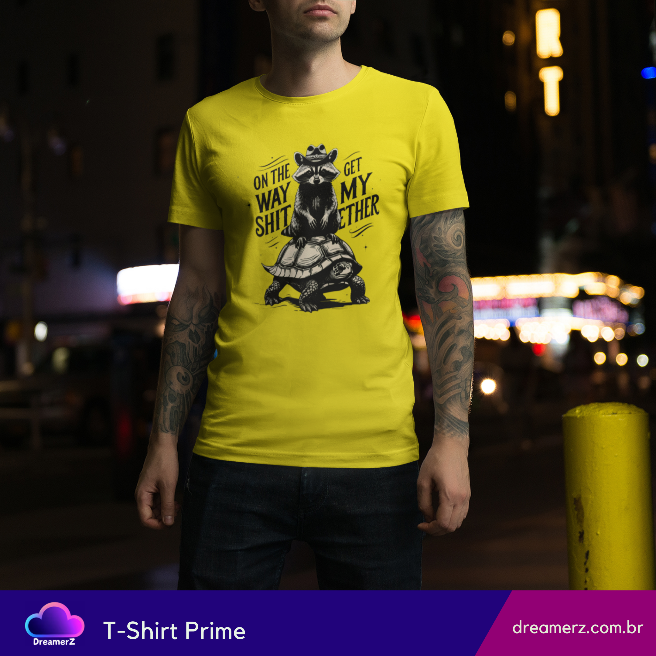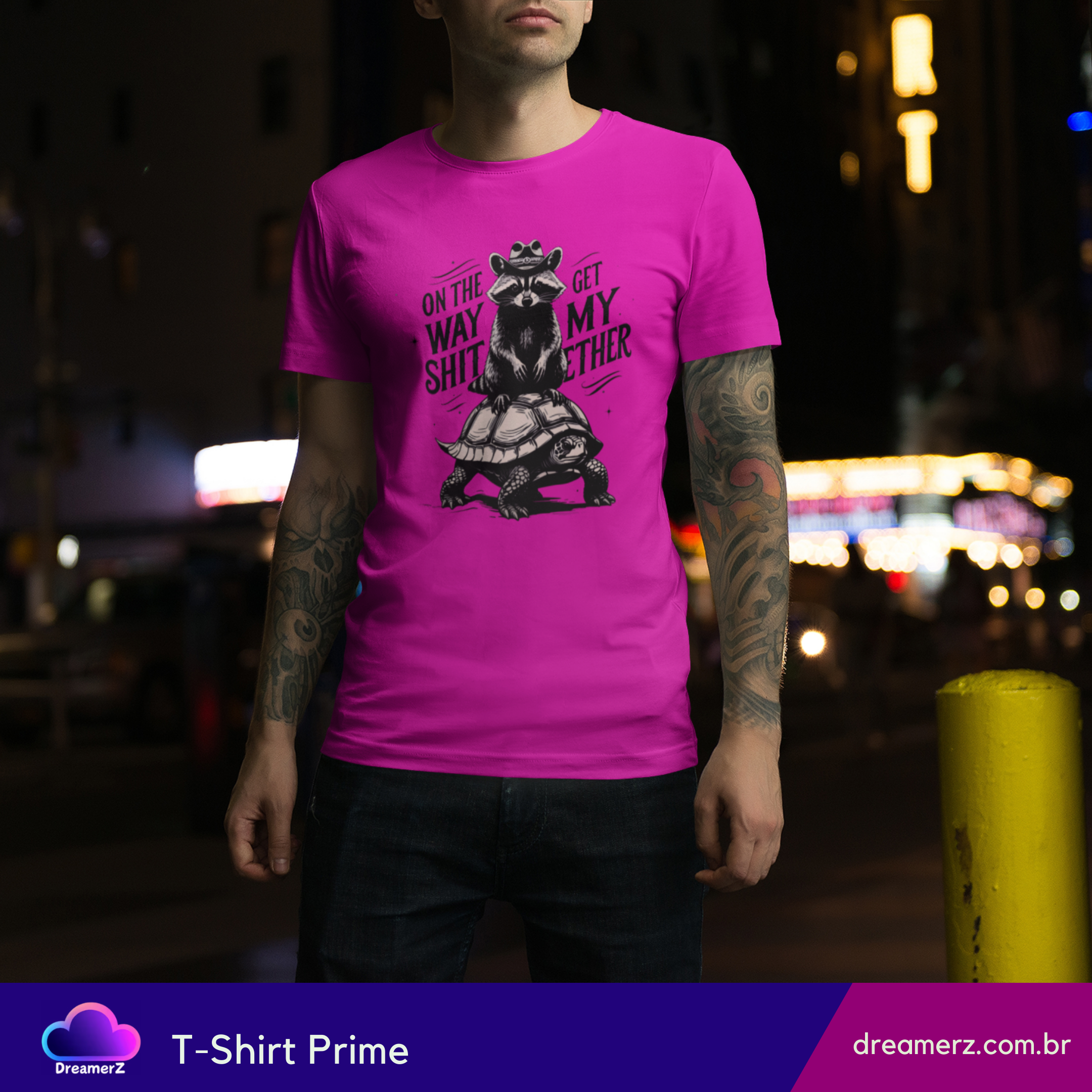 Com um guaxinim estiloso de chapéu montado numa tartaruga e a frase sarcástica "On the way to get my sht together"*, essa camiseta é um lembrete bem-humorado de que cada um tem seu ritmo.