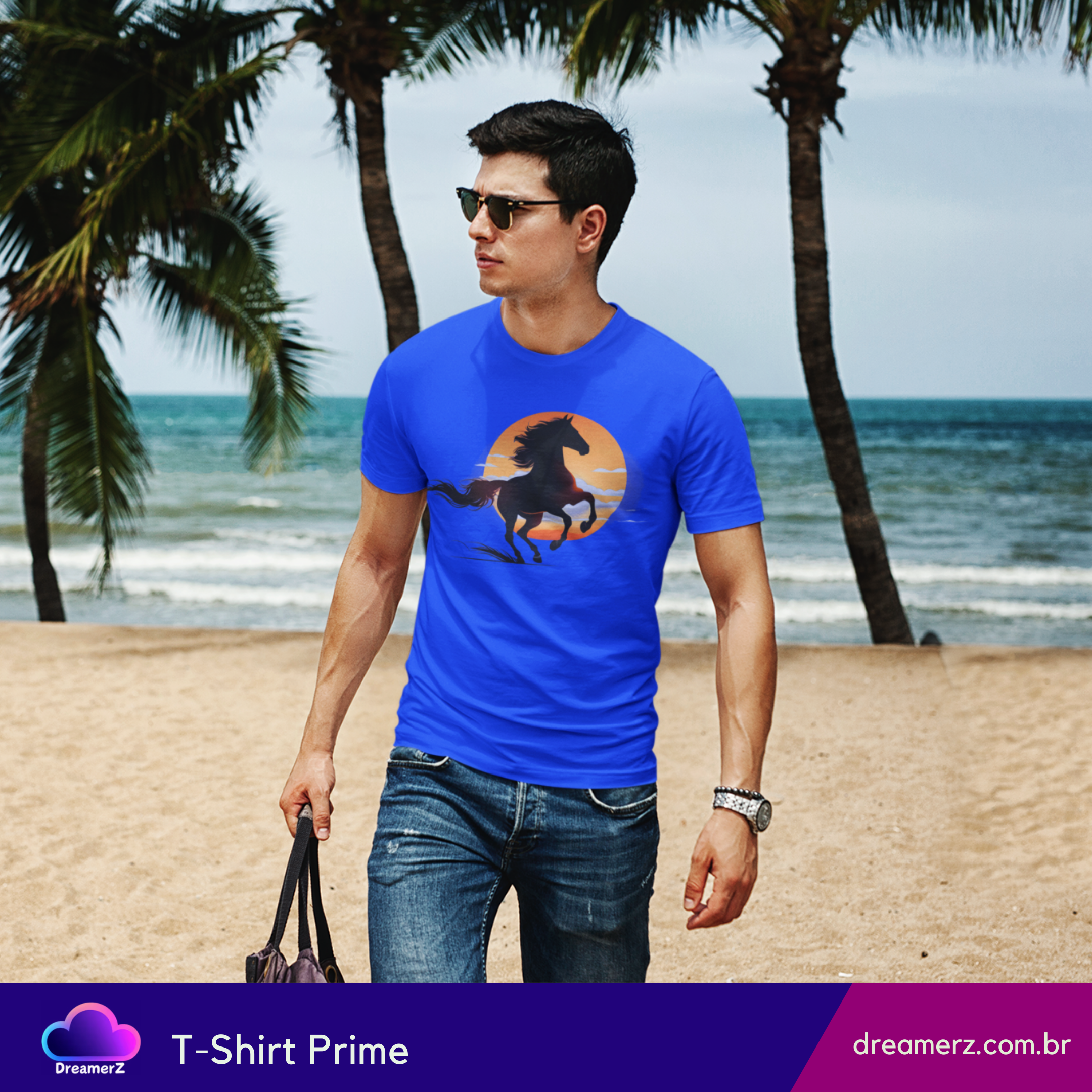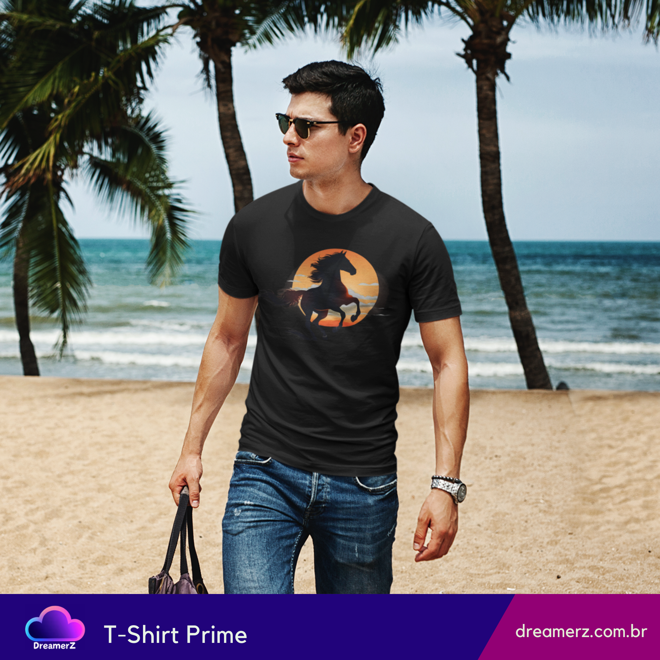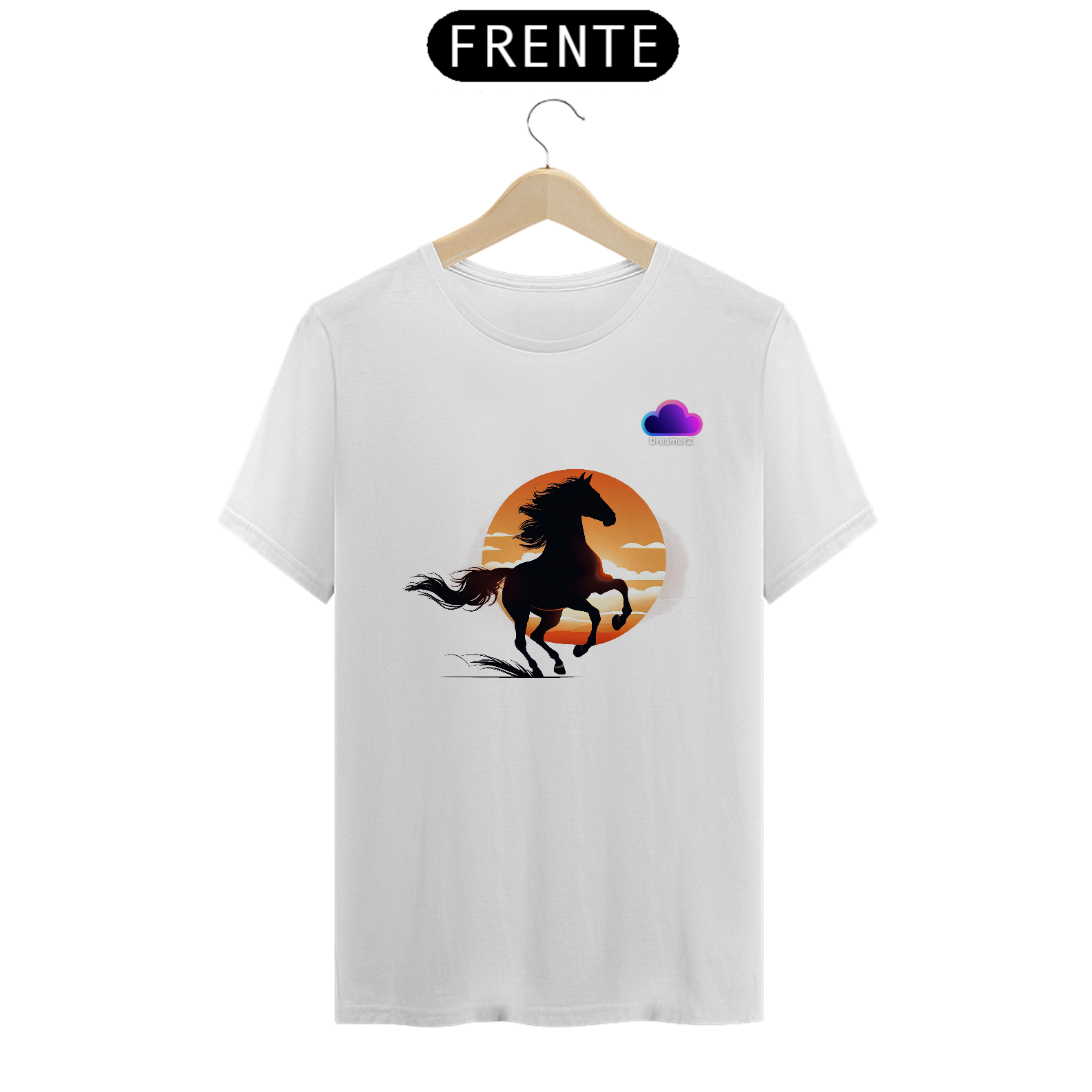 Essa estampa traz um cavalo galopando com força e elegância contra um pôr do sol alaranjado — uma verdadeira homenagem à liberdade e à força da natureza.