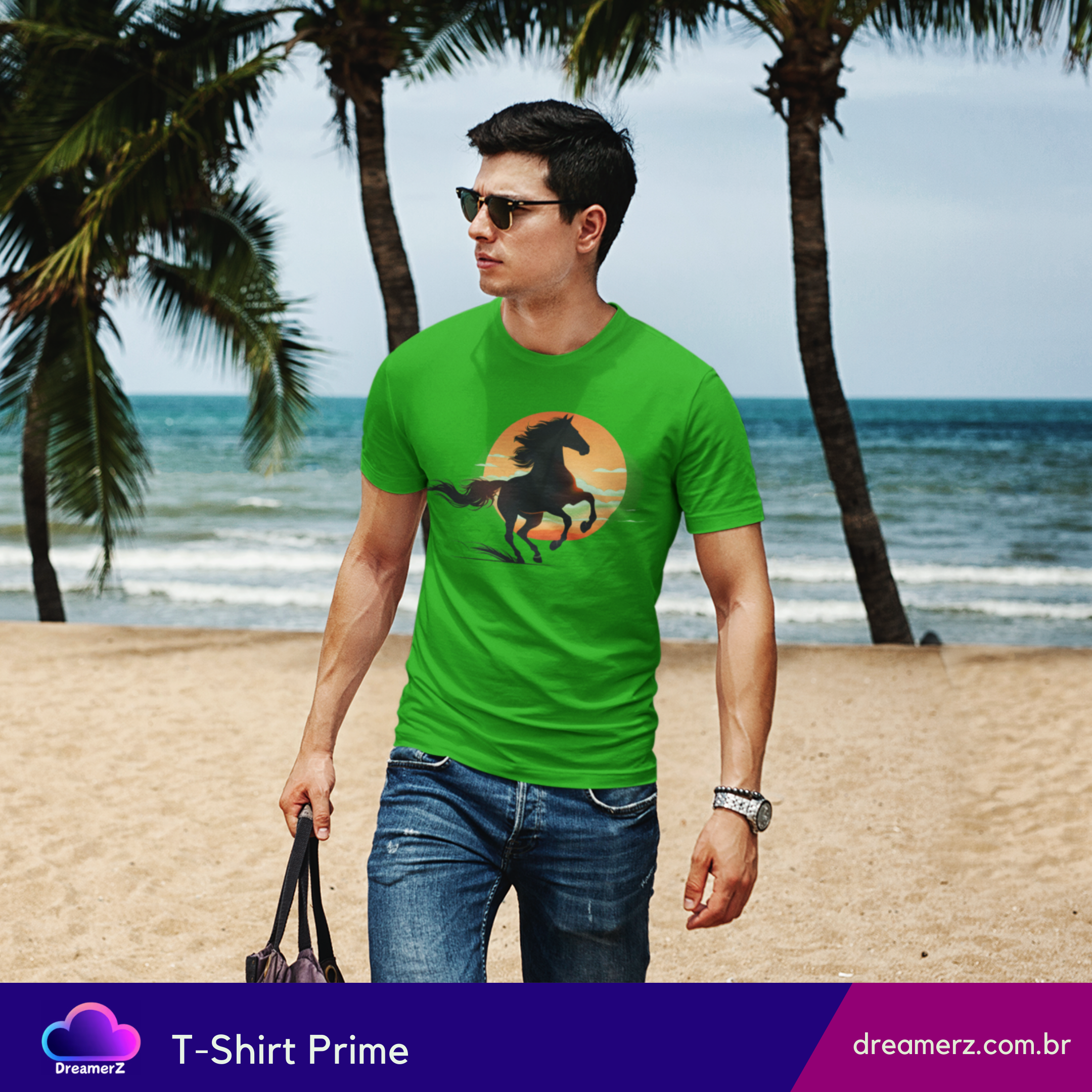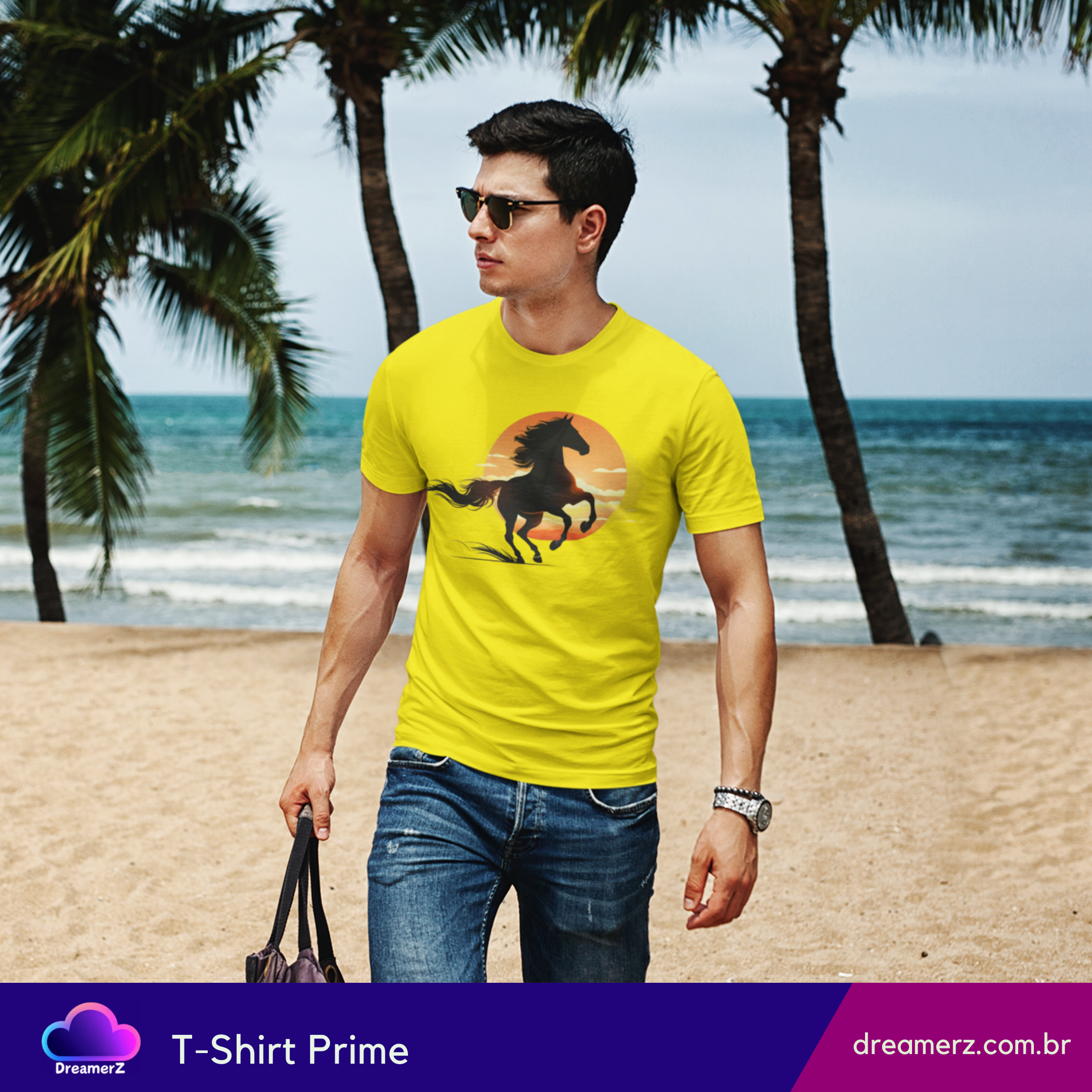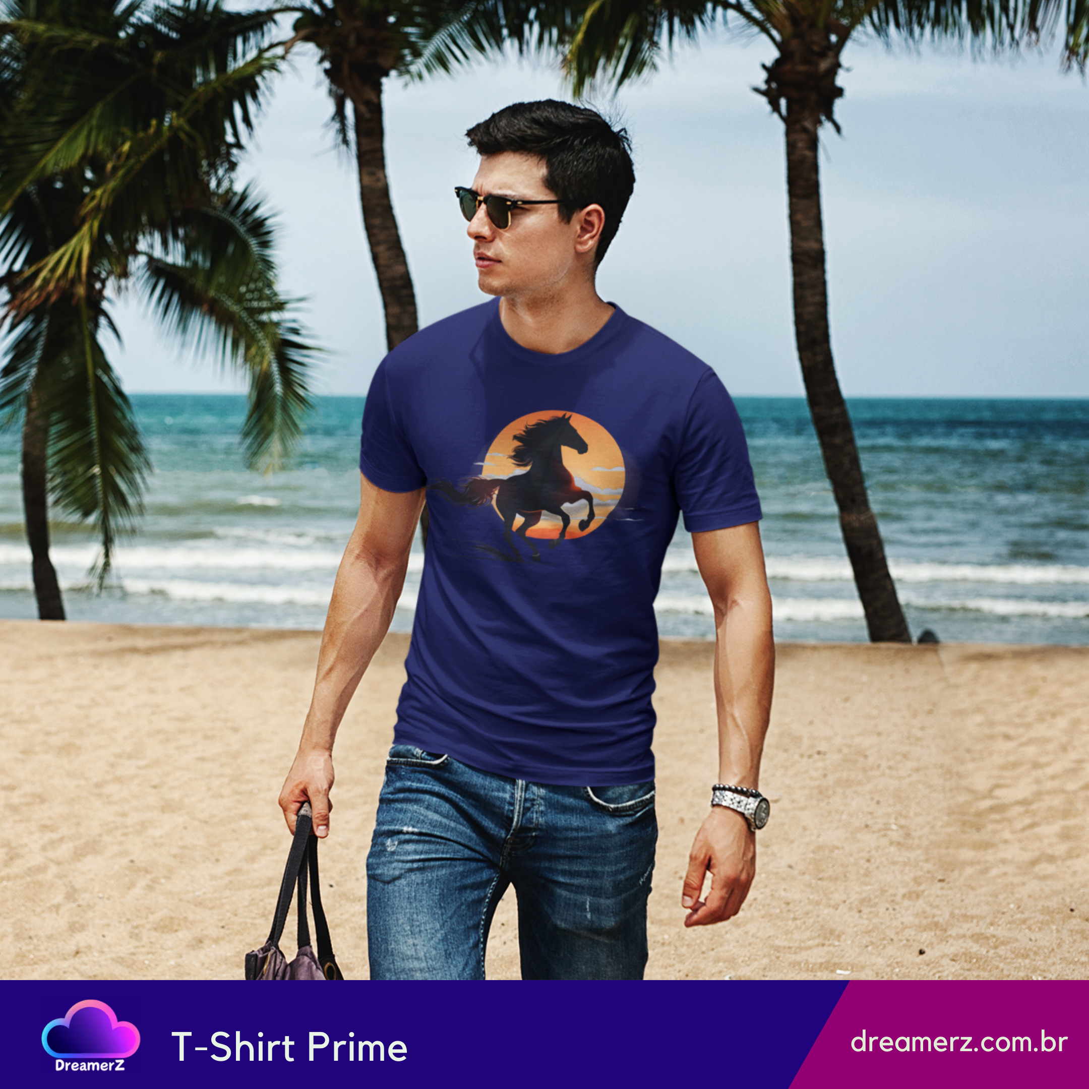 Essa estampa traz um cavalo galopando com força e elegância contra um pôr do sol alaranjado — uma verdadeira homenagem à liberdade e à força da natureza.