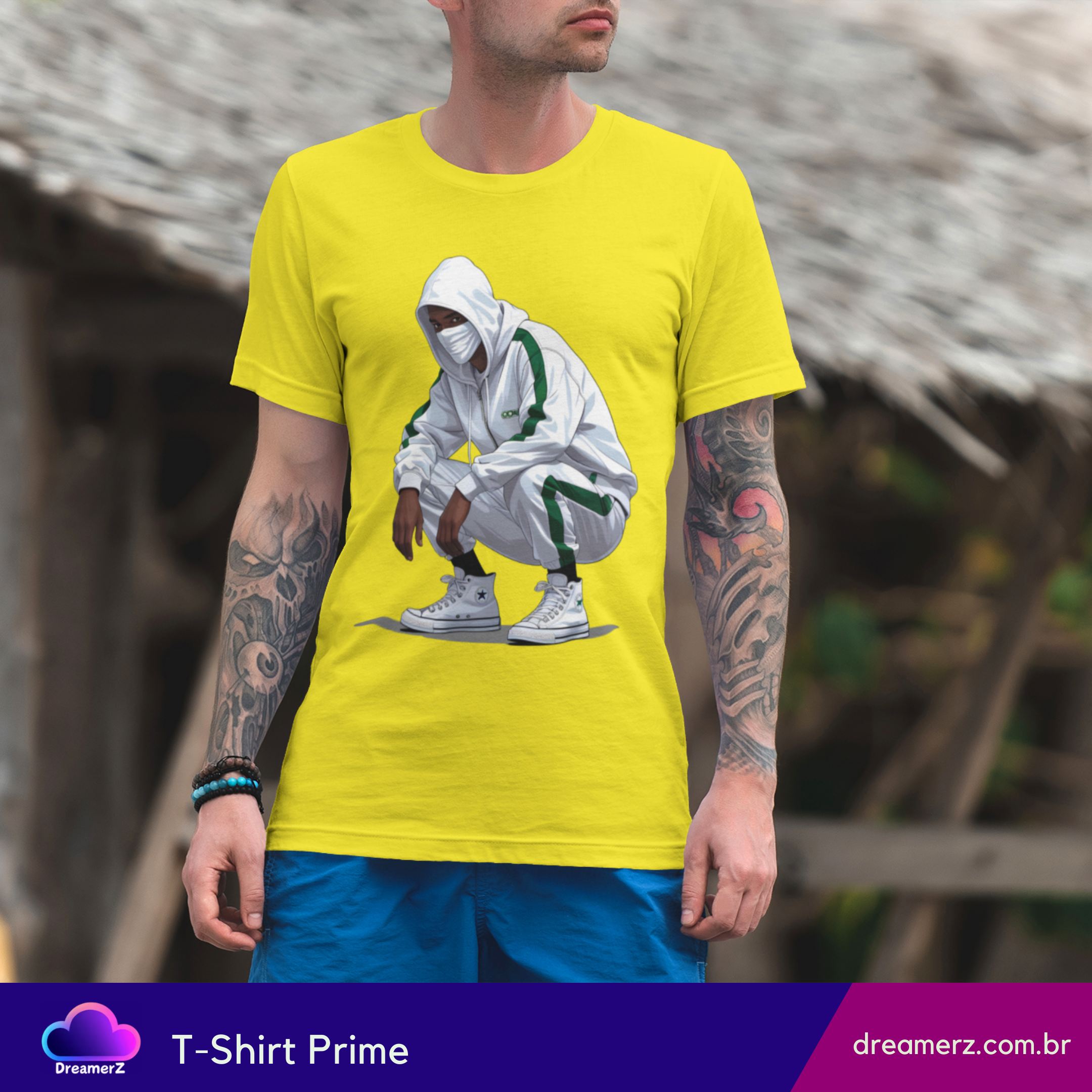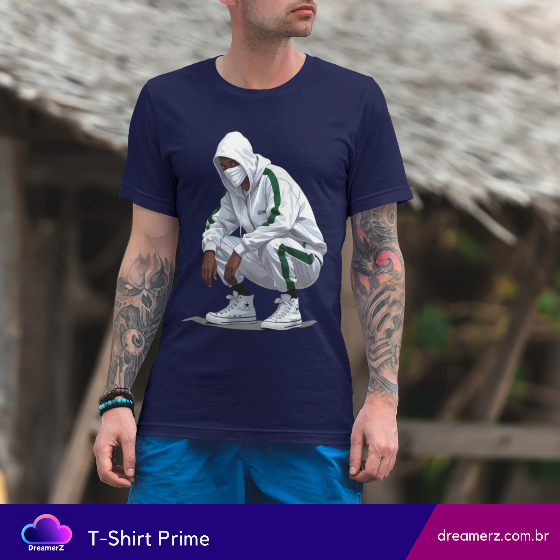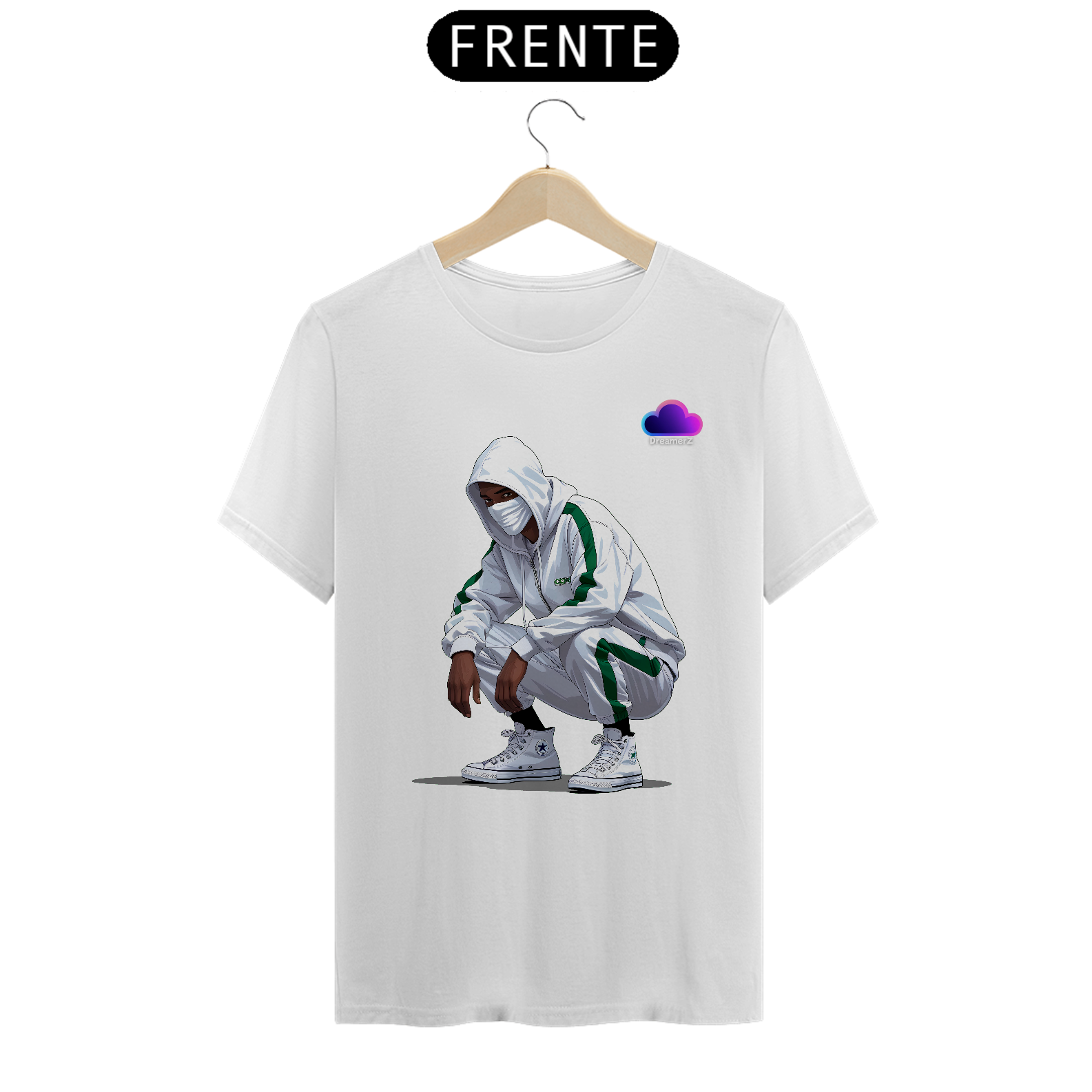 Com um look all white esportivo, traços de verde e aquele tênis que carrega respeito no calcanhar, o personagem dessa estampa representa o urbano moderno: discreto, ágil, e sempre preparado.