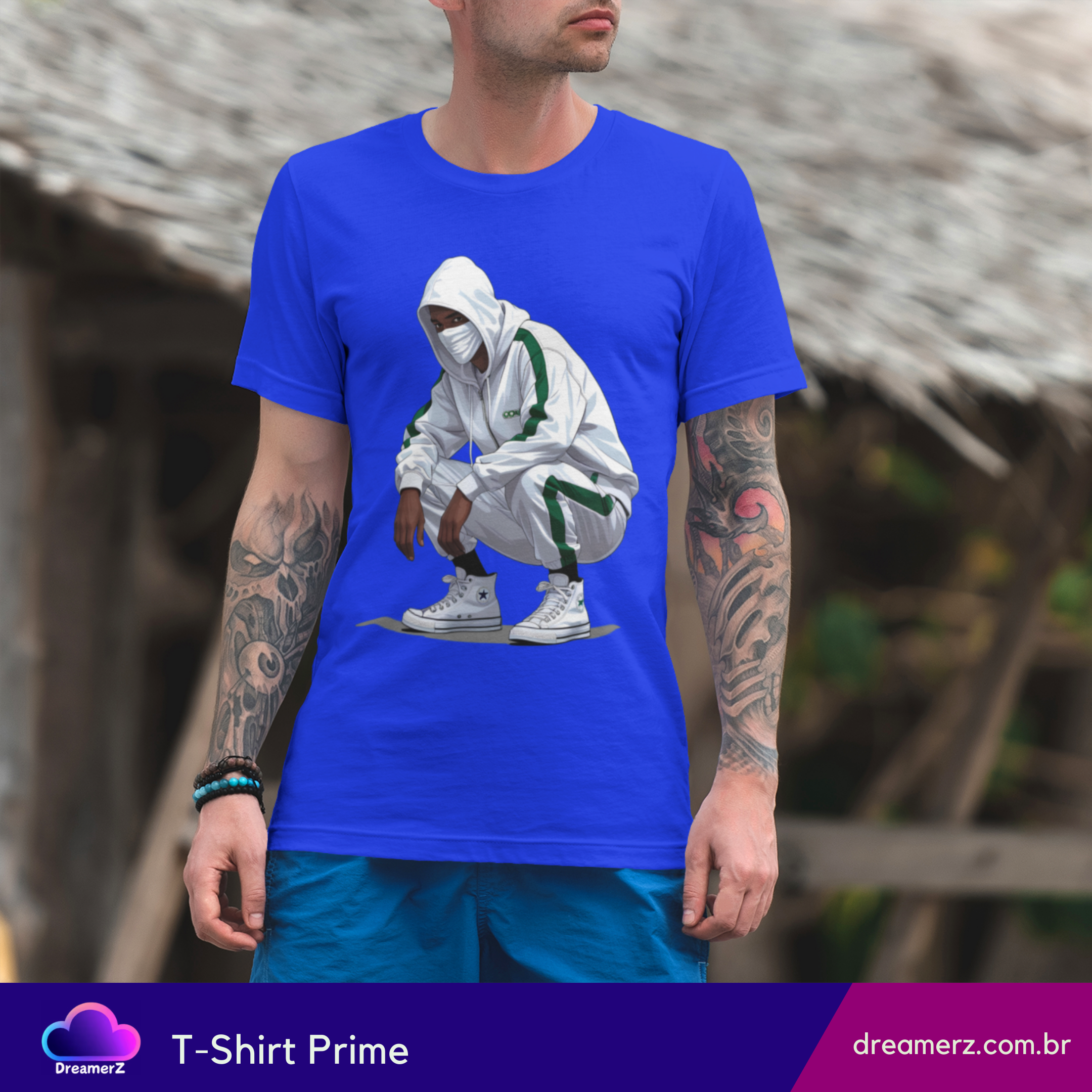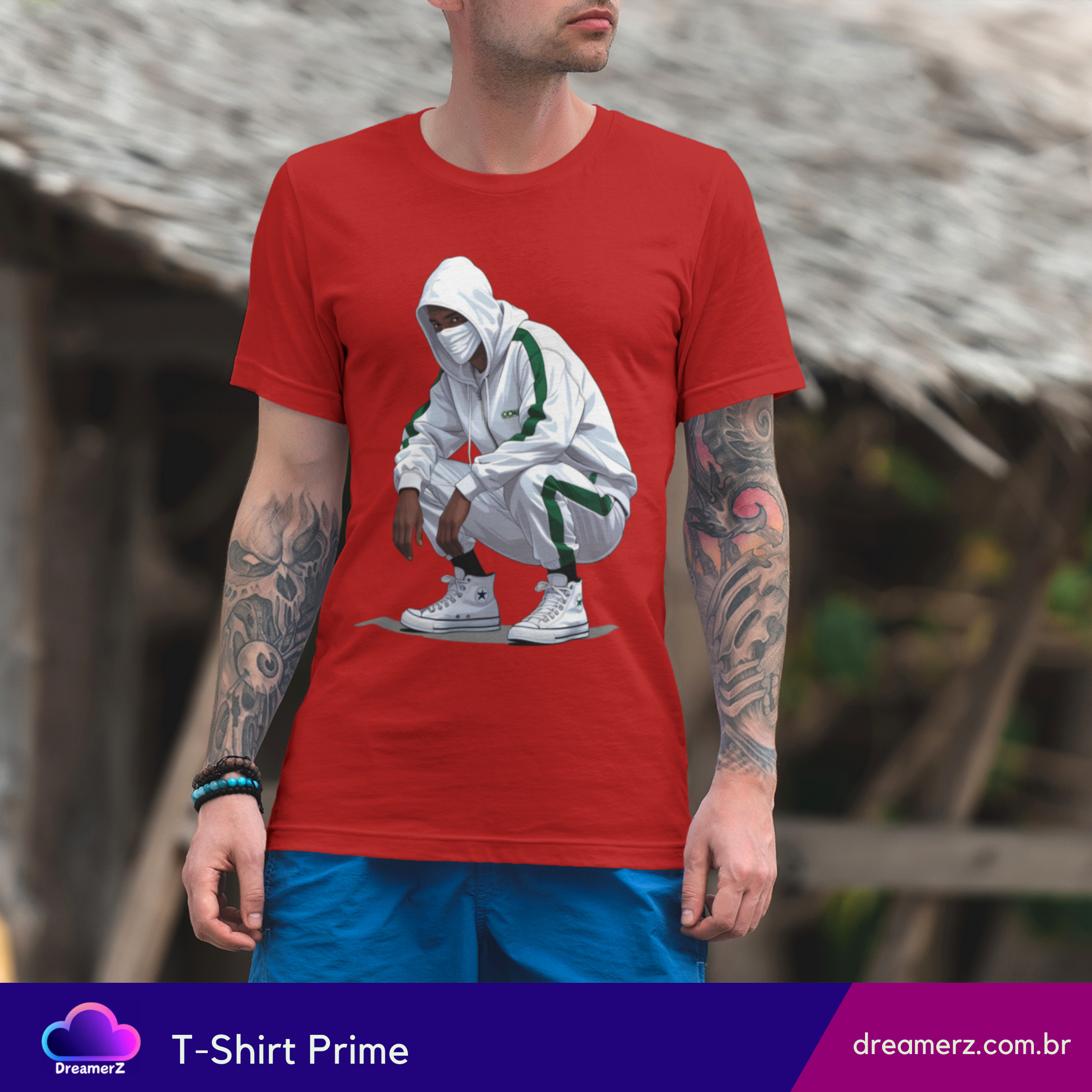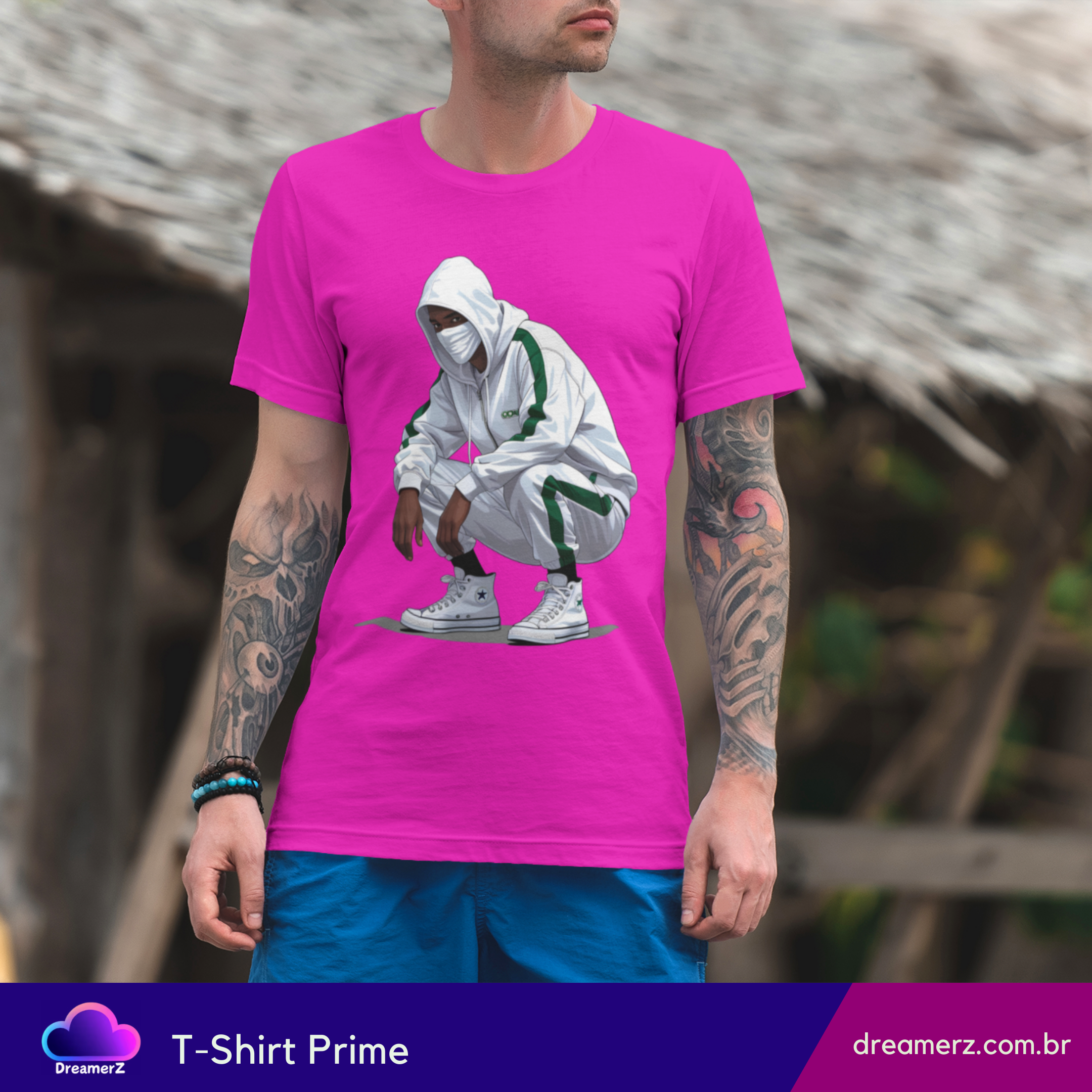 Com um look all white esportivo, traços de verde e aquele tênis que carrega respeito no calcanhar, o personagem dessa estampa representa o urbano moderno: discreto, ágil, e sempre preparado.