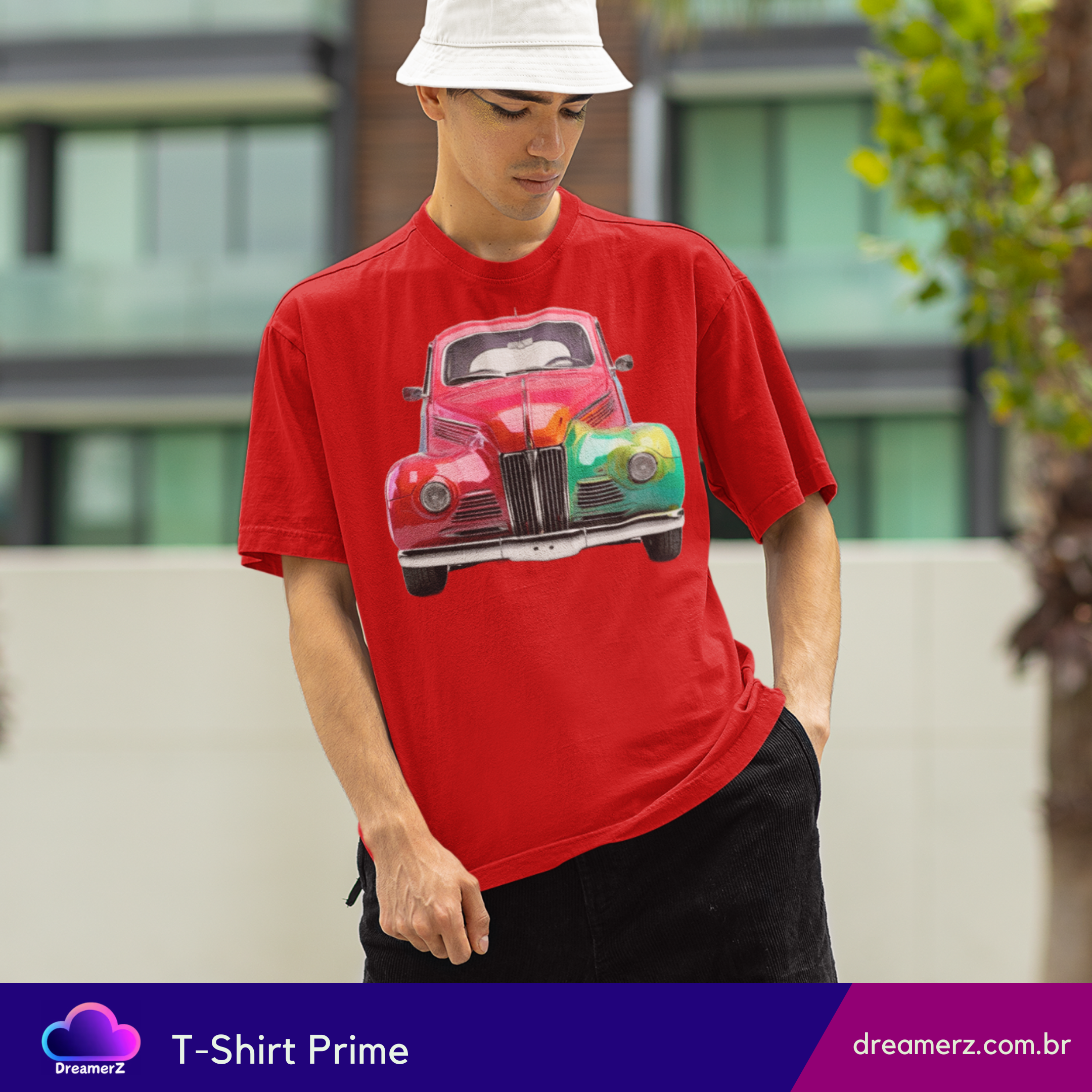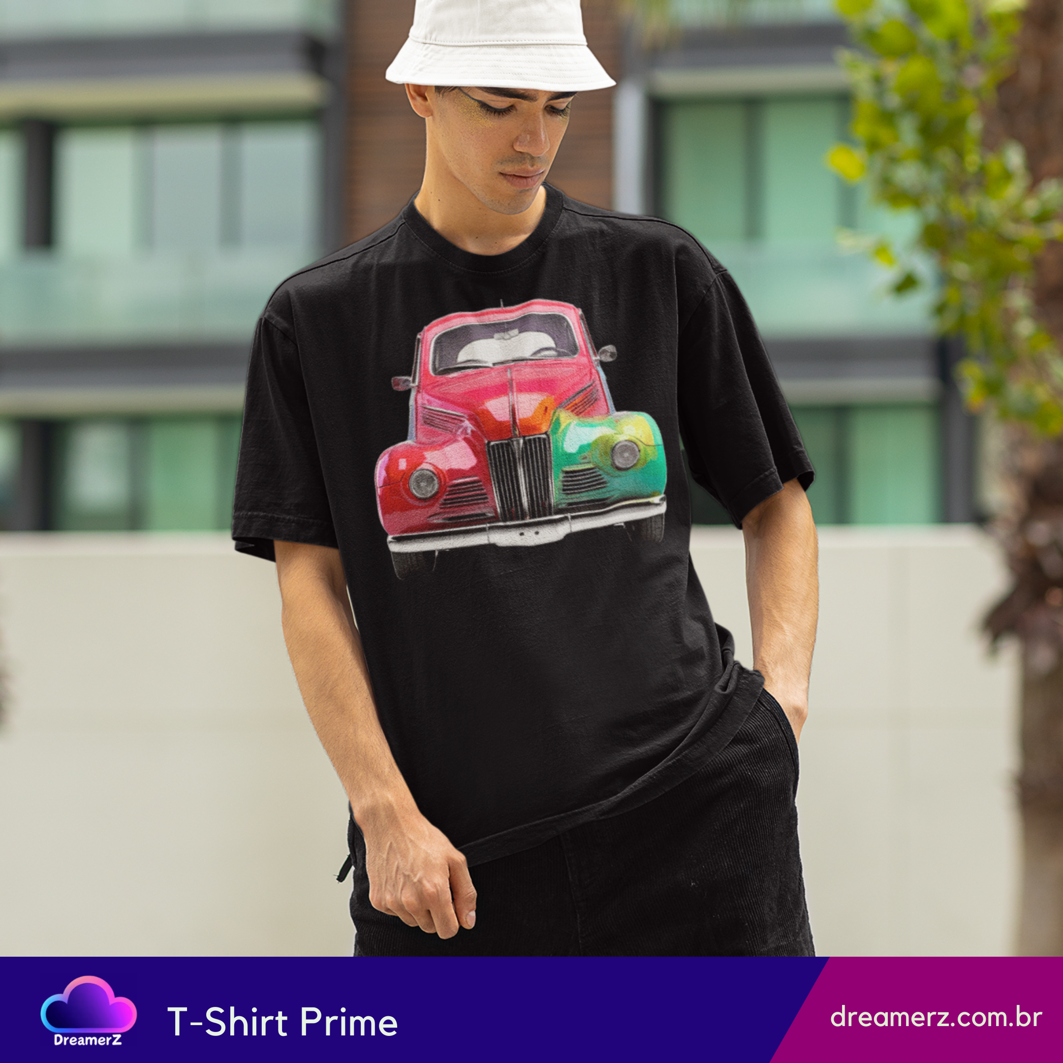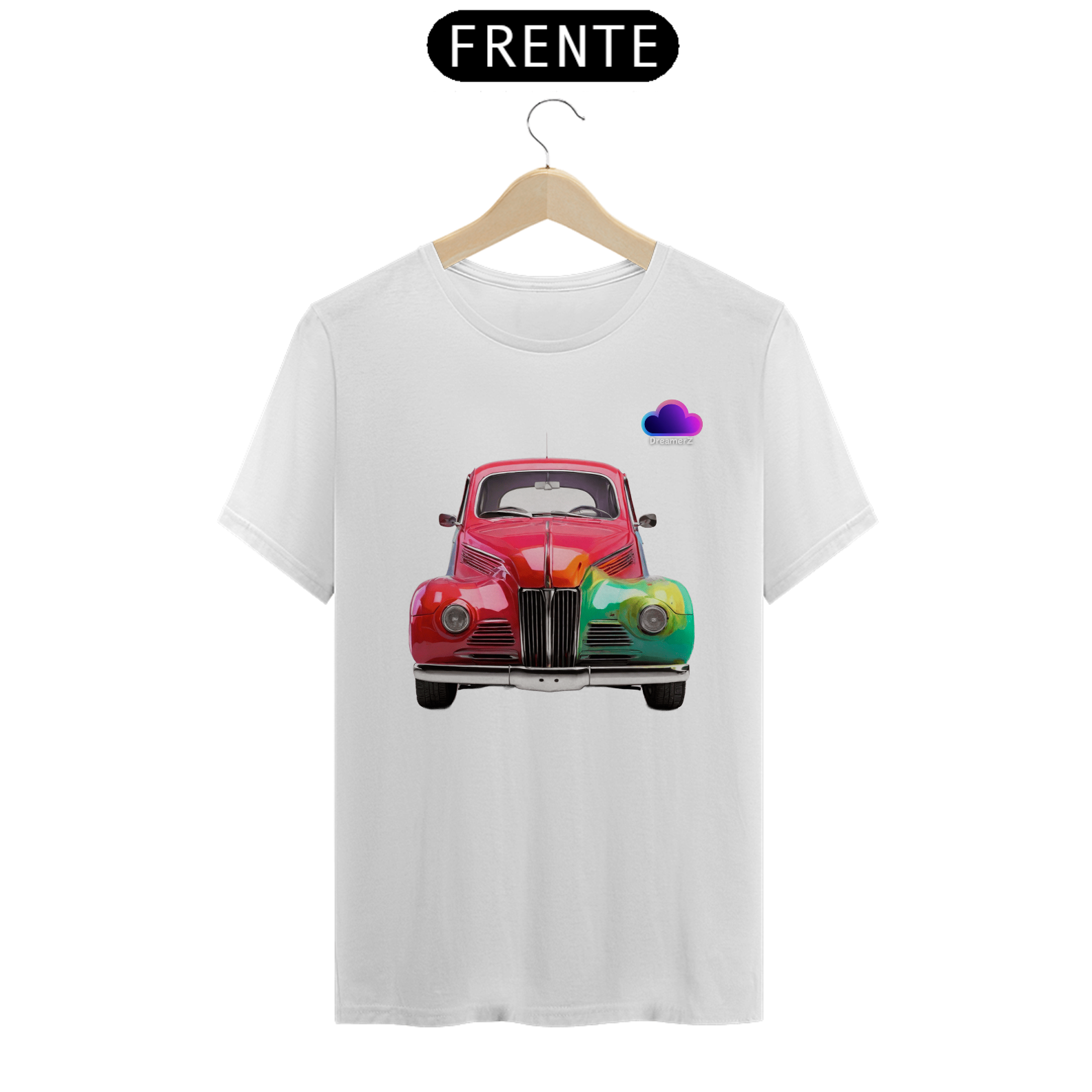 Essa camiseta traz um carro antigo estilizado com efeito arco-íris, perfeito pra quem ama o charme vintage e a vibe vibrante da arte urbana.