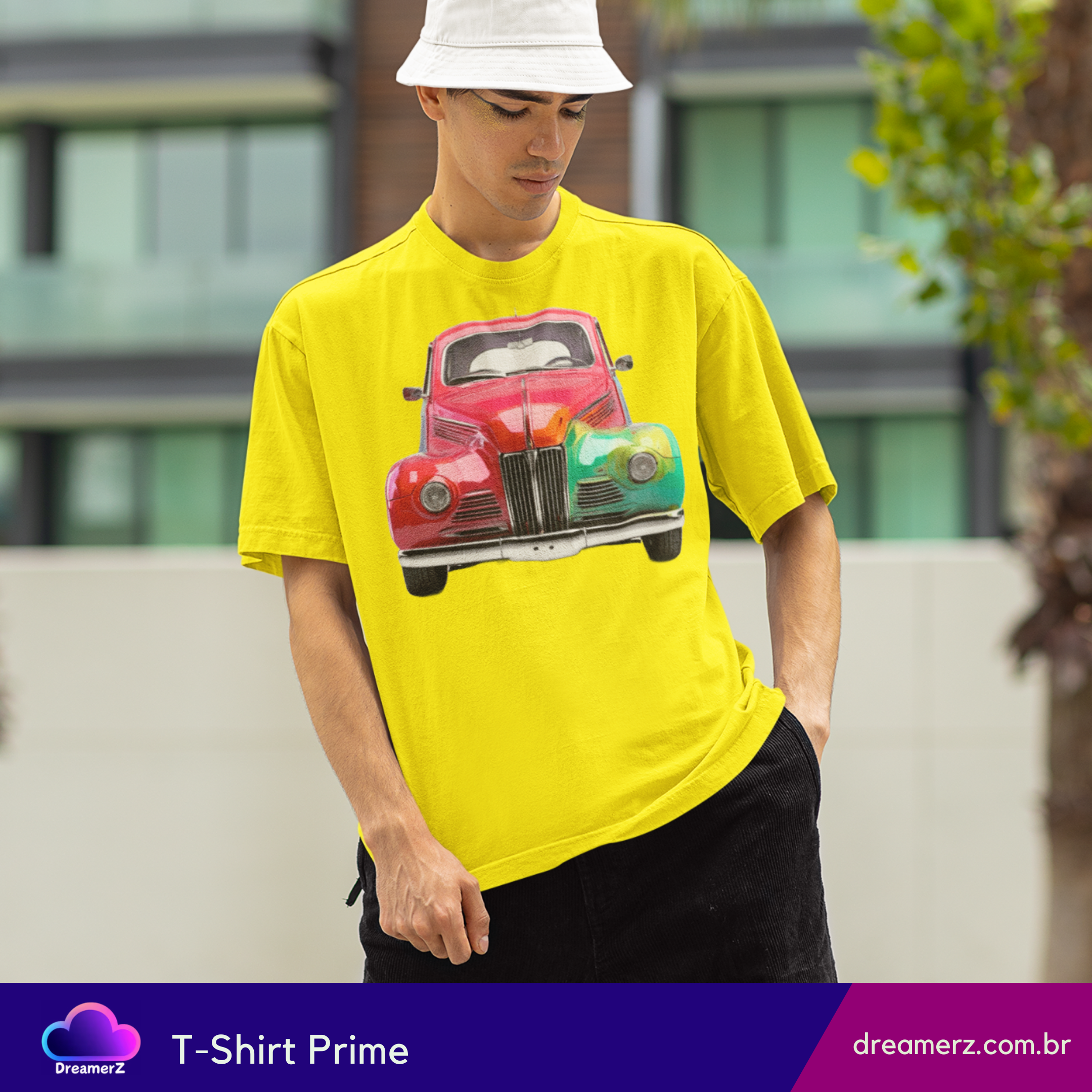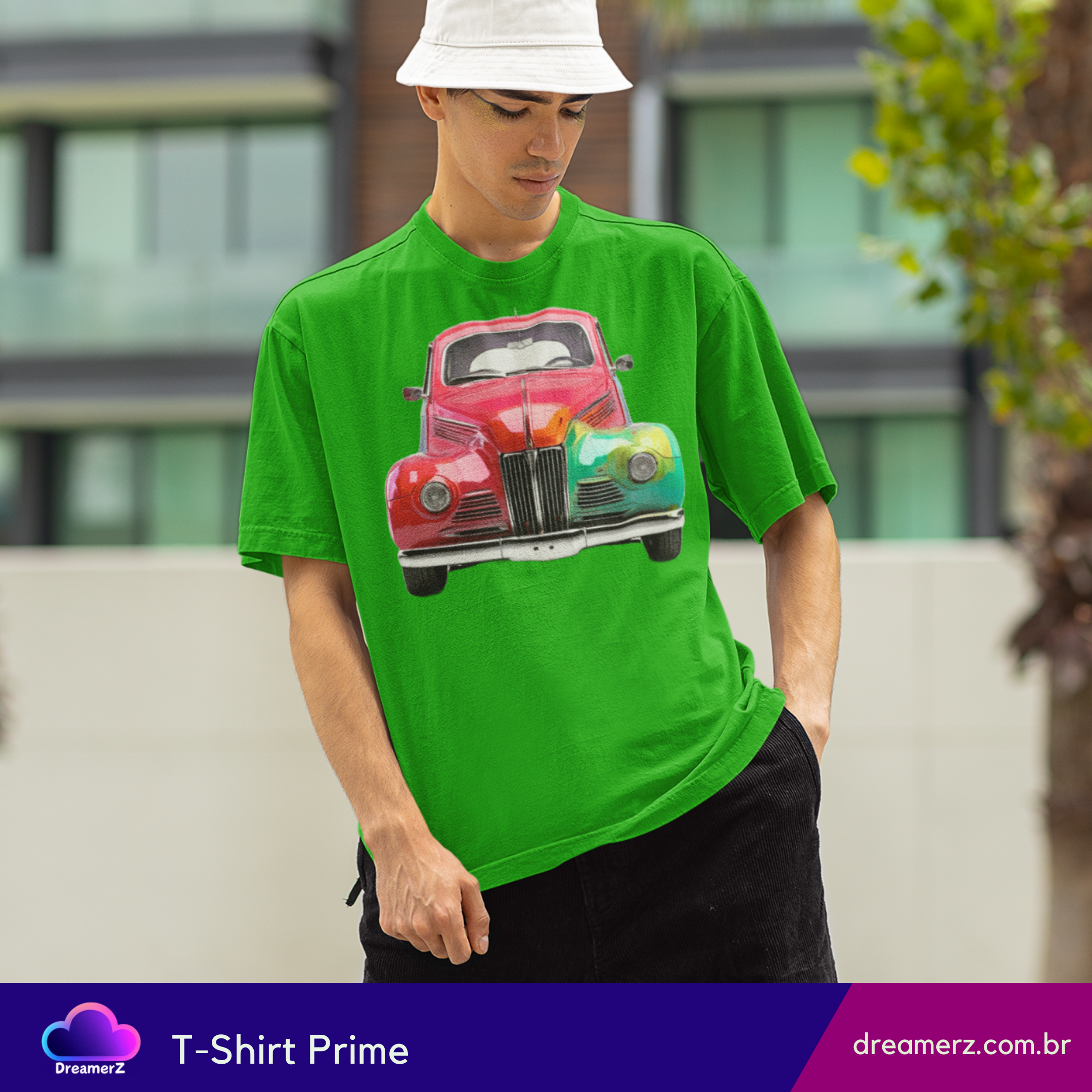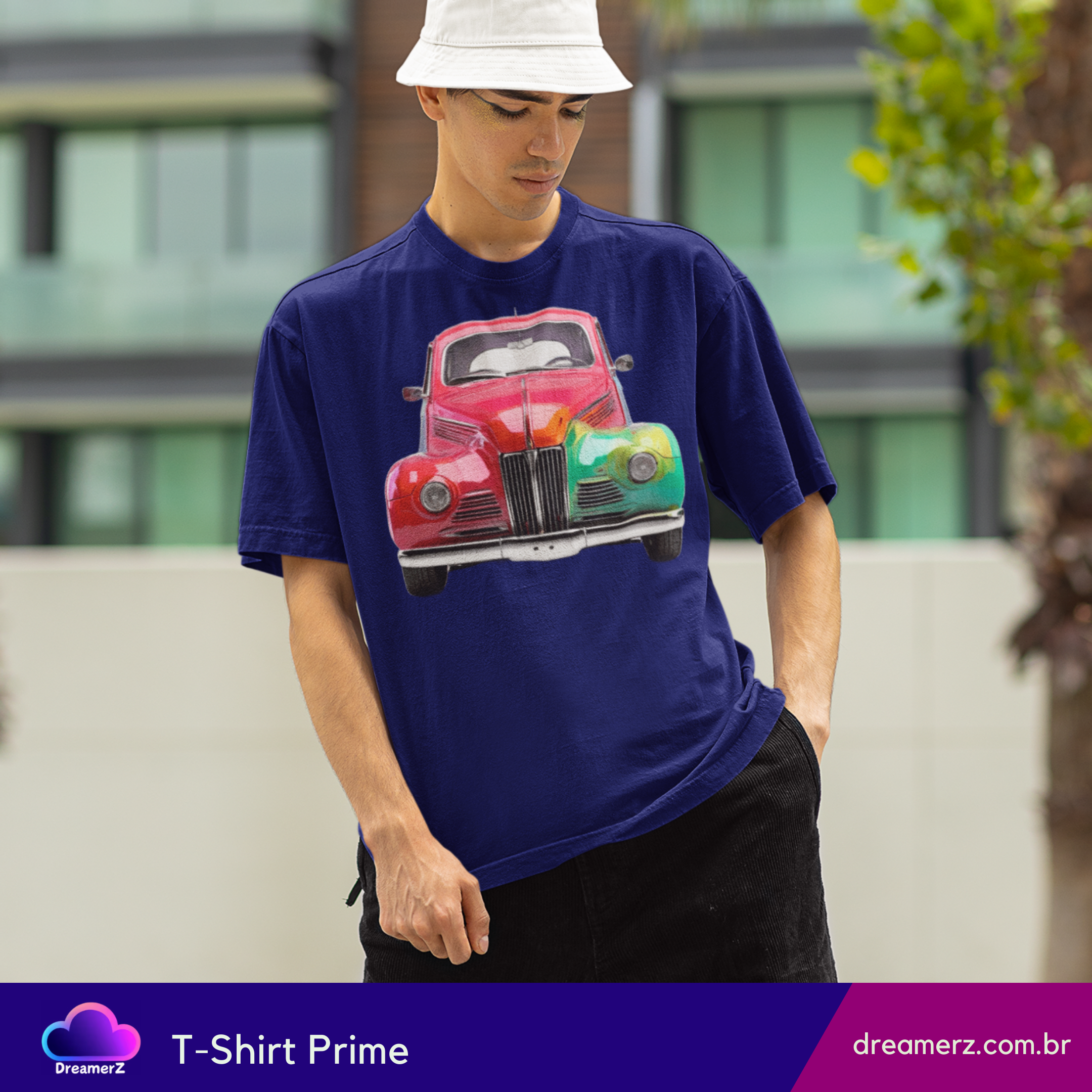 Essa camiseta traz um carro antigo estilizado com efeito arco-íris, perfeito pra quem ama o charme vintage e a vibe vibrante da arte urbana.