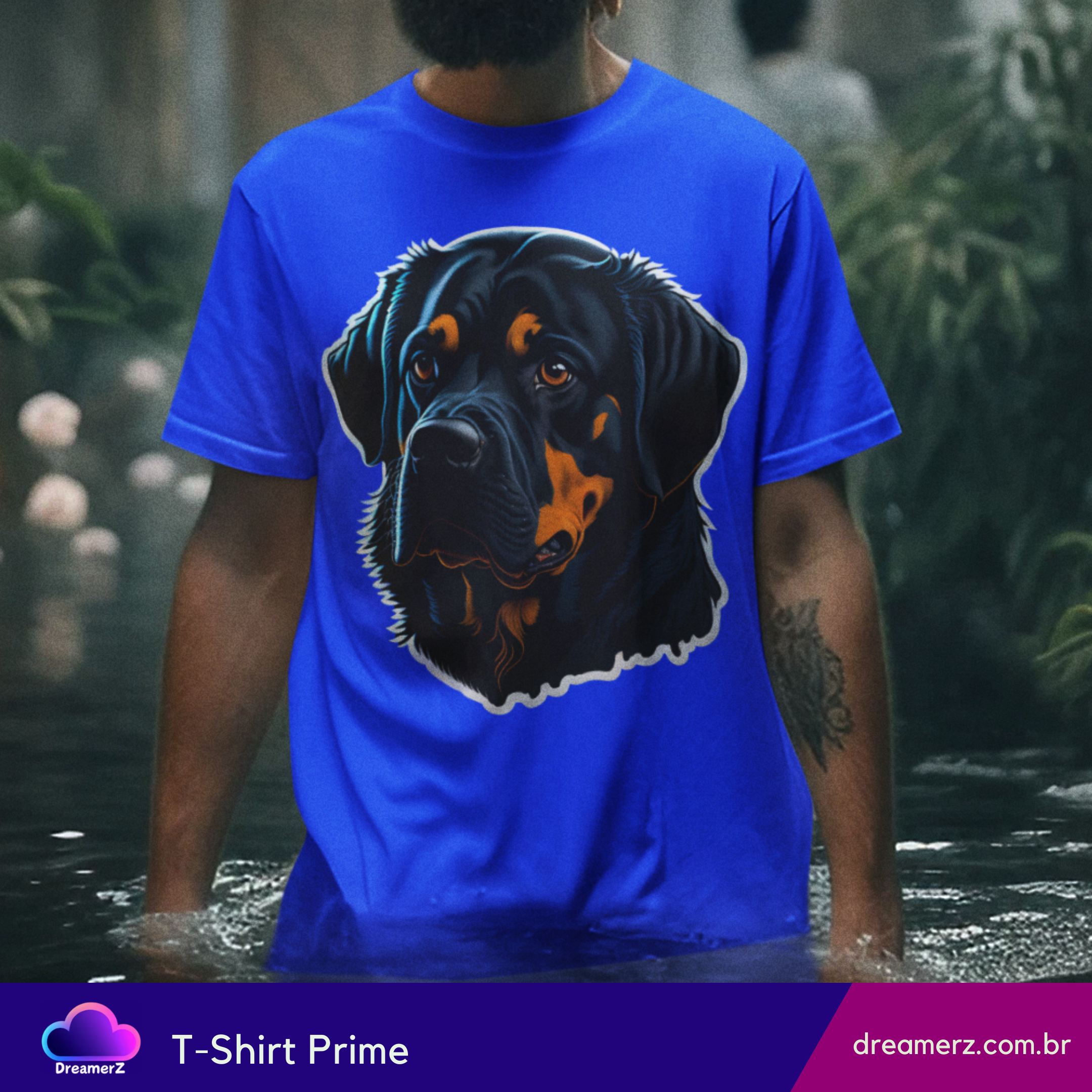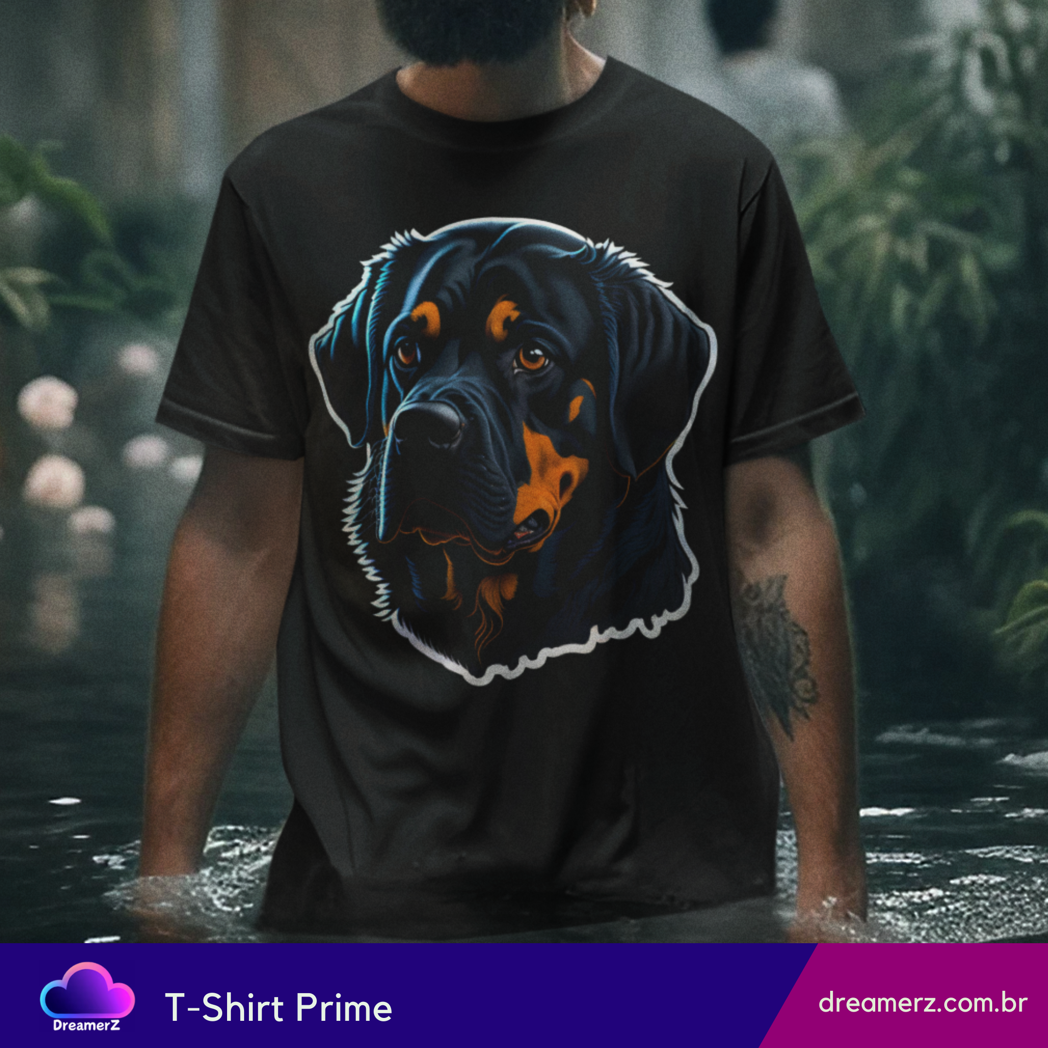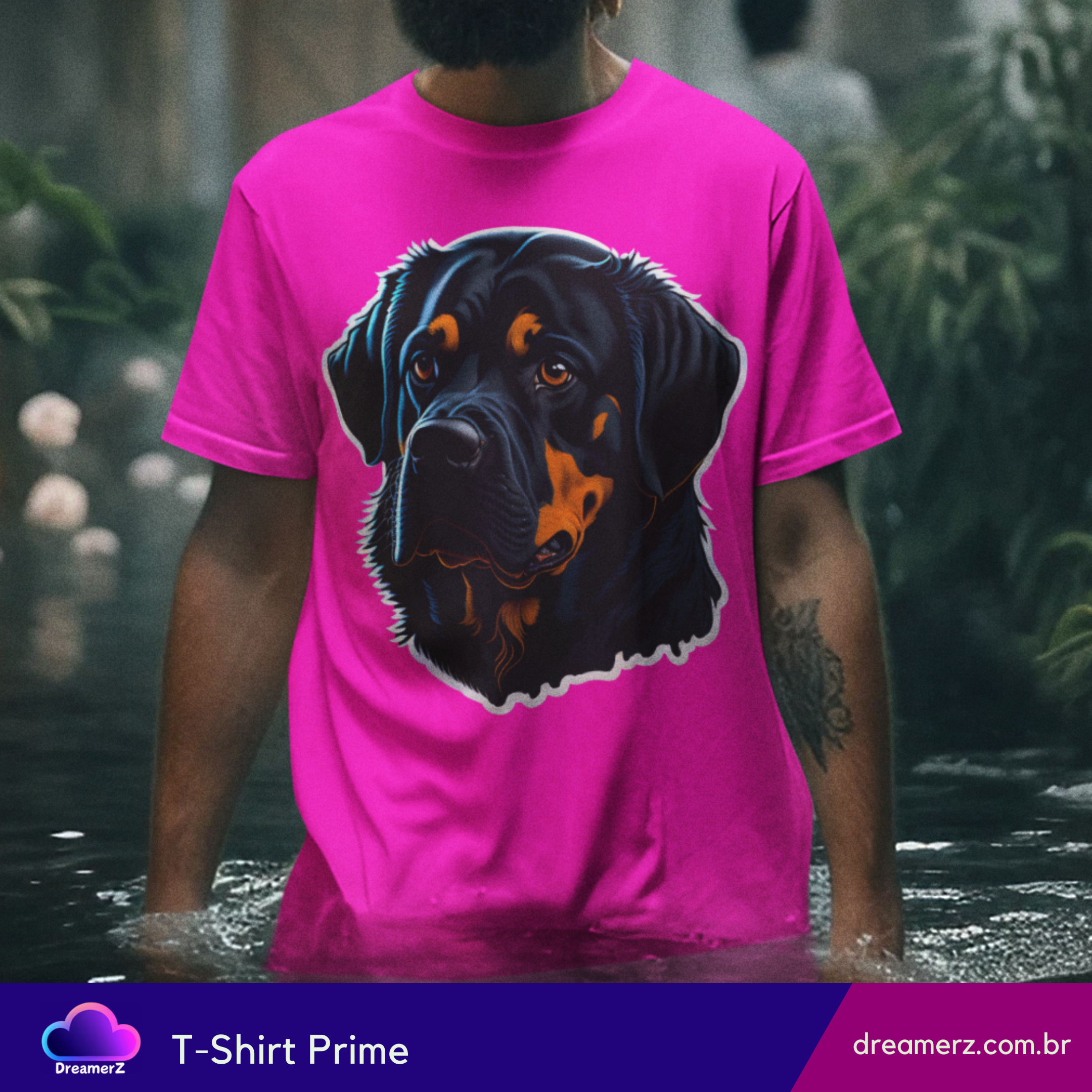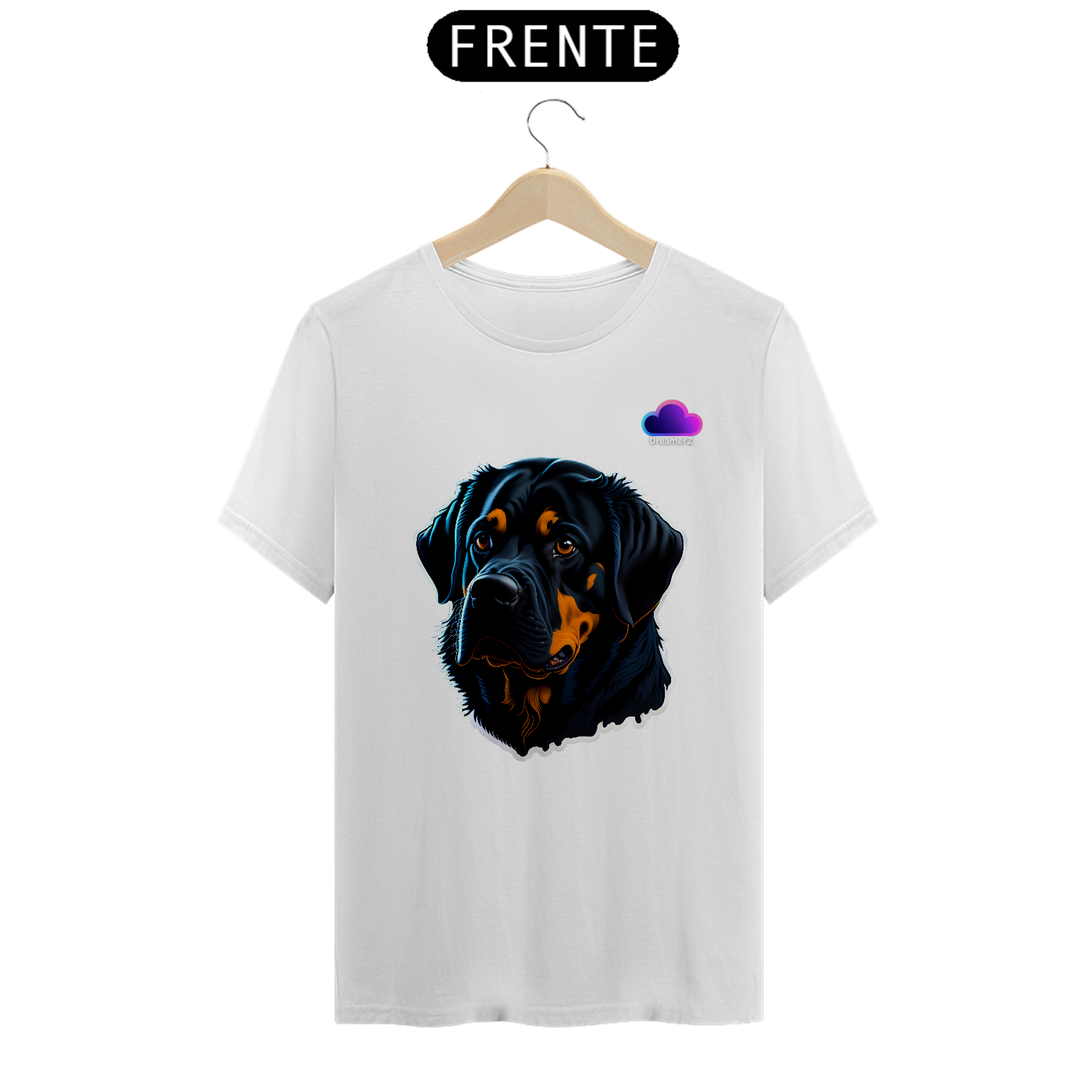Estampando força e afeto no mesmo olhar, essa camiseta traz o clássico rottweiler com um toque artístico vibrante. Um design marcante para quem carrega o espírito protetor e o coração fiel desse ícone canino.