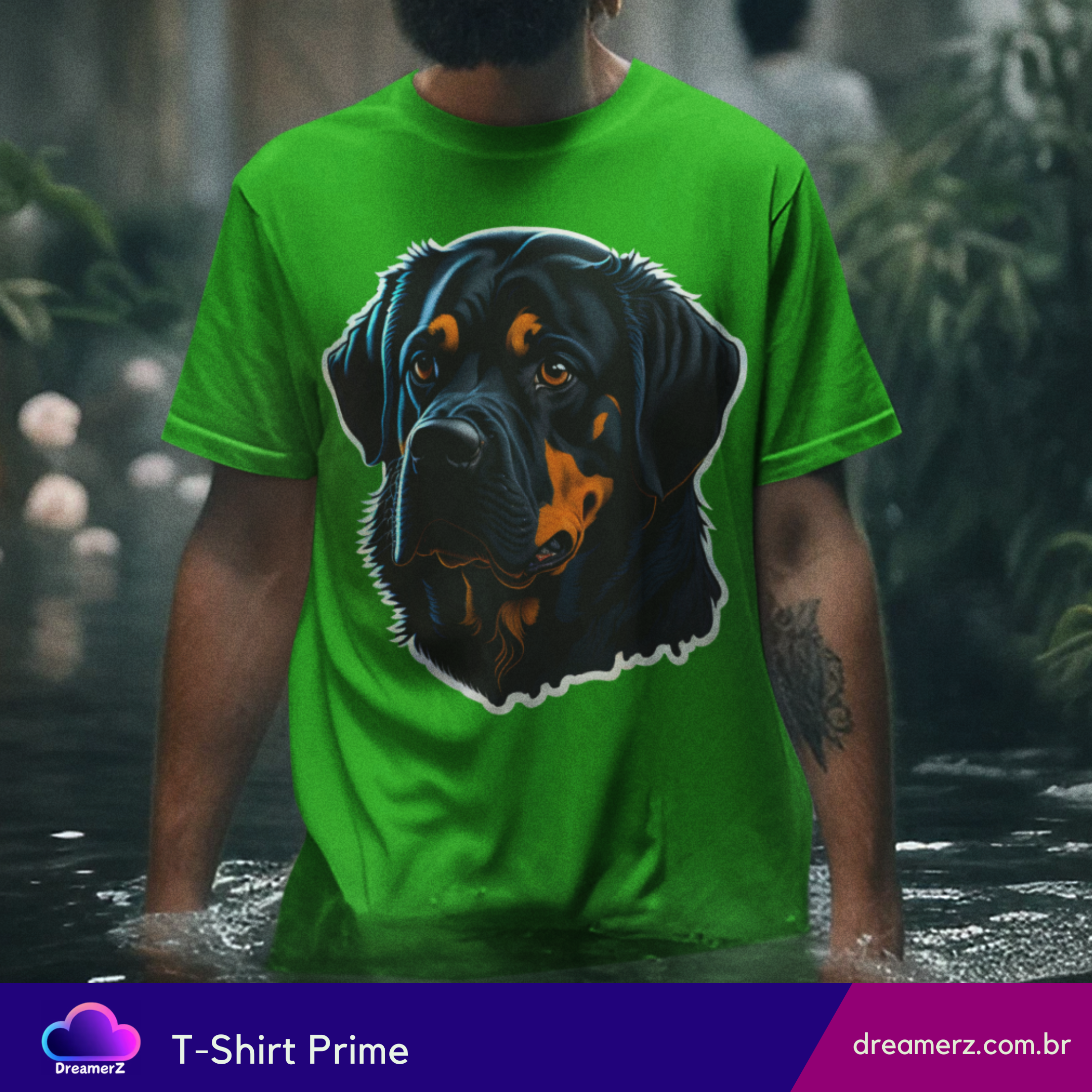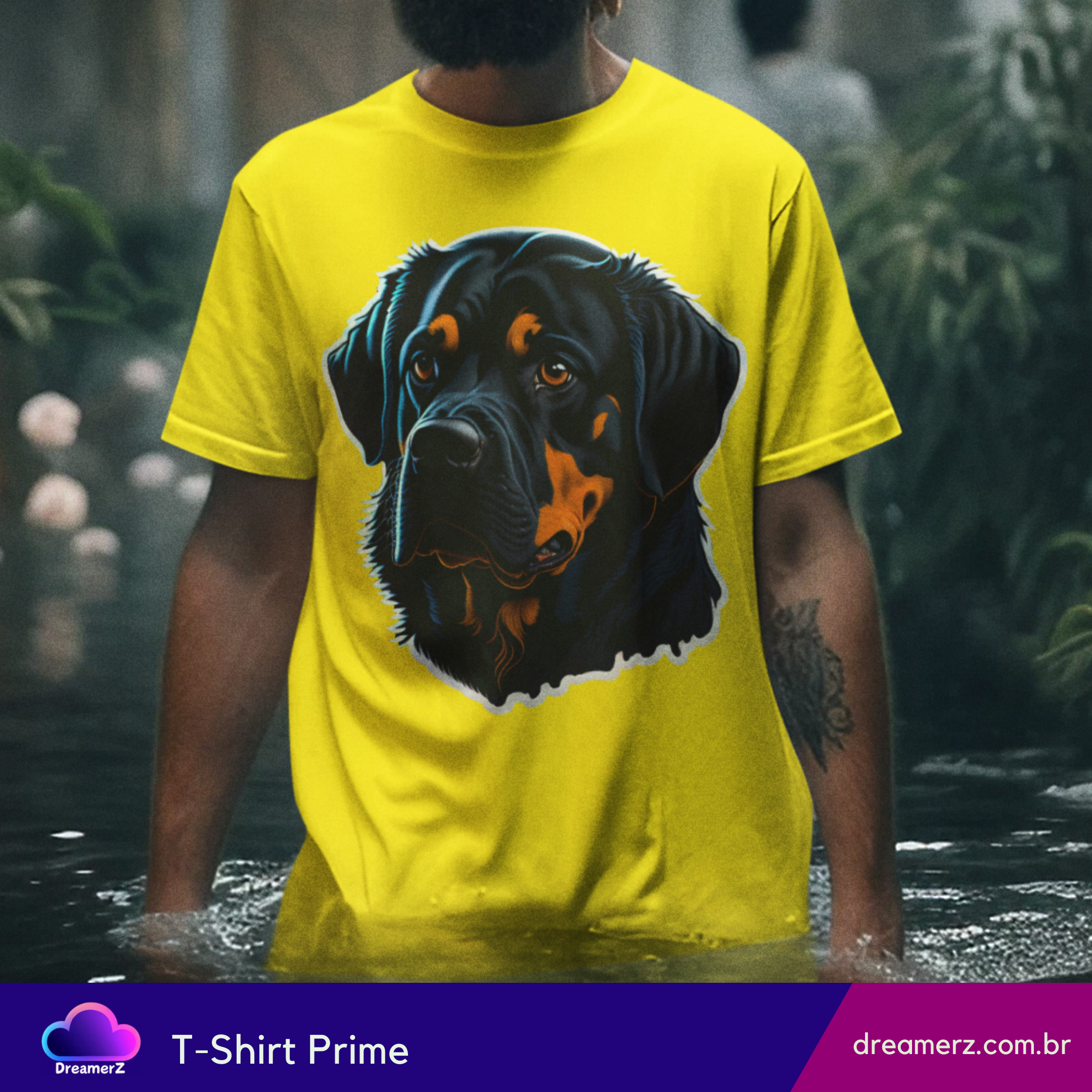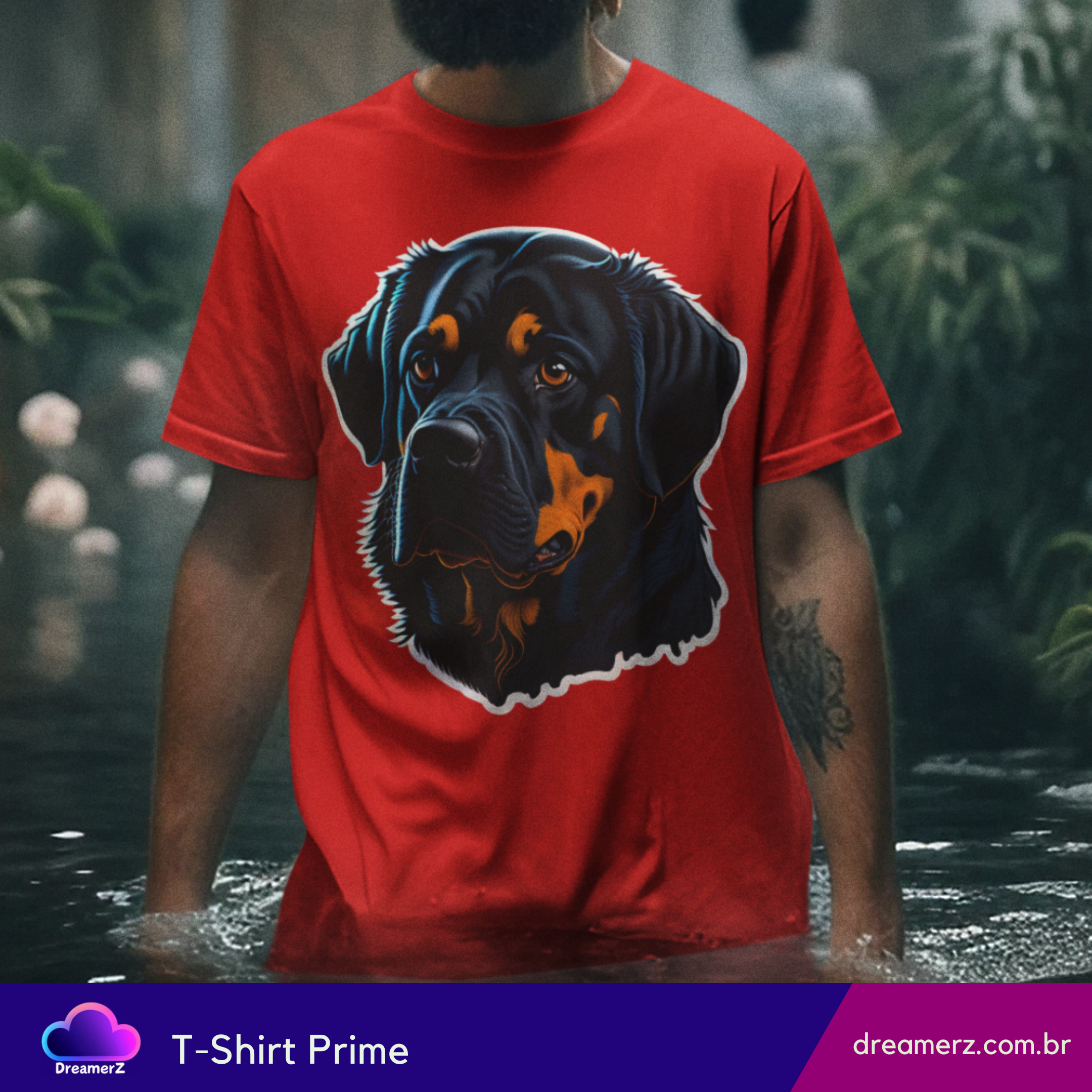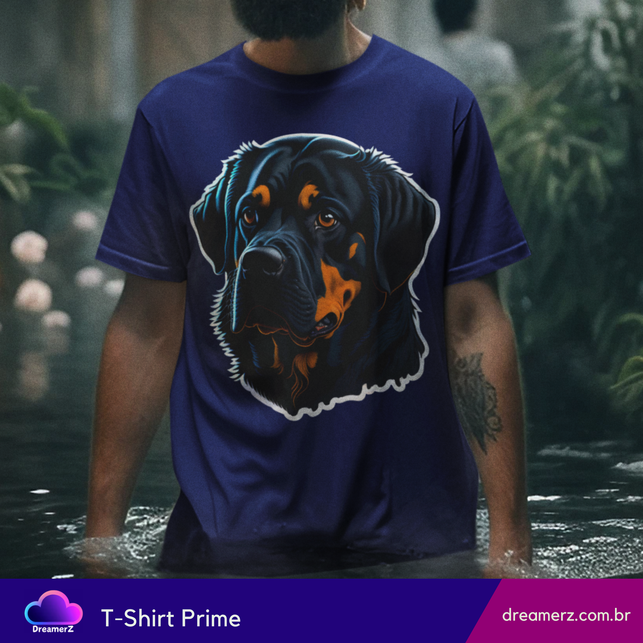 Estampando força e afeto no mesmo olhar, essa camiseta traz o clássico rottweiler com um toque artístico vibrante. Um design marcante para quem carrega o espírito protetor e o coração fiel desse ícone canino.