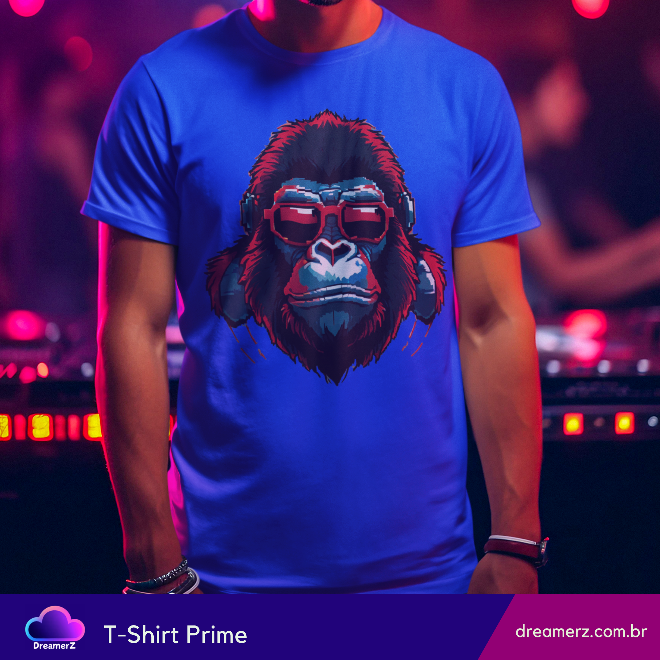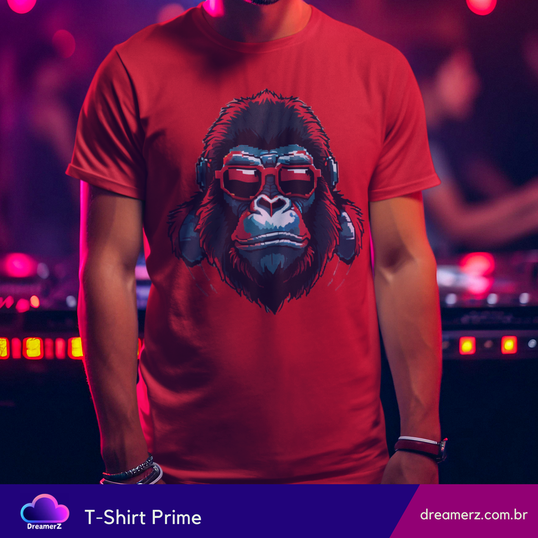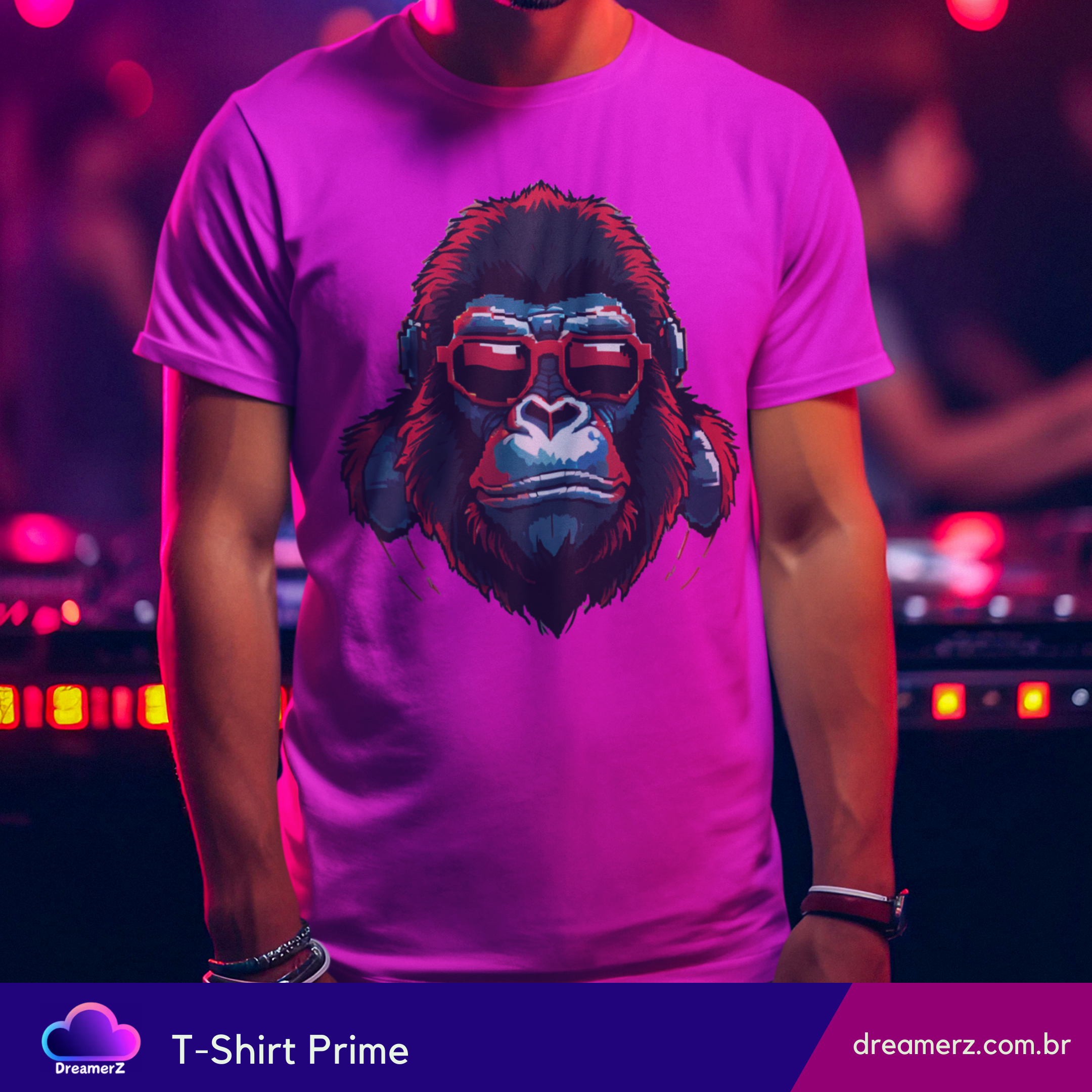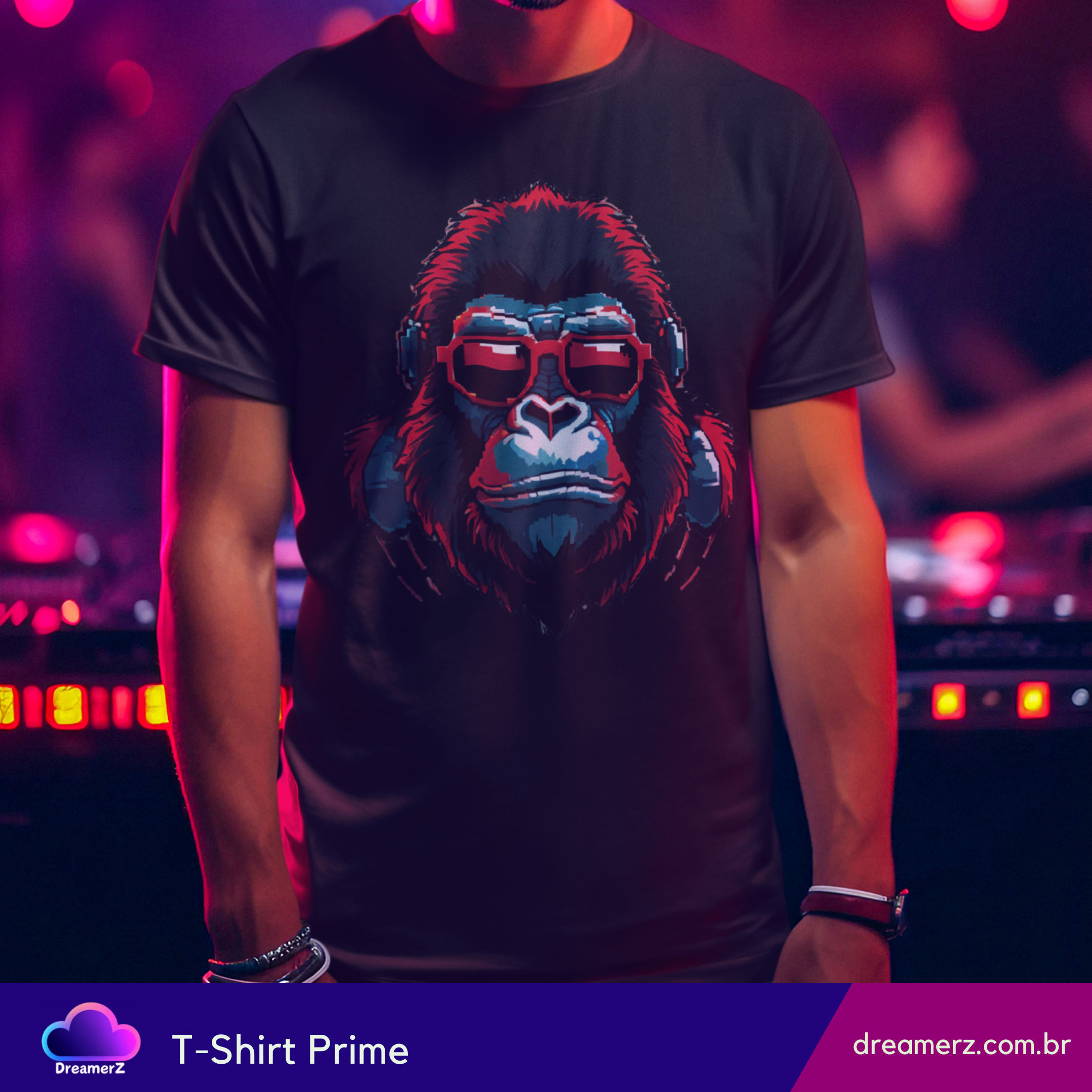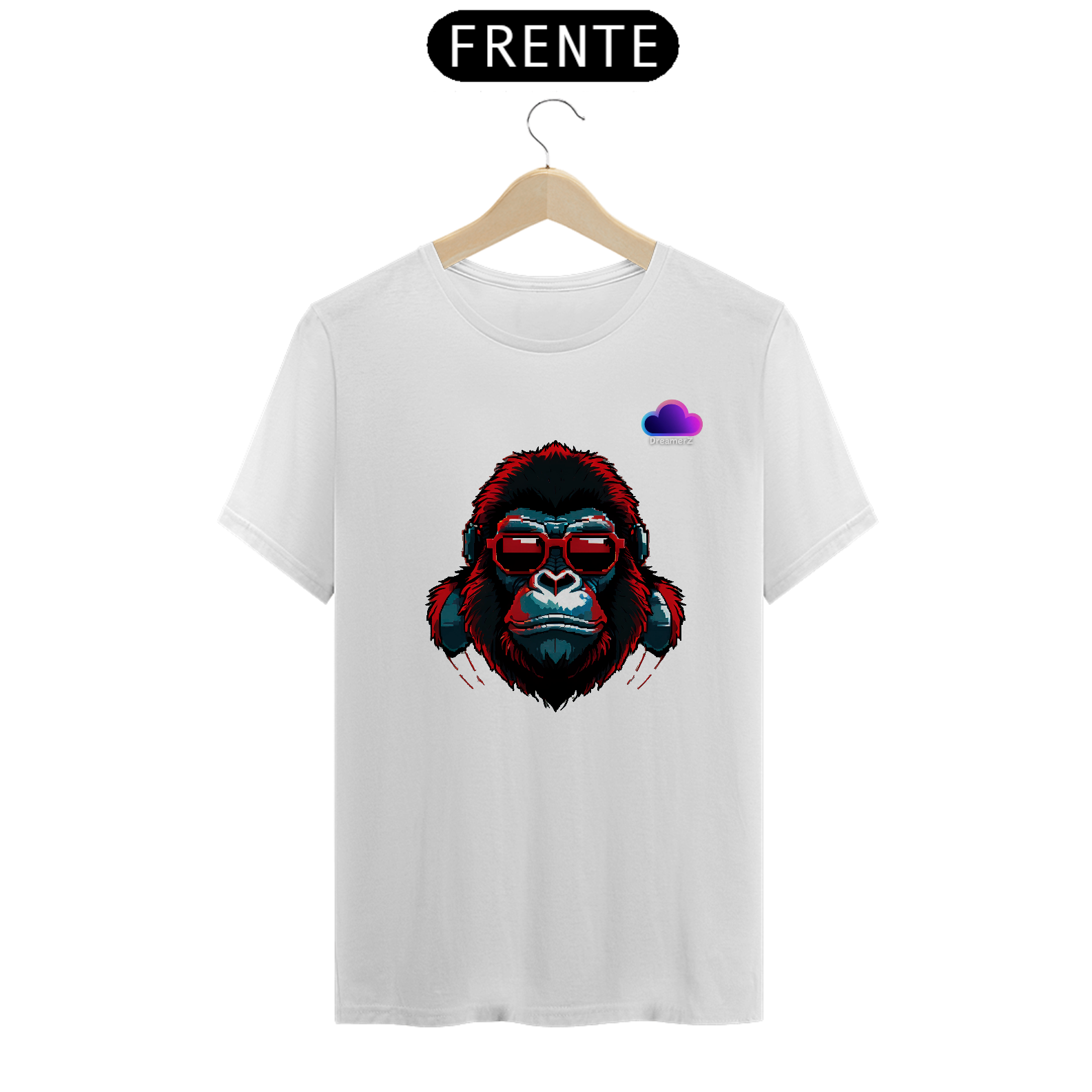 Essa estampa é puro charme rebelde! Um gorila estilizado com óculos escuros e fones de ouvido traz a vibe perfeita entre o mundo animal e o universo urbano da música.