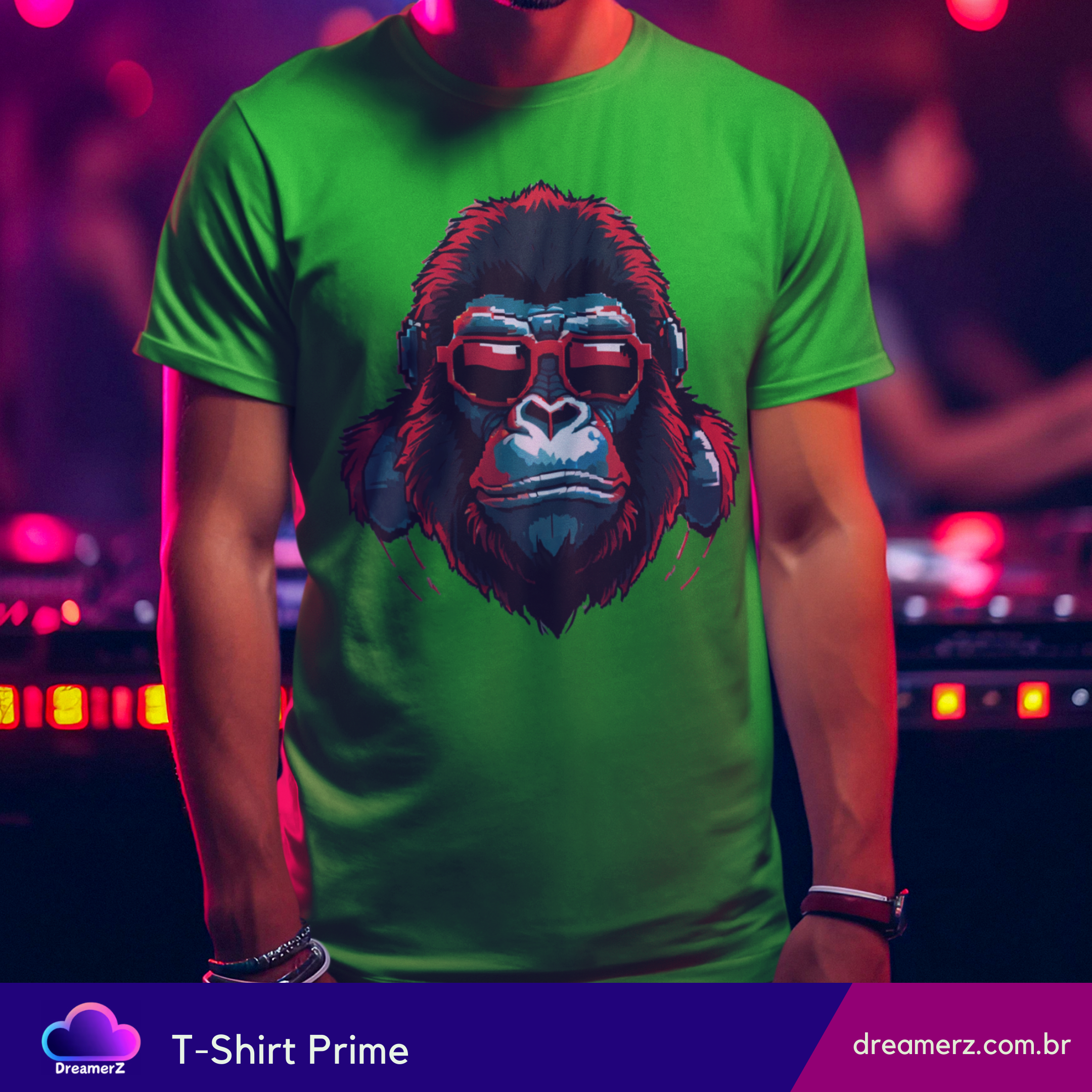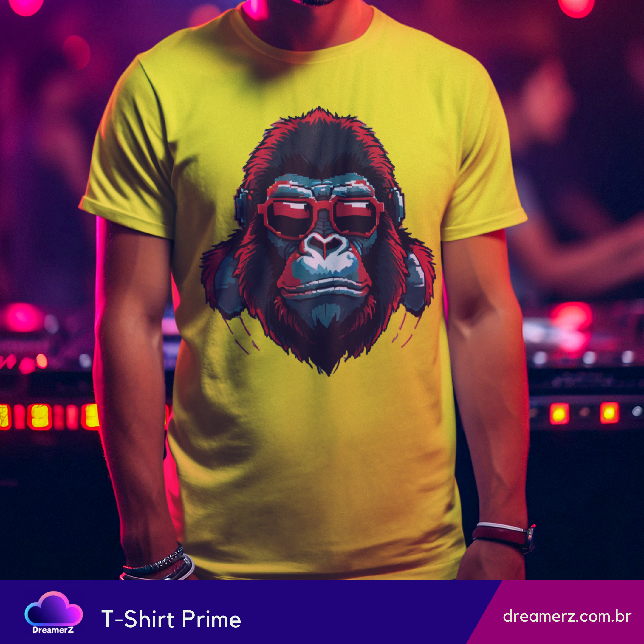 Estampa vibrante de gorila com fones e óculos