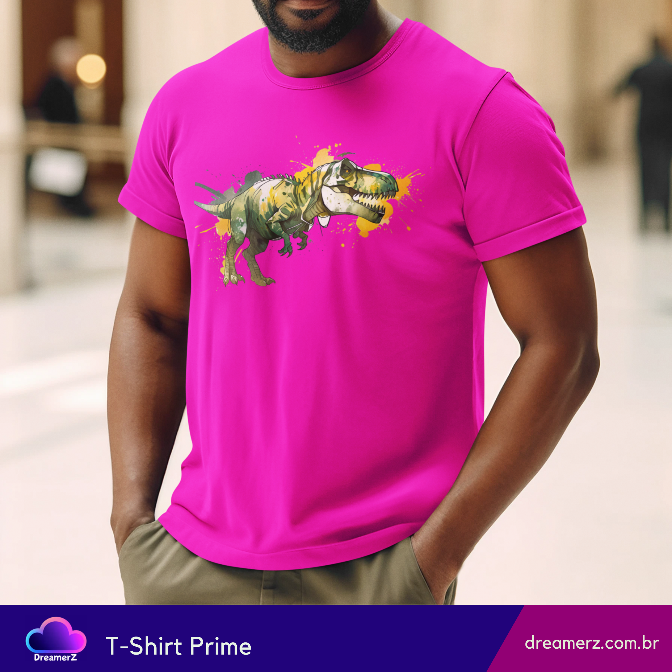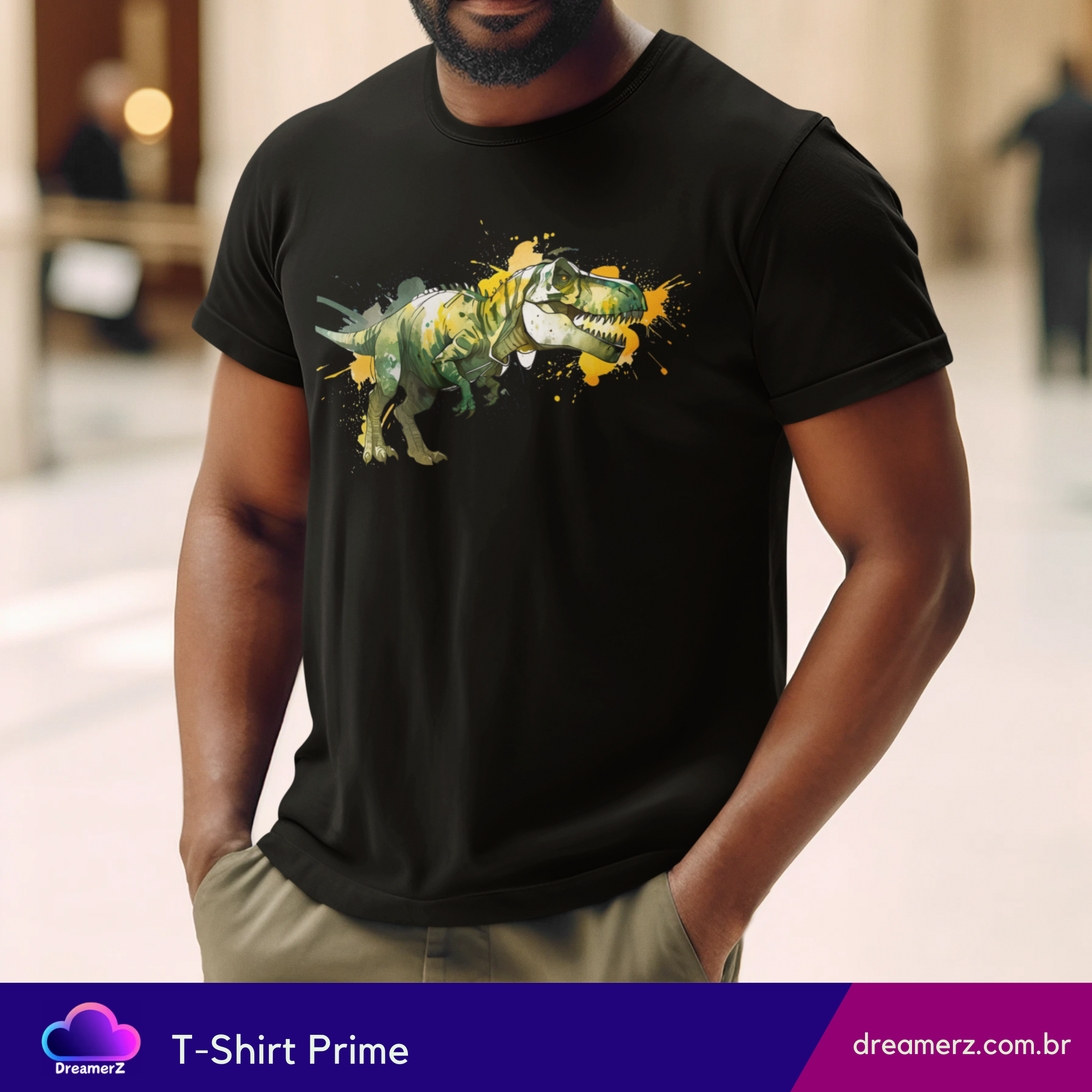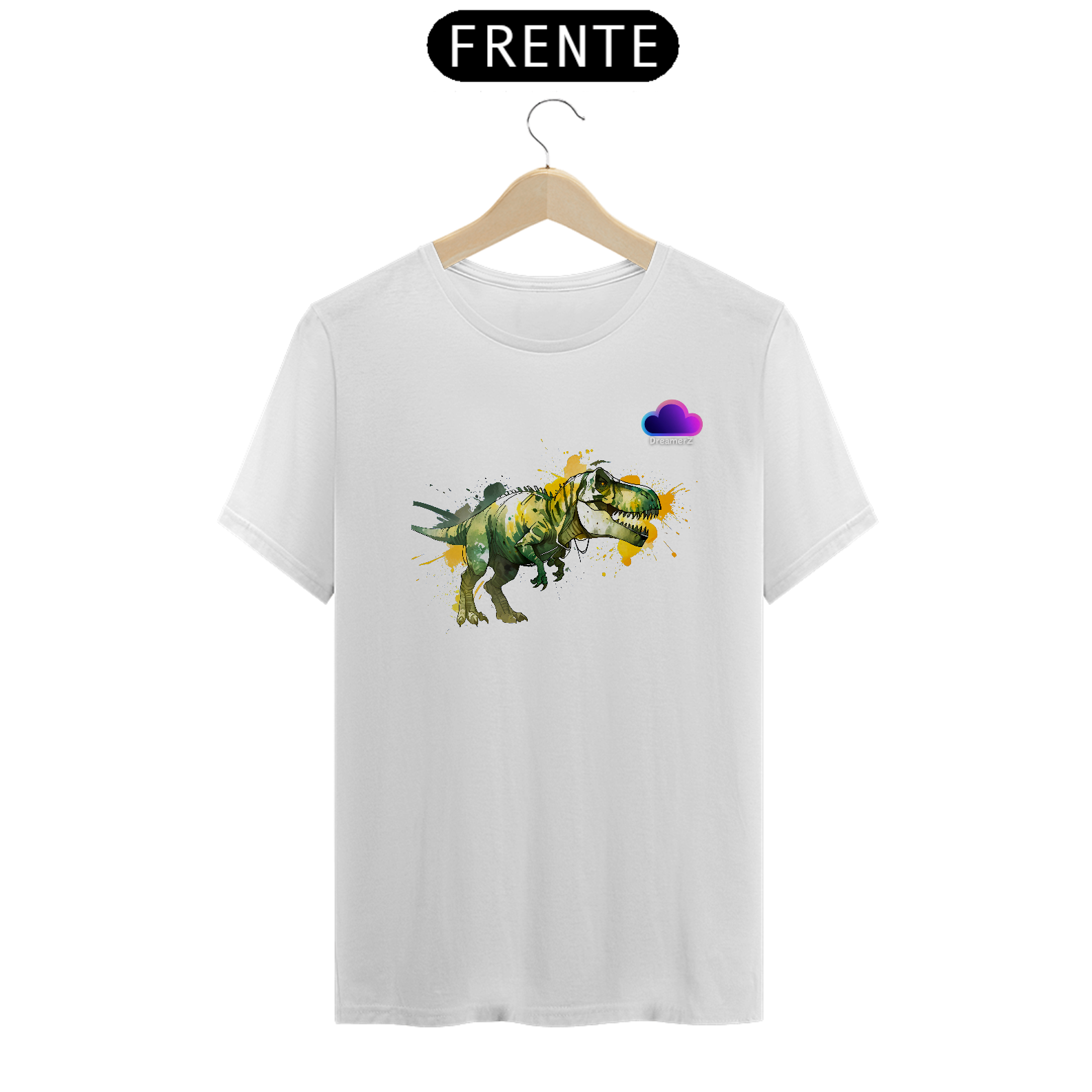 Solte o rugido do seu estilo com essa estampa vibrante de um T-Rex selvagem, em traços artísticos e respingos de tinta que dão vida e movimento à peça.