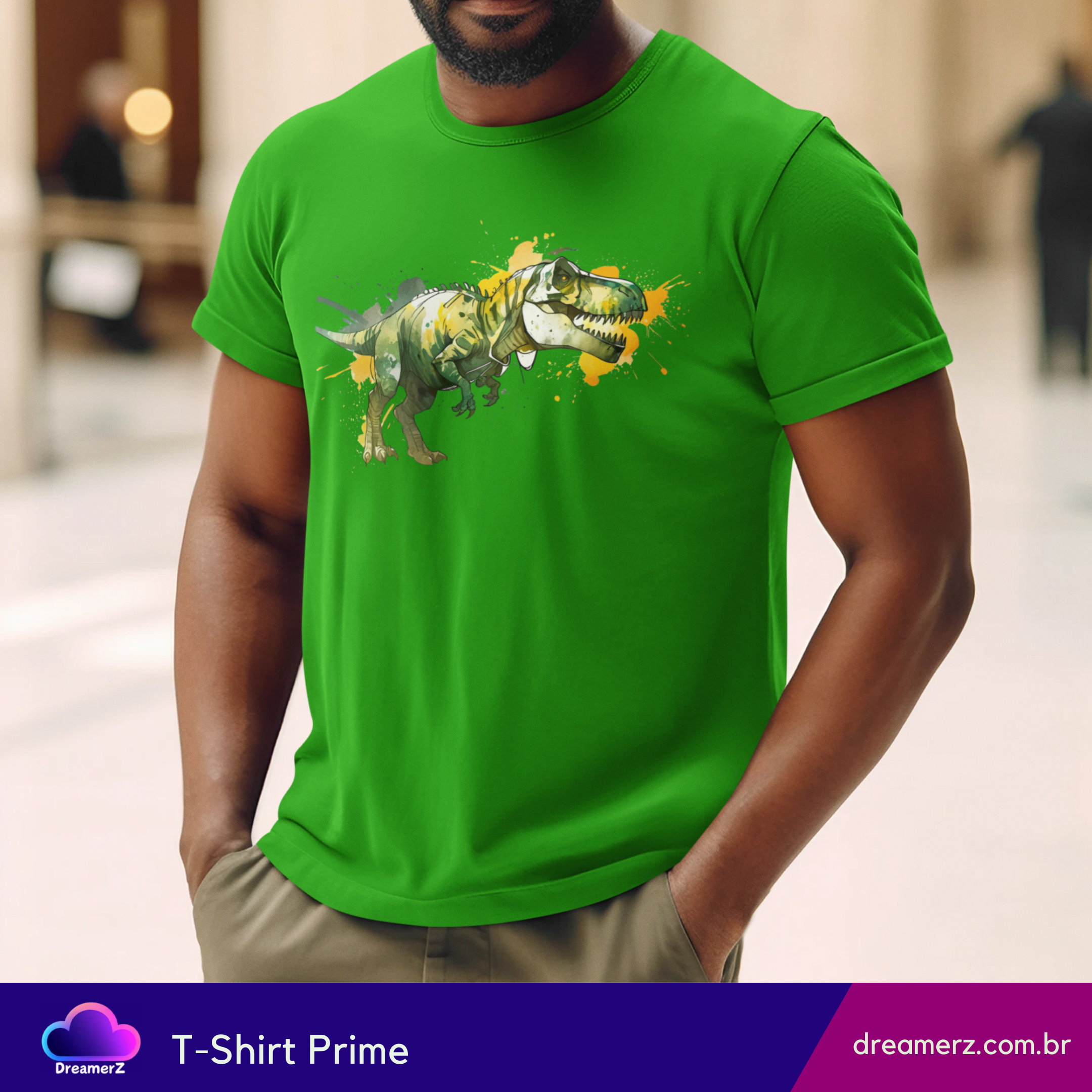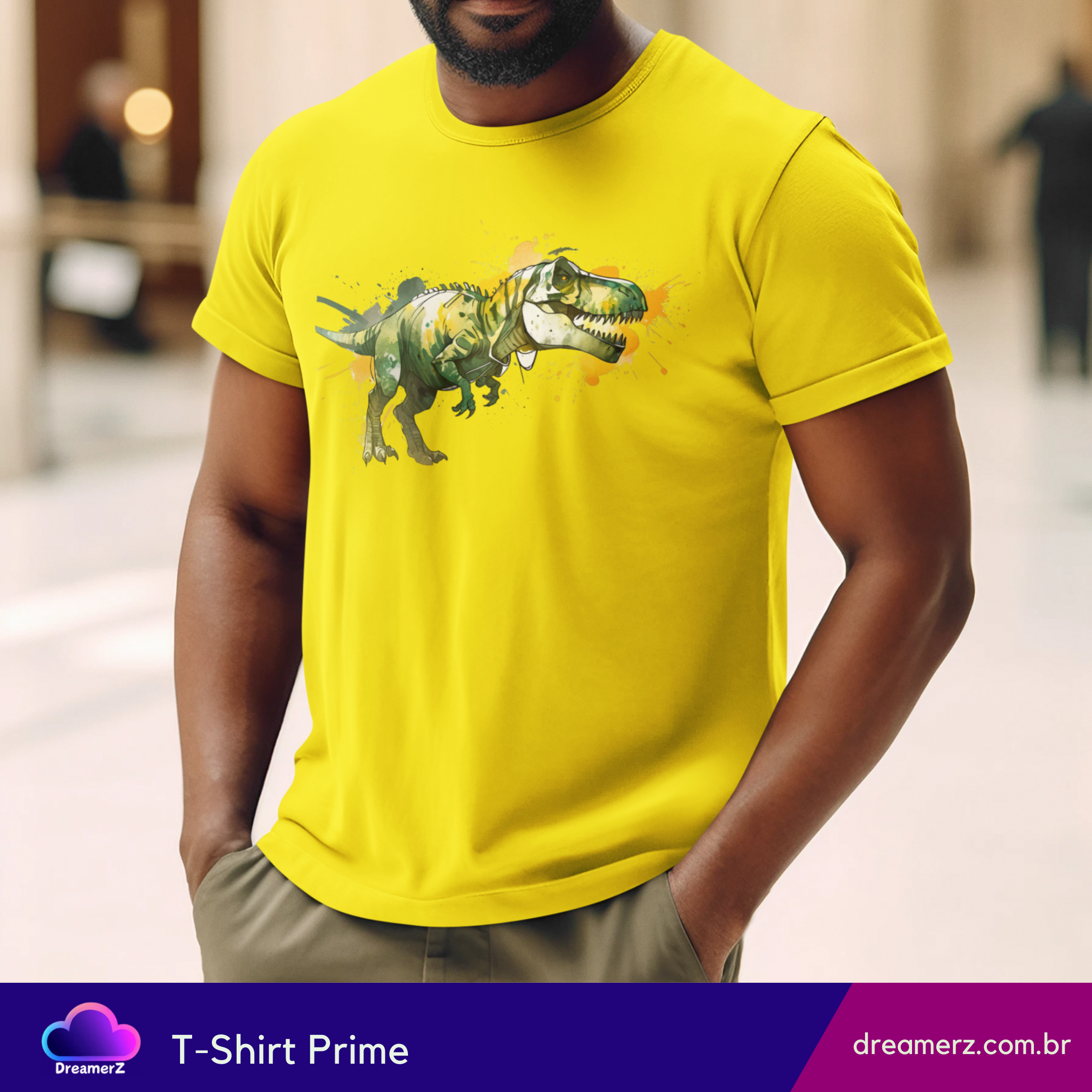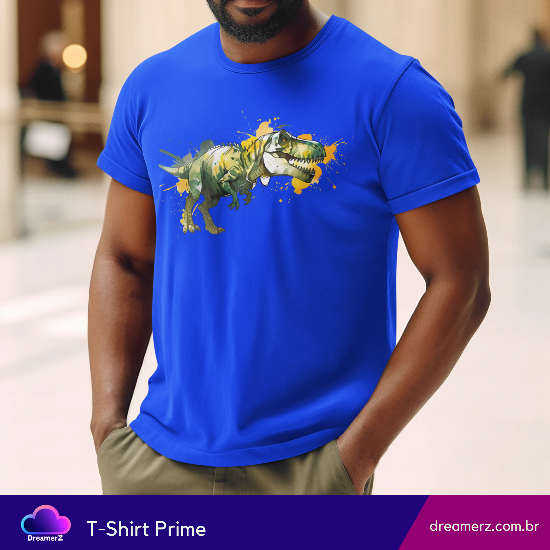 Solte o rugido do seu estilo com essa estampa vibrante de um T-Rex selvagem, em traços artísticos e respingos de tinta que dão vida e movimento à peça.
